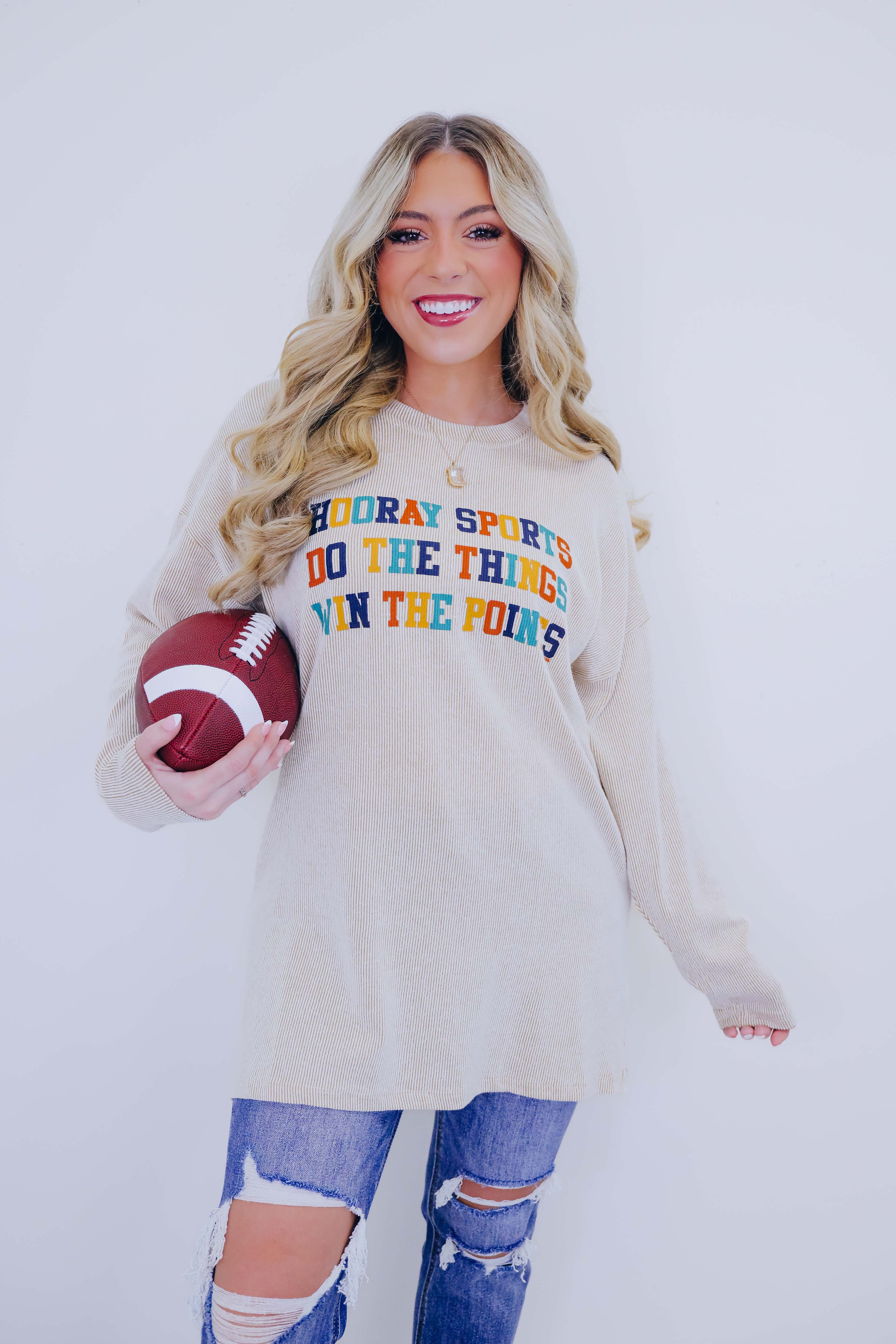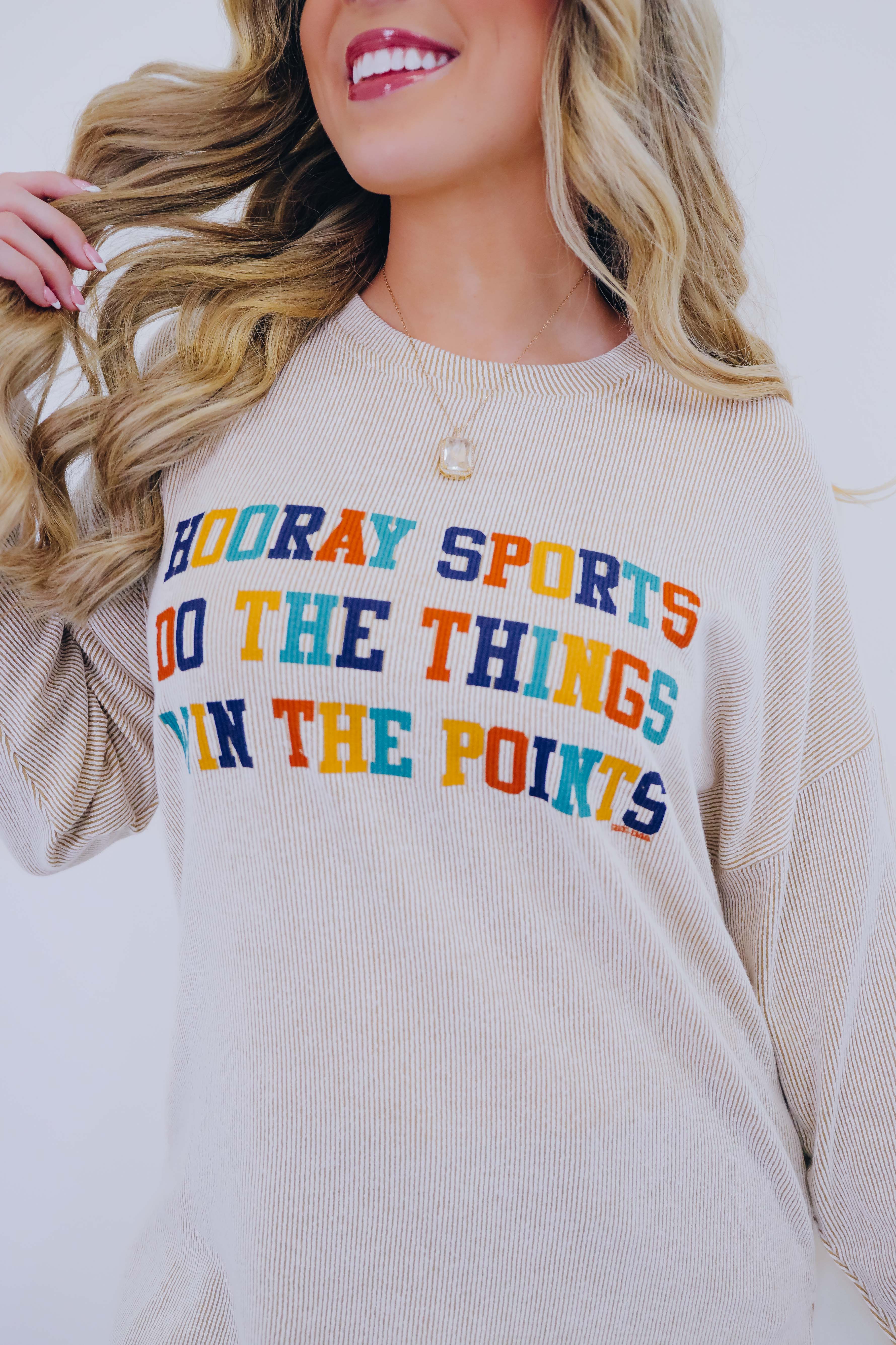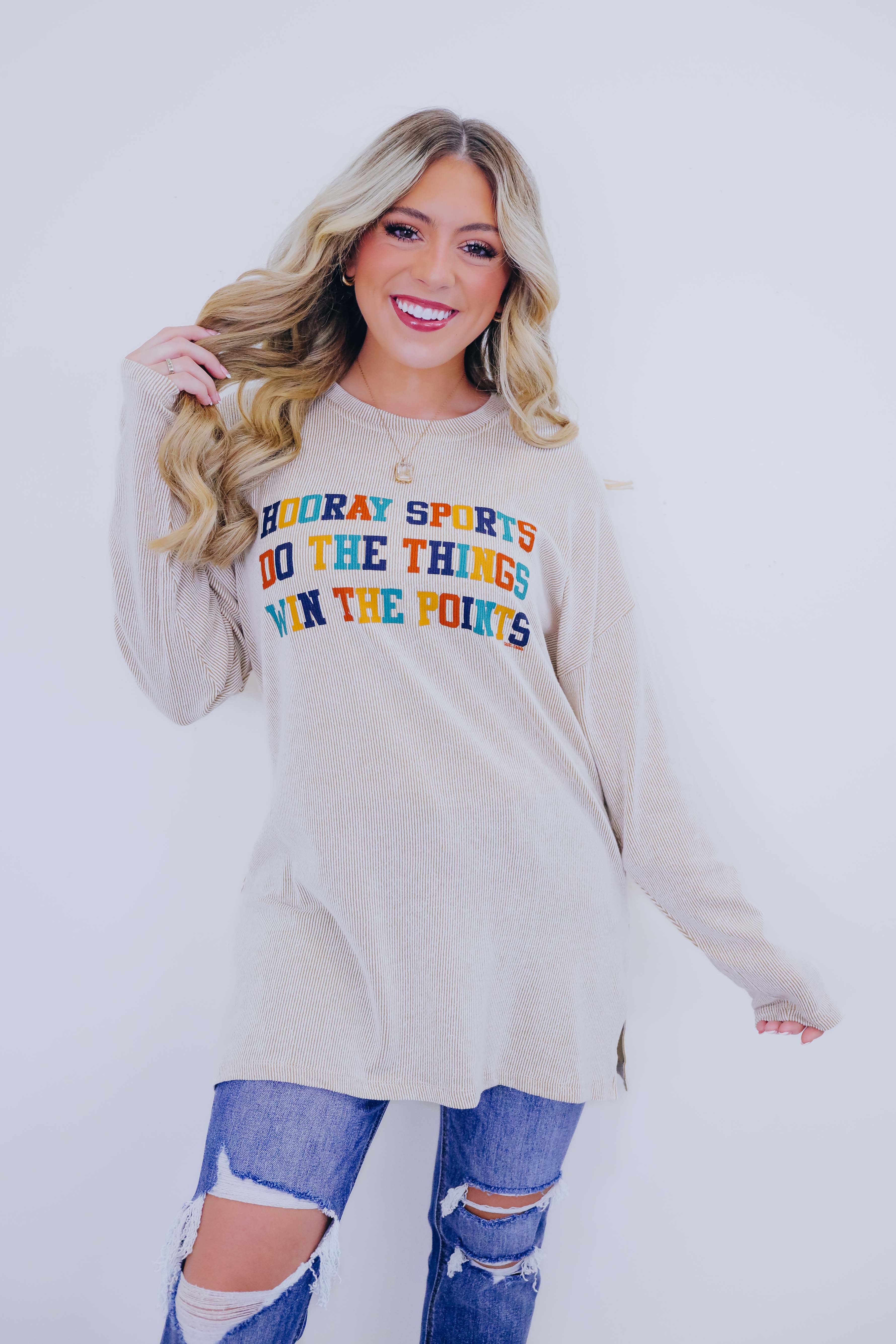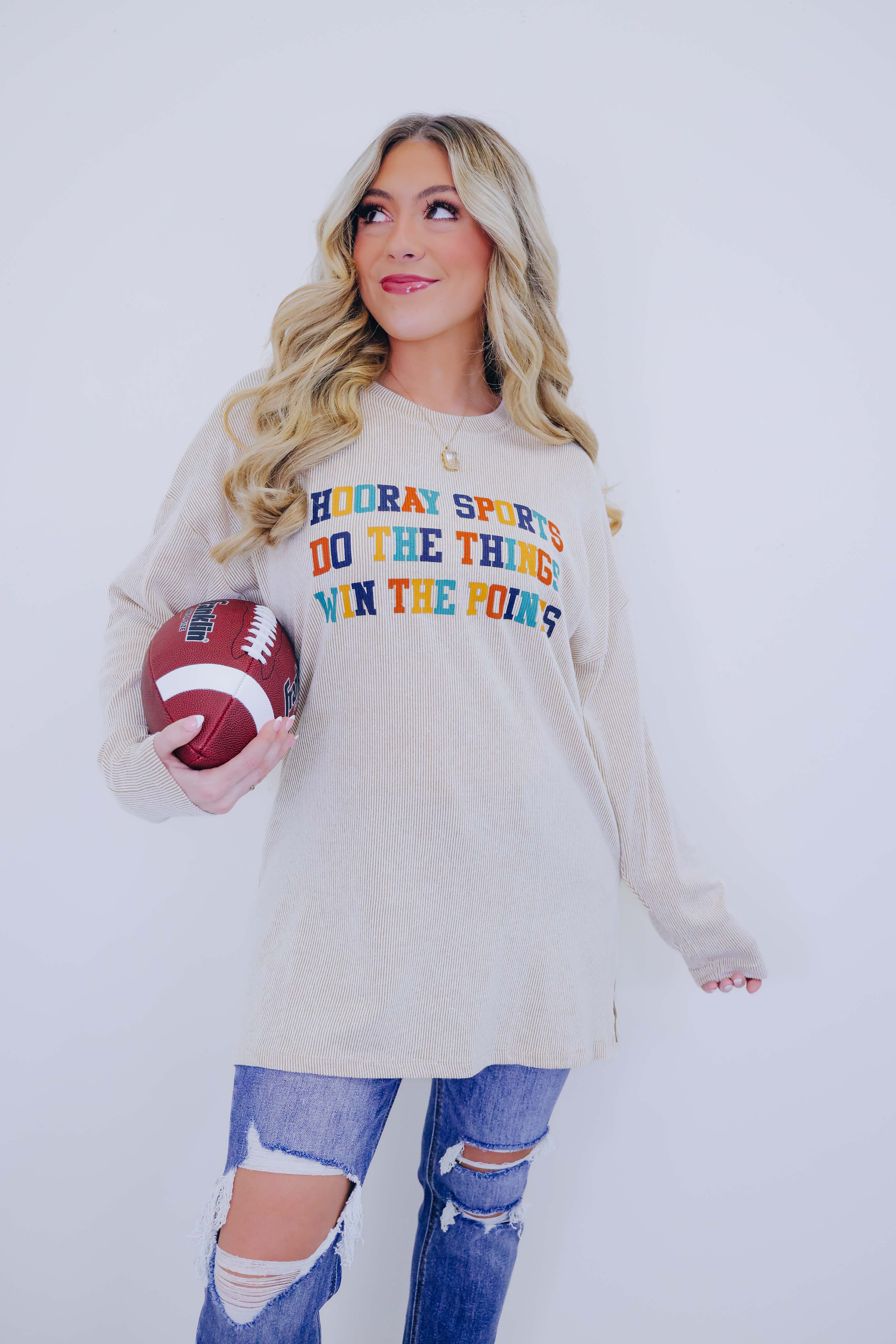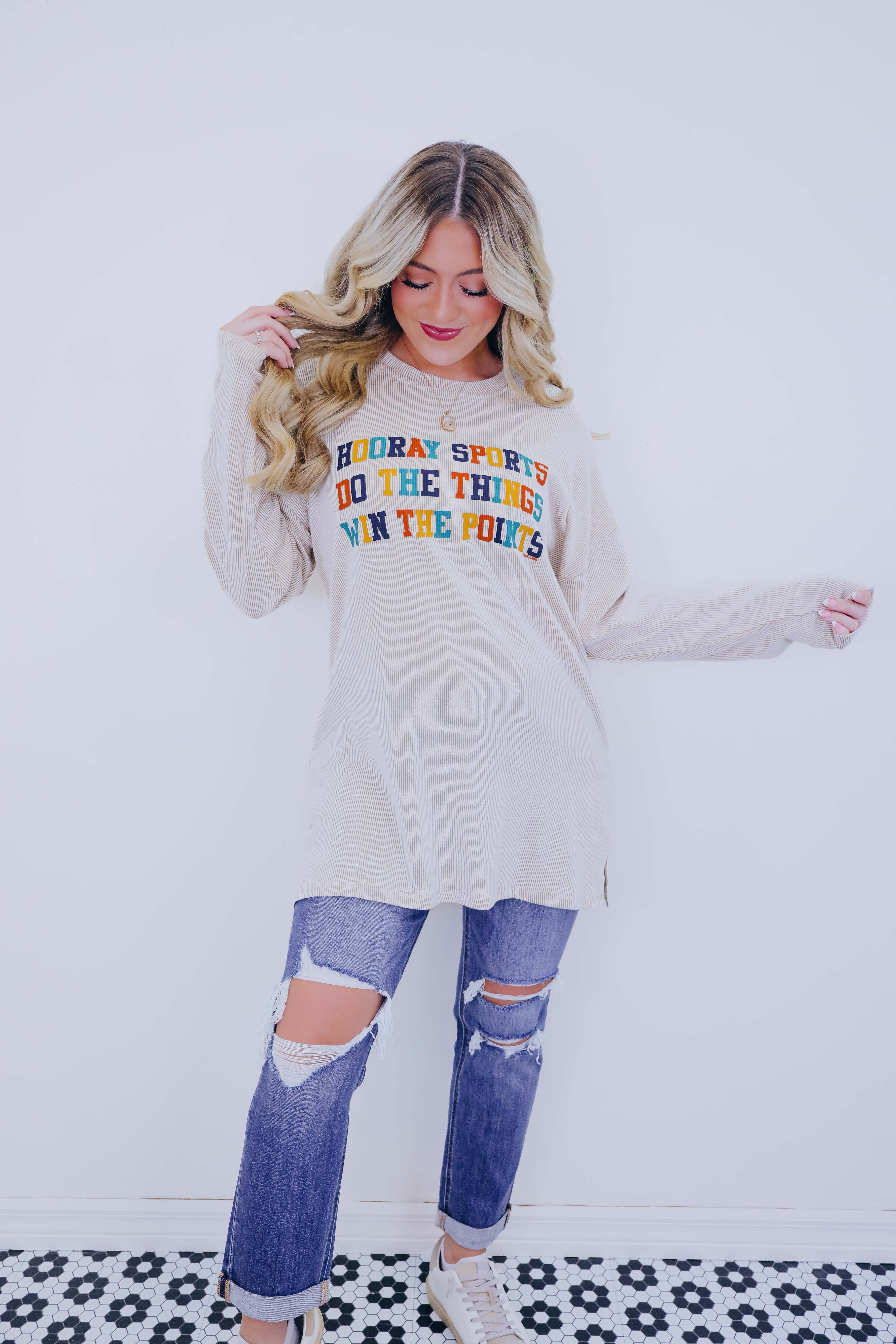 - Features a soft lightweight contrasting ivory and tan ribbed knit fabric, a crew neck, full length sleeves, and a long body with straight slit hem, with stacked graphics in a multi color font reading "Hooray Sports Do The Things Win The Points".