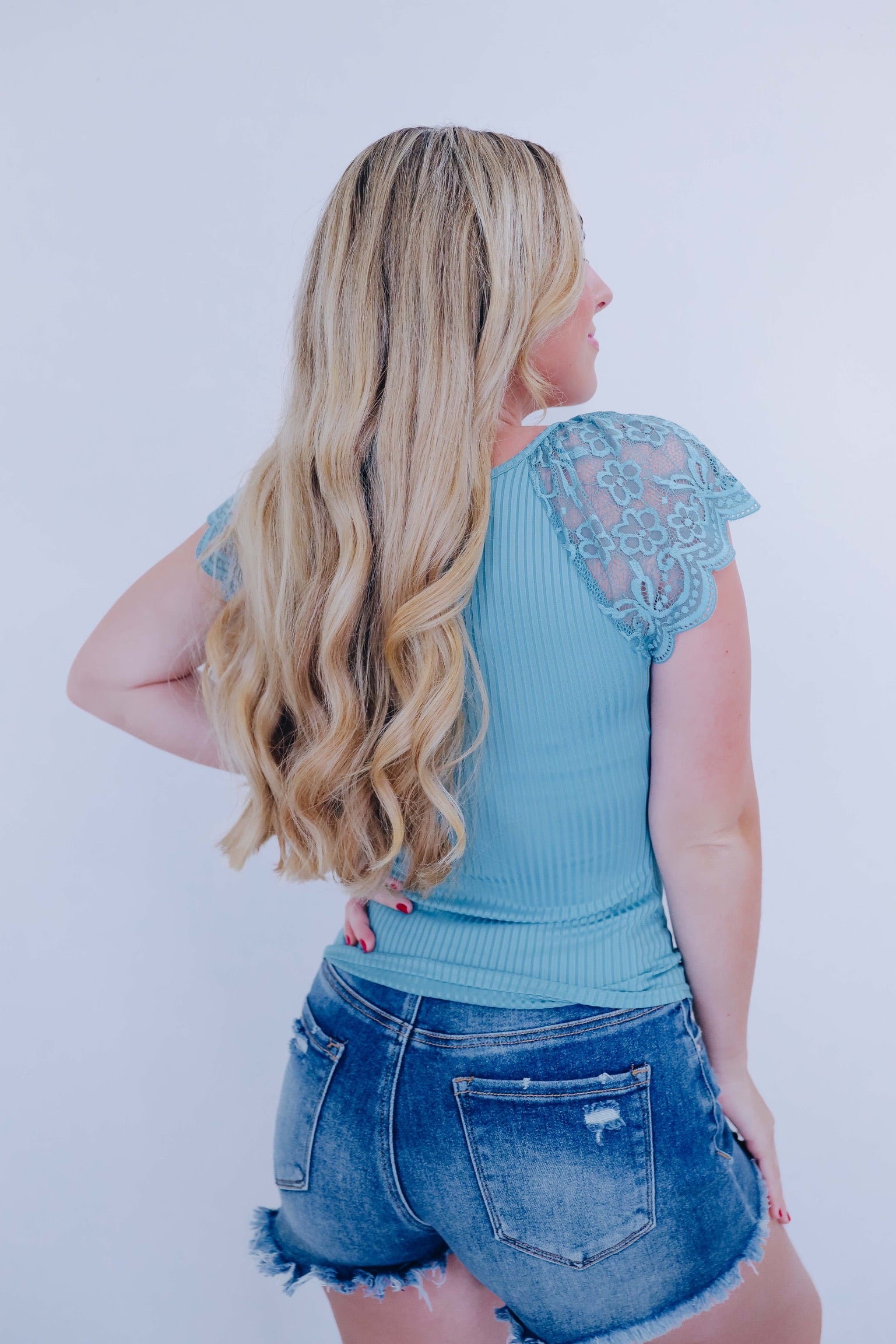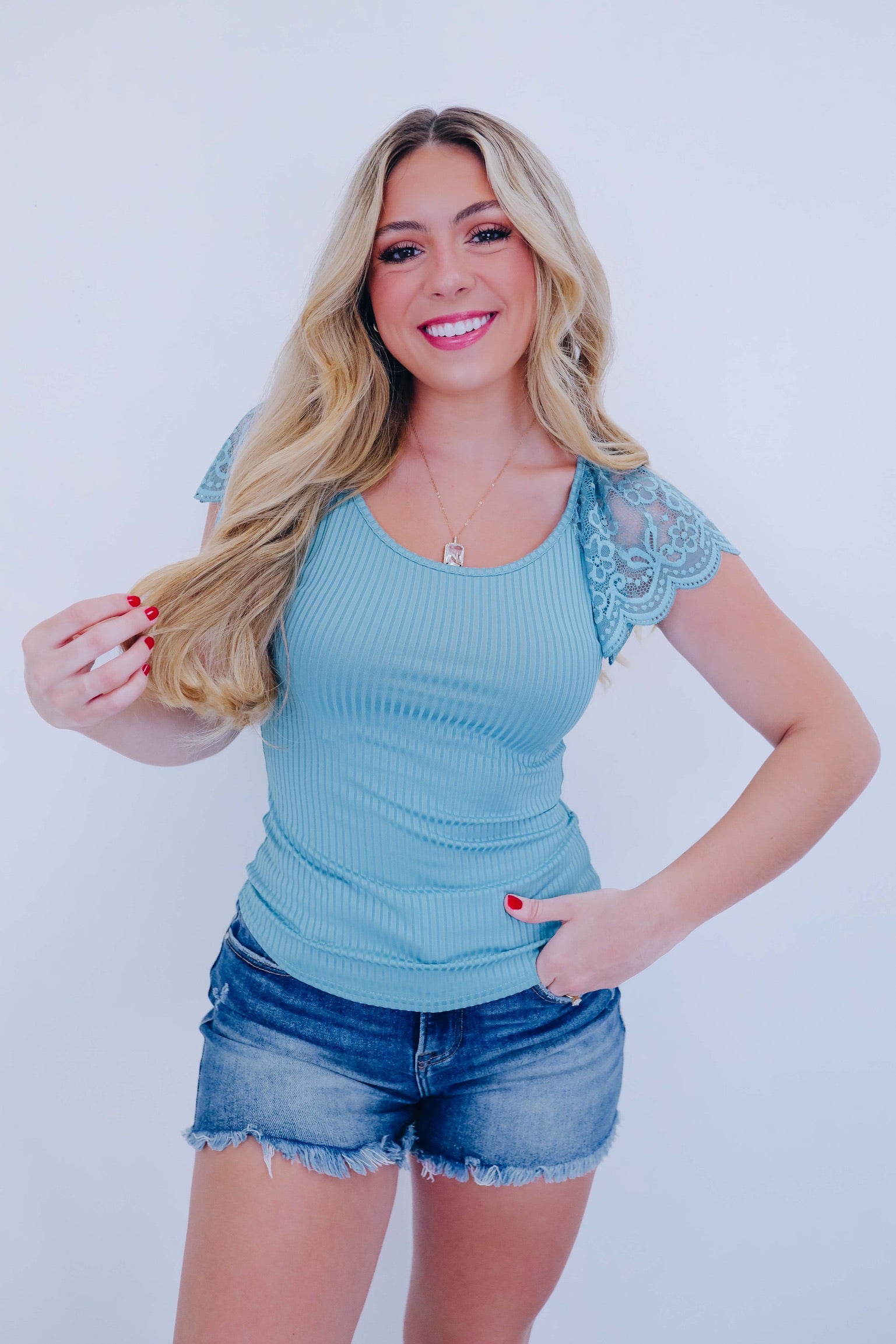 - Features a soft vertically ribbed lightweight fabric, a scoop neck, delicate lace cap flutter sleeves, and a fitted silhouette with a straight hem.