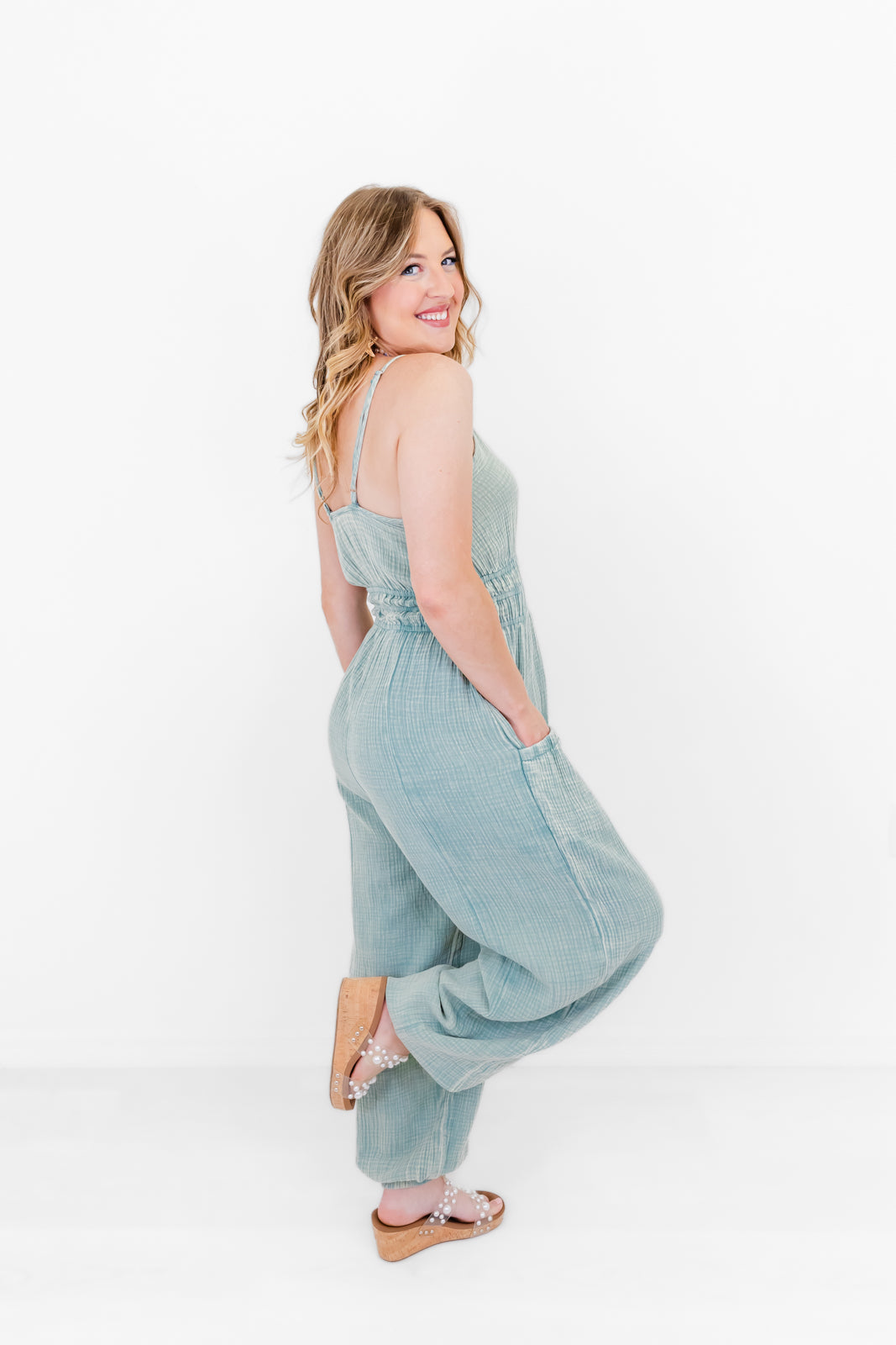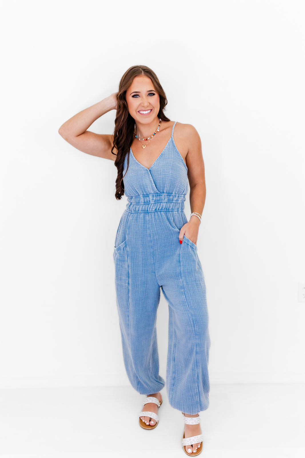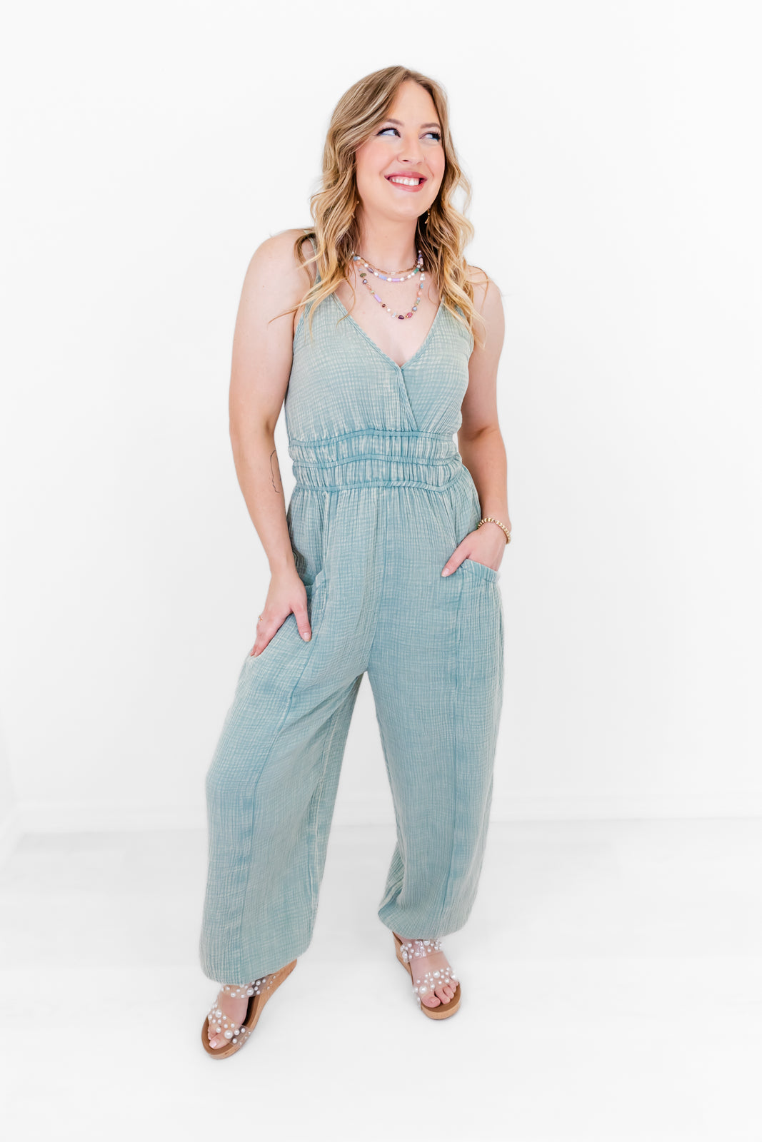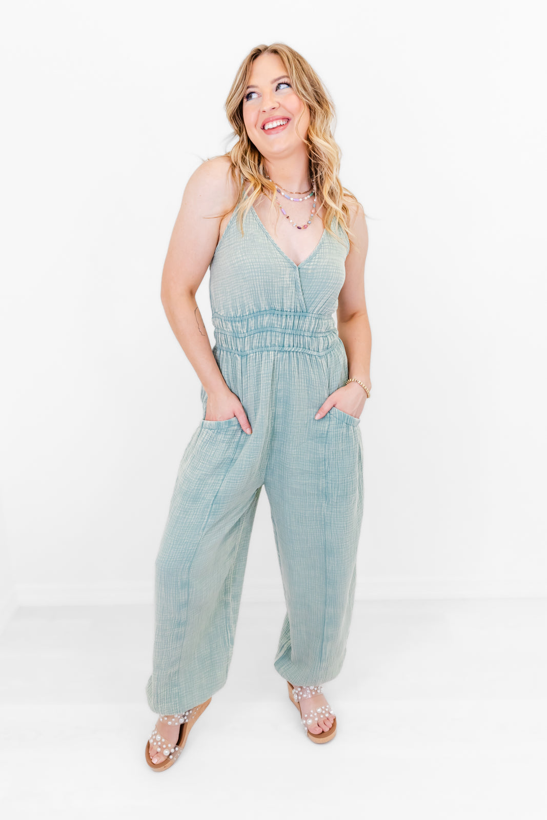 - Our Boho Breeze V-Neck Gauze Jumpsuit are the perfect throw on and go summer fit. Lightweight, breathable, and super cute, these are made for beach days, brunch days, and everything in between. Style them with simple jewelry, platform sandals and a chic clutch.