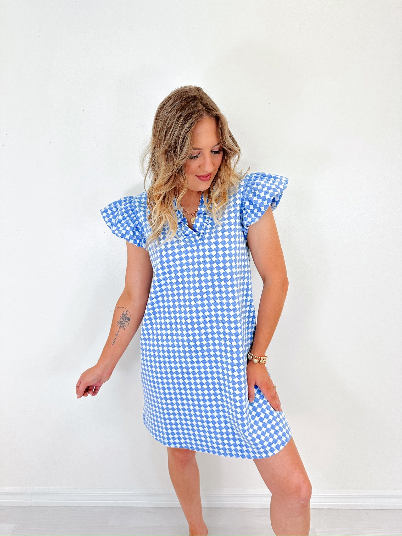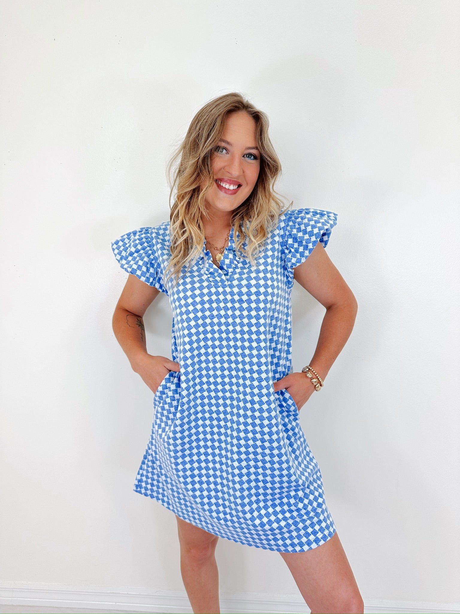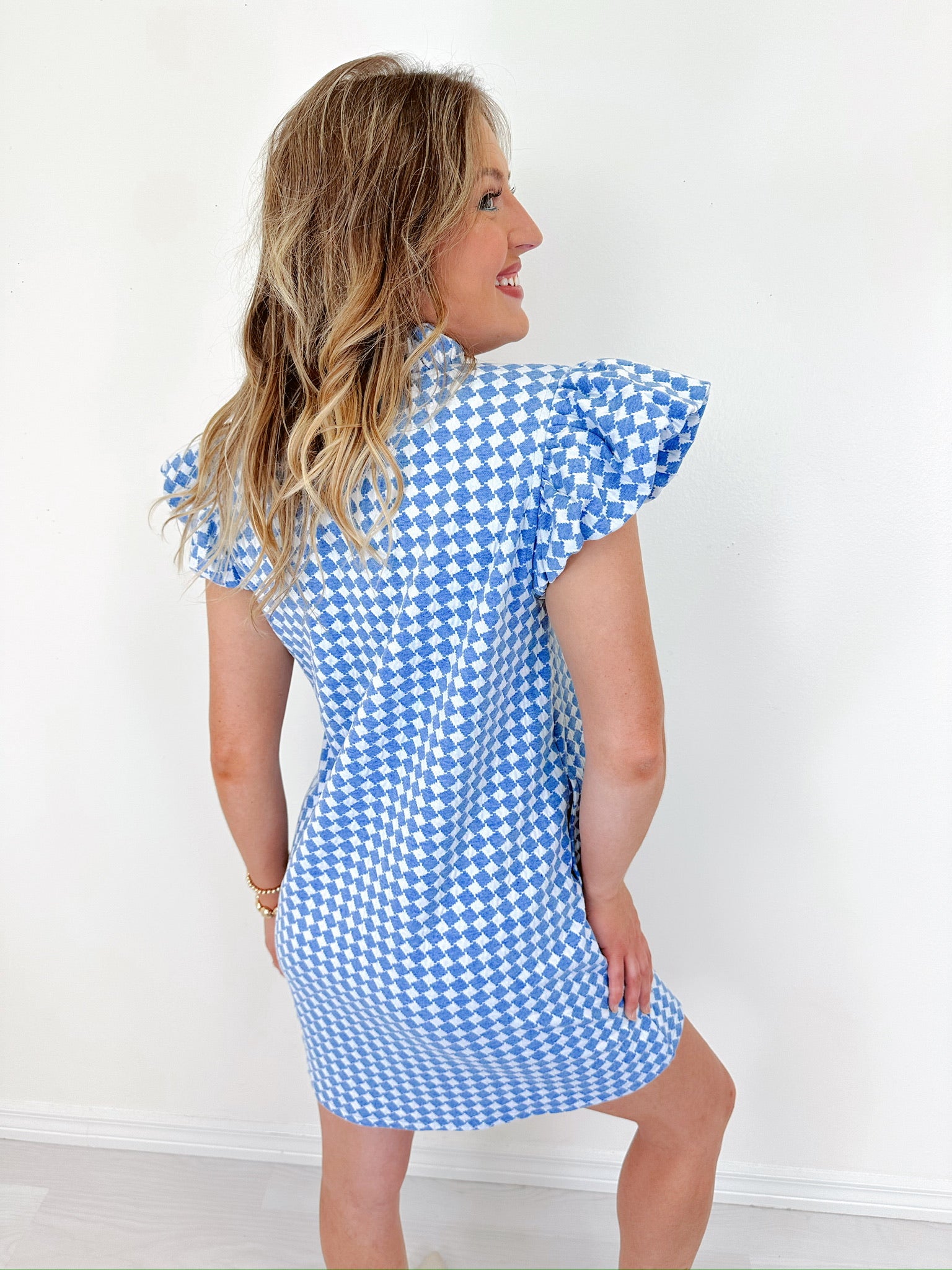 Effortless and refined, our Harmony Houndstooth Ruffled Dress exudes laid-back elegance. With its classic pattern and soft ruffled details, this statement piece will be super cute paired with your favorite sandals and simple jewelry for a chic, easy-to-style look that transitions seamlessly from day to night.