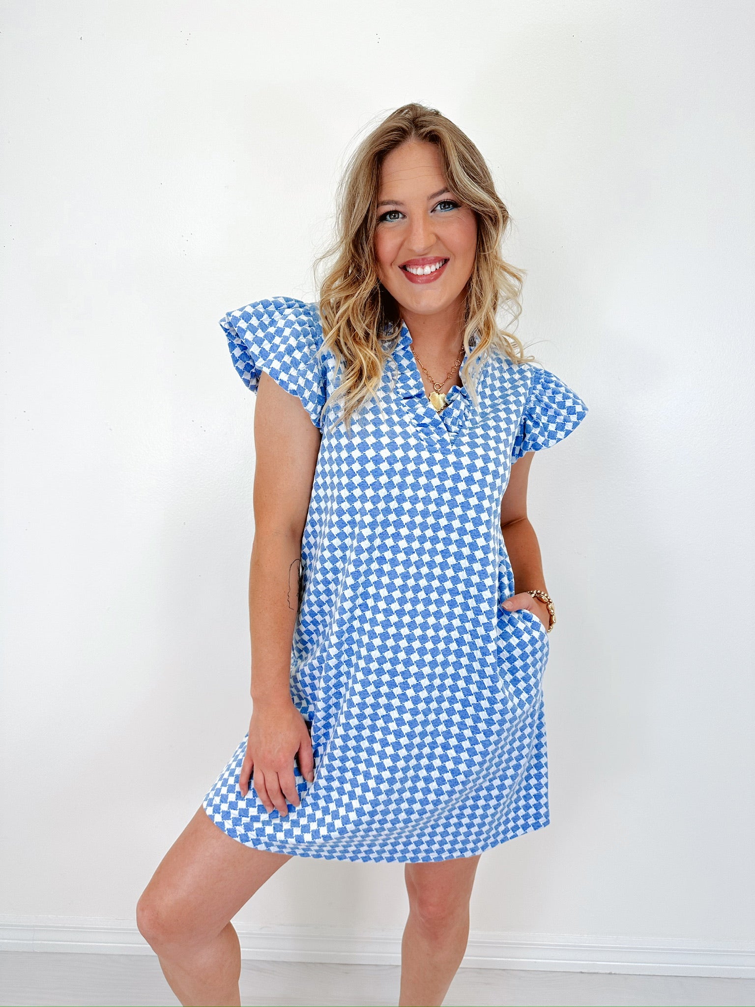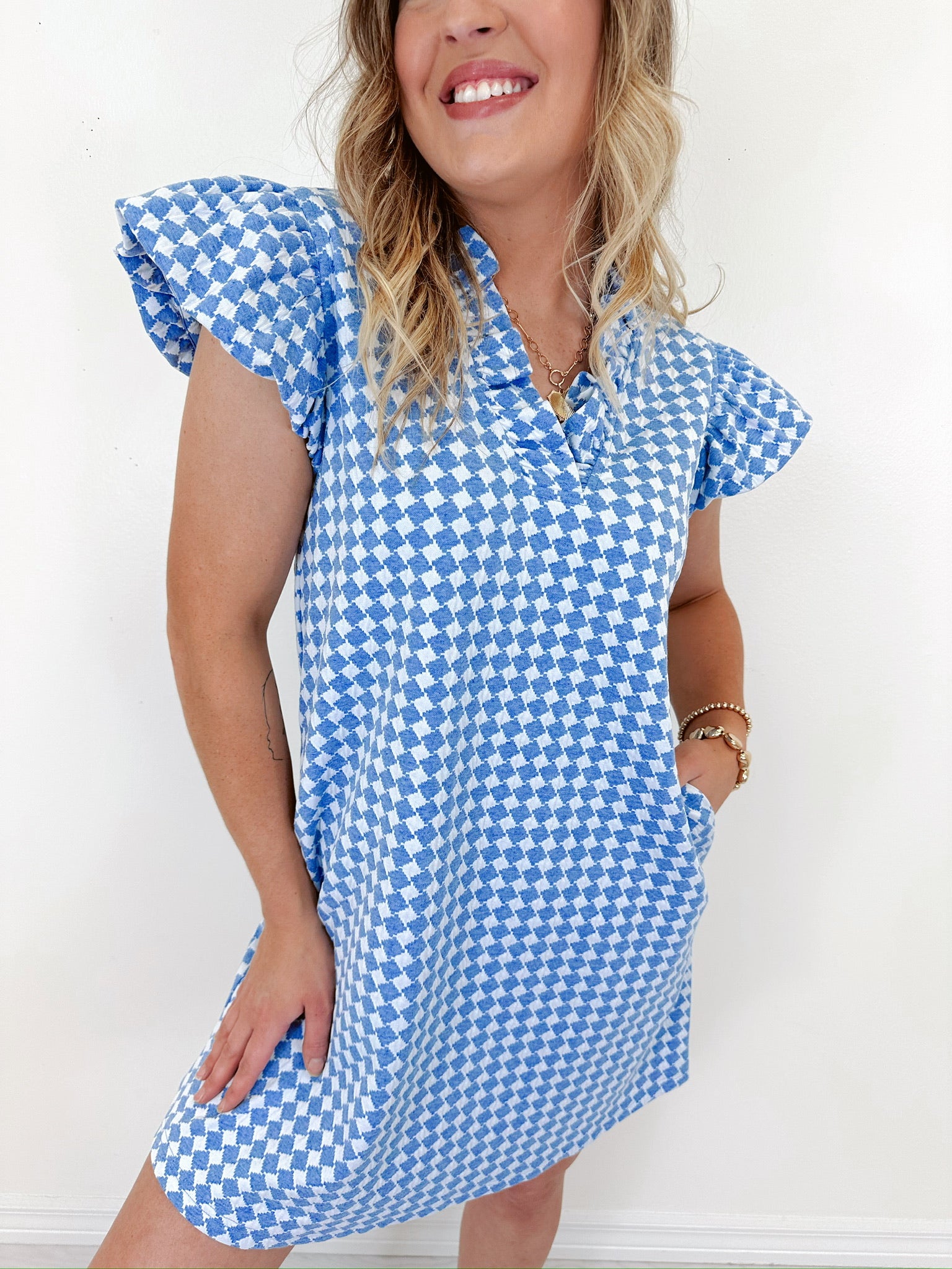 - This notch neck dress features a houndstooth print fabric, a ruffled neck, flutter sleeve, side slit pockets, and an A-line silhouette.