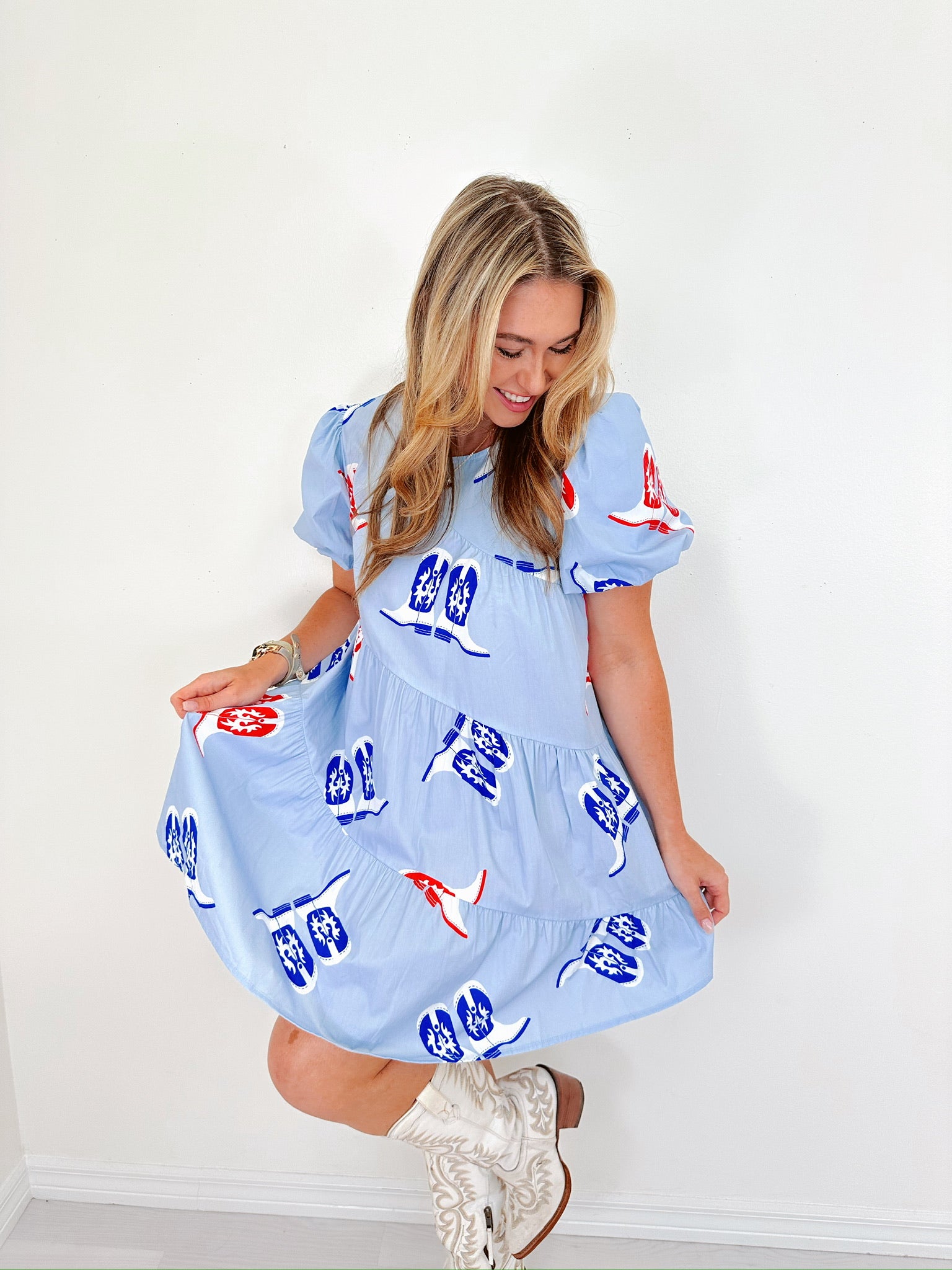 - Features an ultra-soft light blue poplin fabric with red and blue western boot print, a round neck, a tiered asymmetrical flowy body, short puff sleeves, a keyhole button closure on the back, and a ruffle hem.