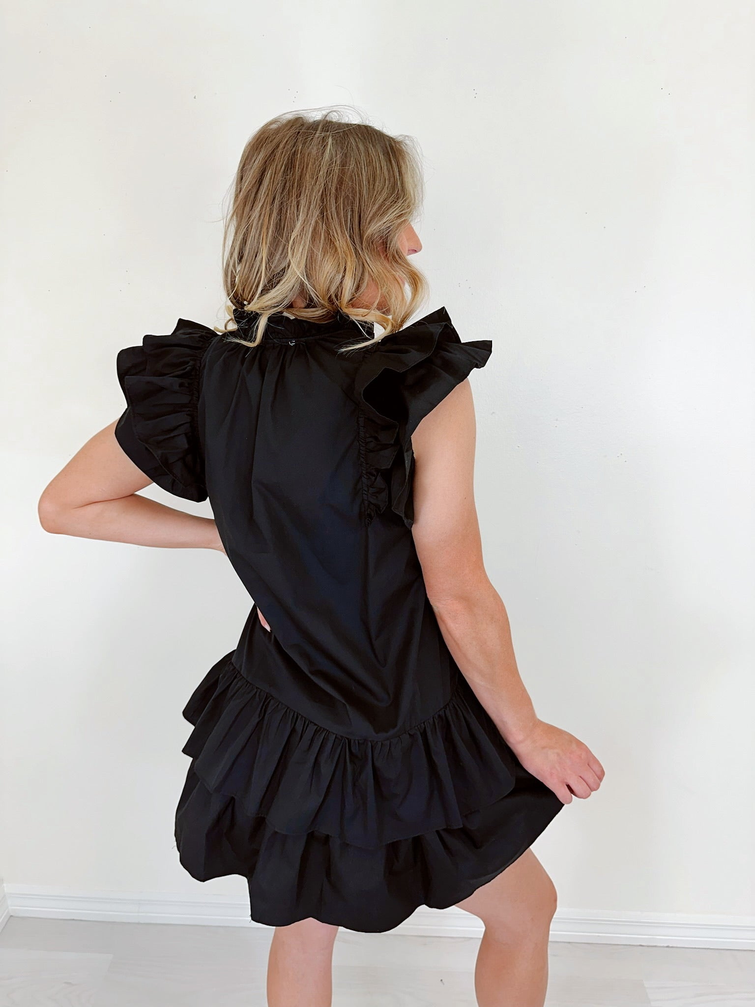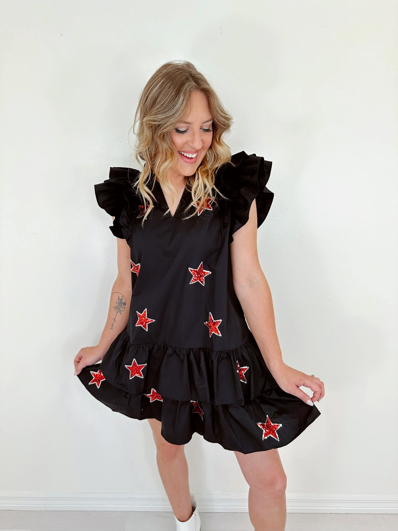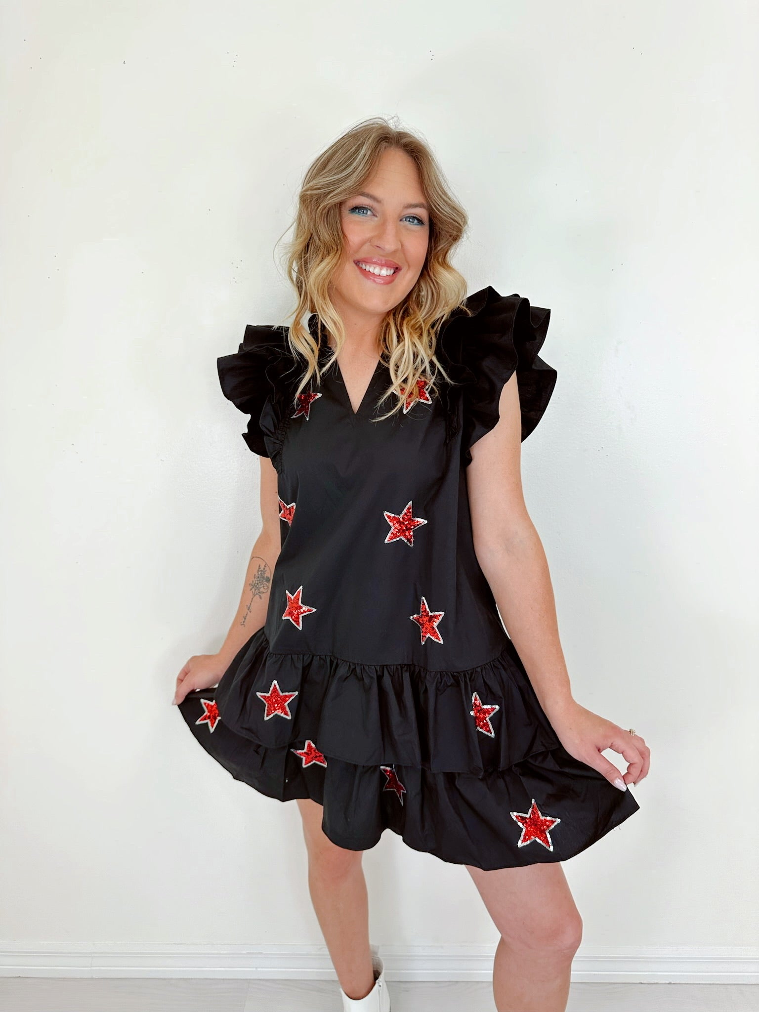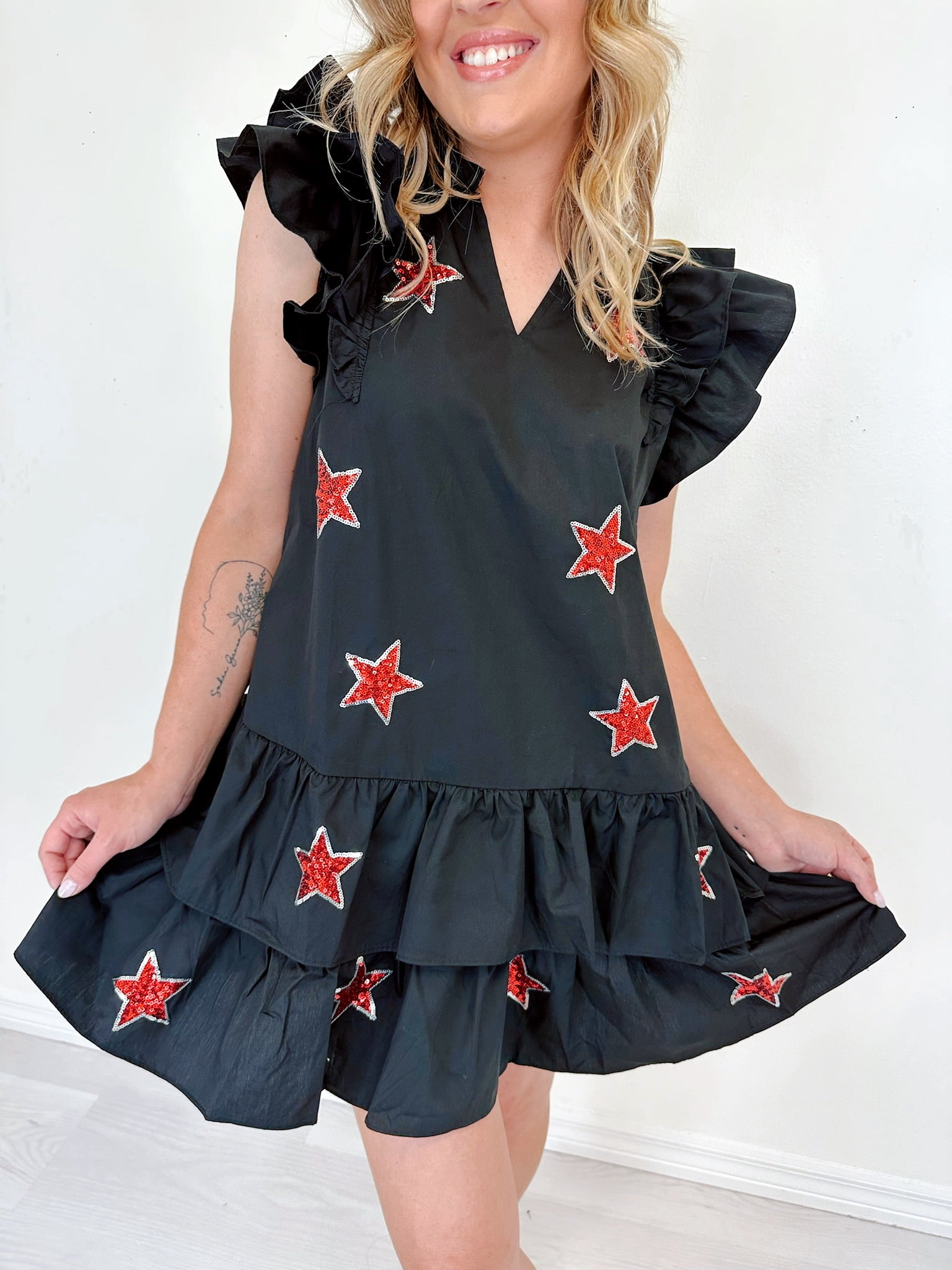 - Features a black cotton fabric with a red sequin star patch design adorning the front, a notch neck, ruffle cap sleeves, and a tiered ruffle hem