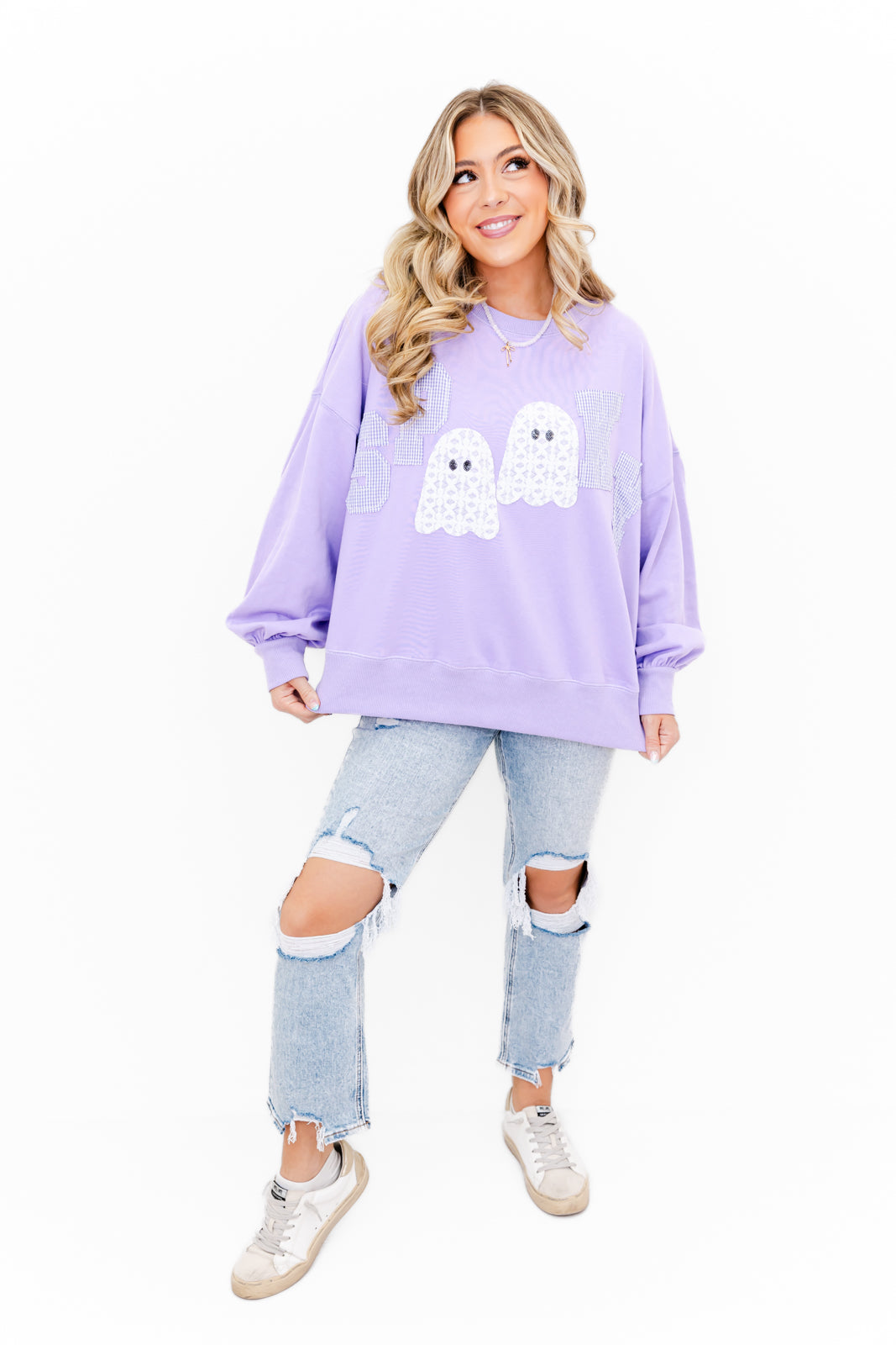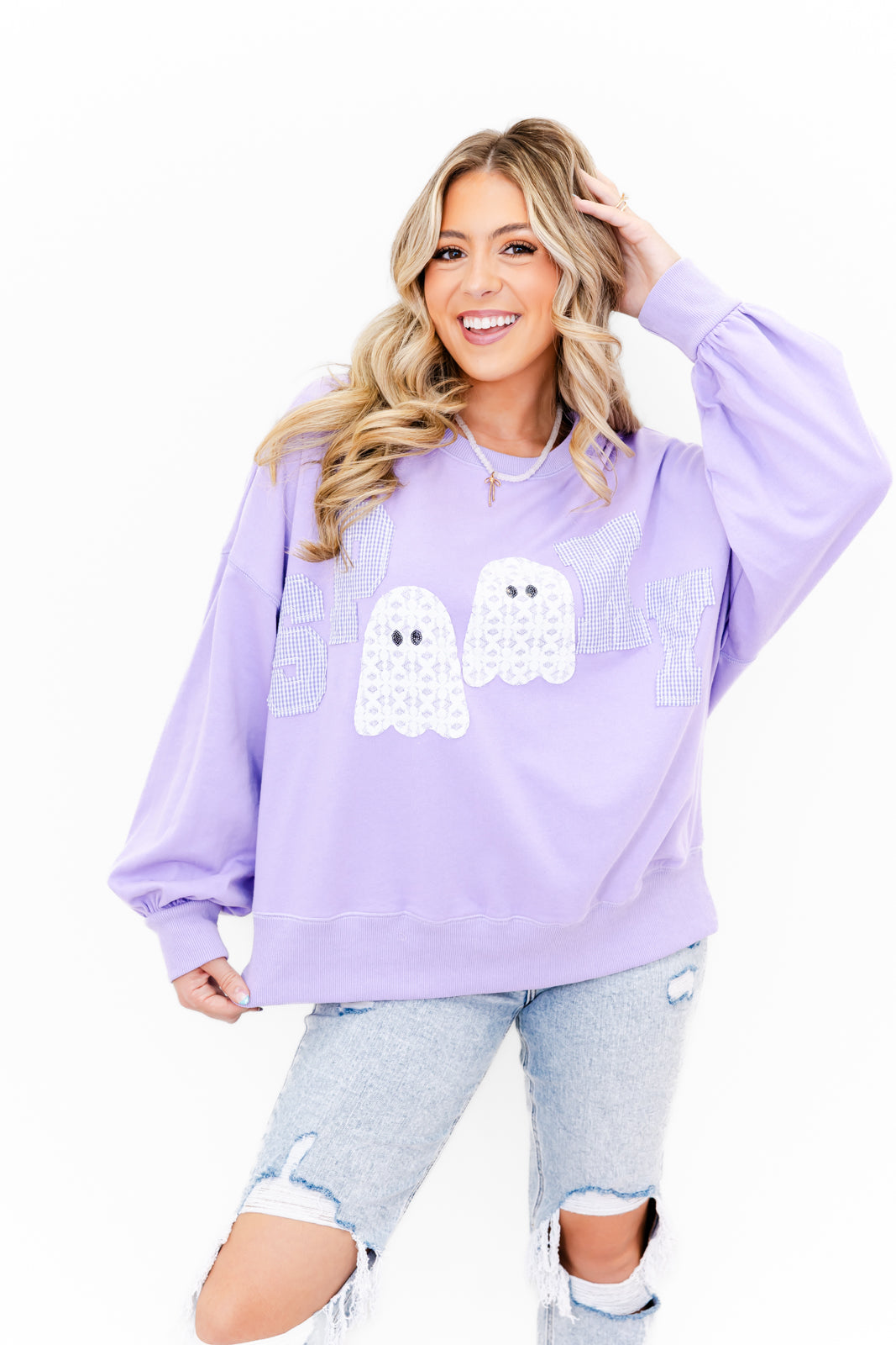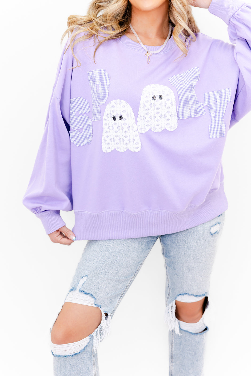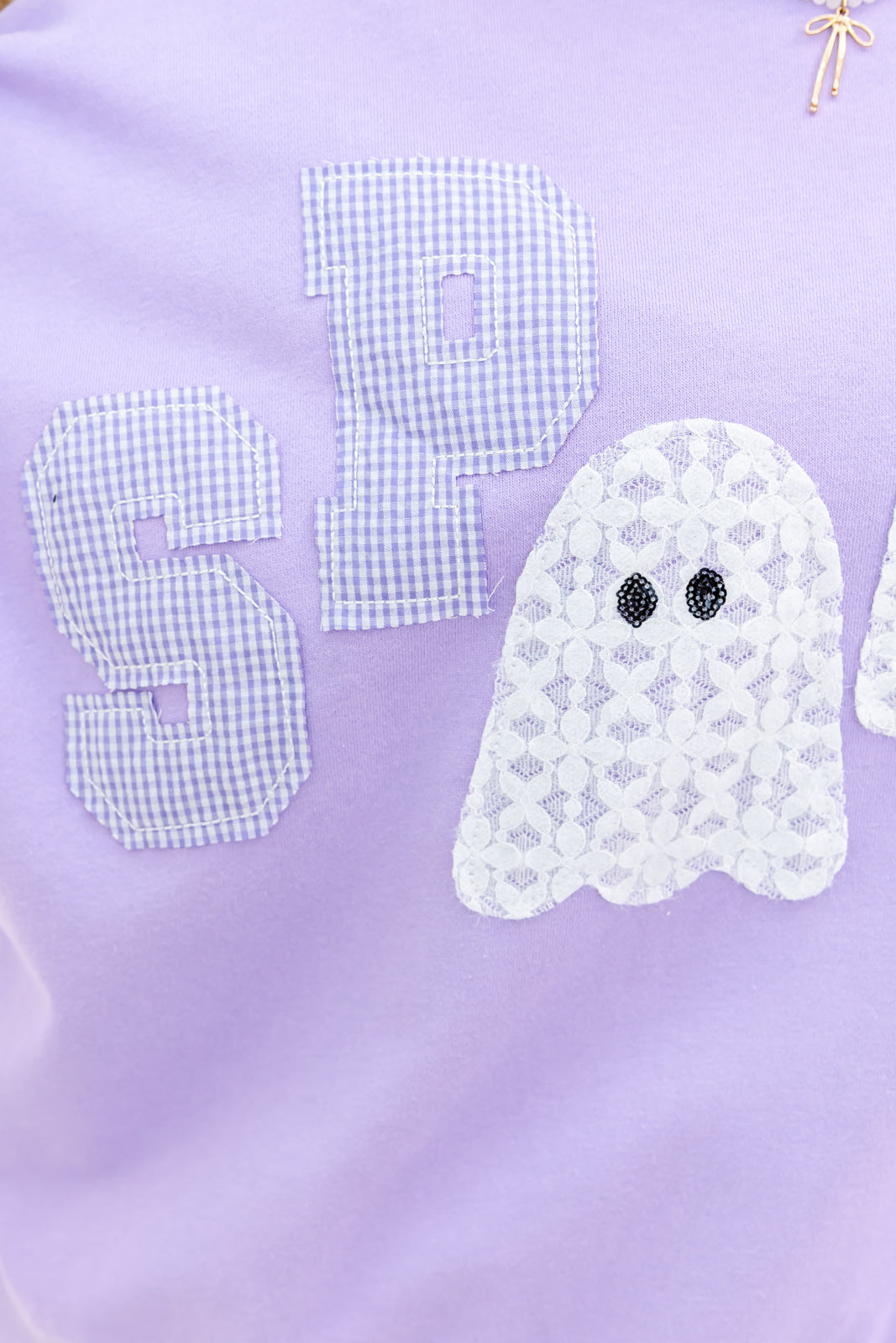 - Our Lavender Spooky Gingham Appliqué Sweatshirt is a charming and cozy statement piece for spooky season. Crafted from a soft terry knit fabric, this playful style features gingham letter appliqués spelling “SPOOKY,” with two lace-textured ghosts replacing the O’s for a fun and feminine twist.