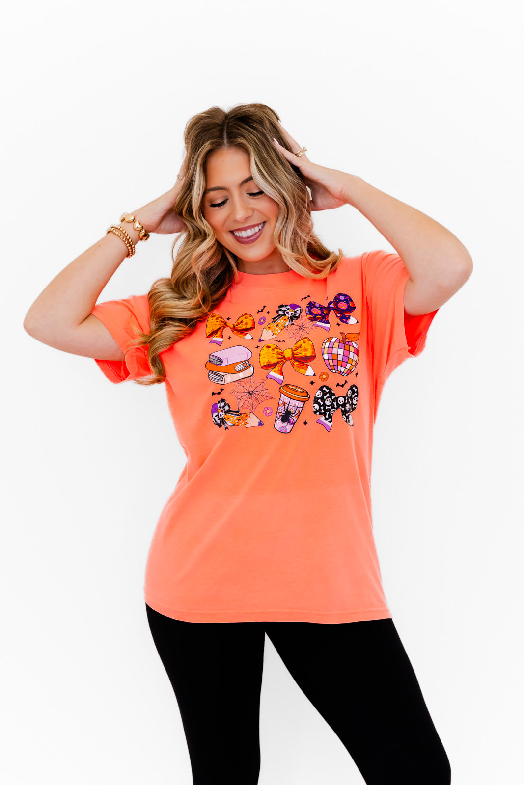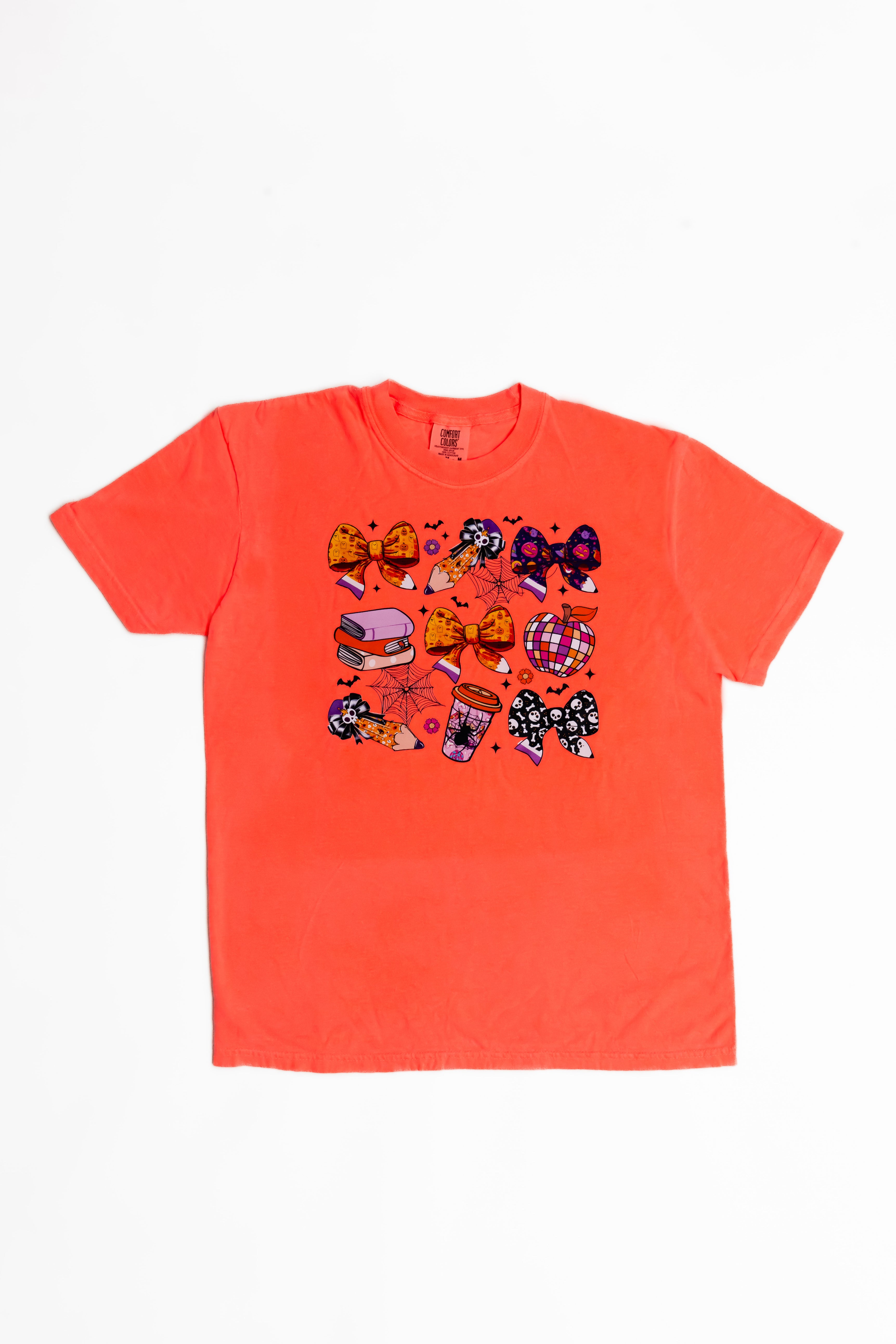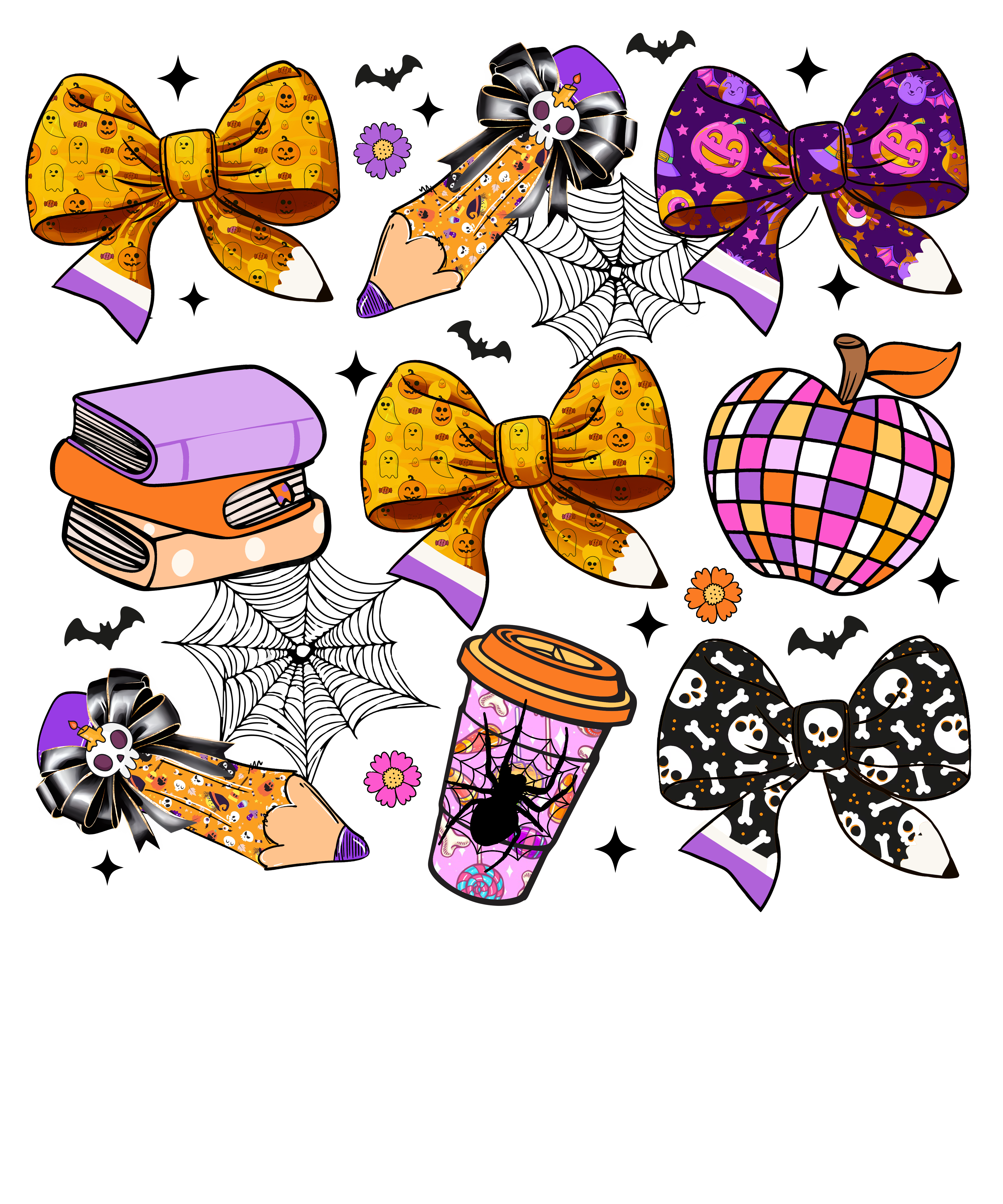 - This tee is for the ghouls who love their bows with a side of boos! Featuring Halloween-themed pencils, playful printed bows, stacked pastel books, a disco apple, and a spooky sippie cup — all surrounded by bats and blooms — this design is the perfect mix of coquette, classroom, and creepy-cute. Whether you're a teacher, student, or just love spooky school vibes, this tee is a must-have! 🕷️✨✏️ Probability of receiving this tee, 100%