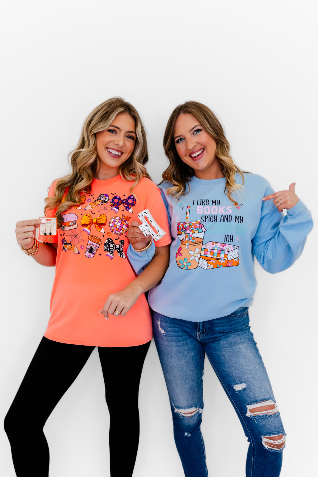 - This pastel-perfect design is made for the bookish babes and caffeine queens! Featuring a floral-printed iced coffee topped with a plaid bow and a stack of daisy-covered books, this artwork blends cozy and cute in the sweetest way. Paired with dreamy retro lettering and twinkly stars, it's the ultimate comfy sweatshirt for coffee runs, study days, or just living your soft girl fantasy. 🌸✨📖 Retail Value $19. Probability of receiving this sweatshirt, 100%