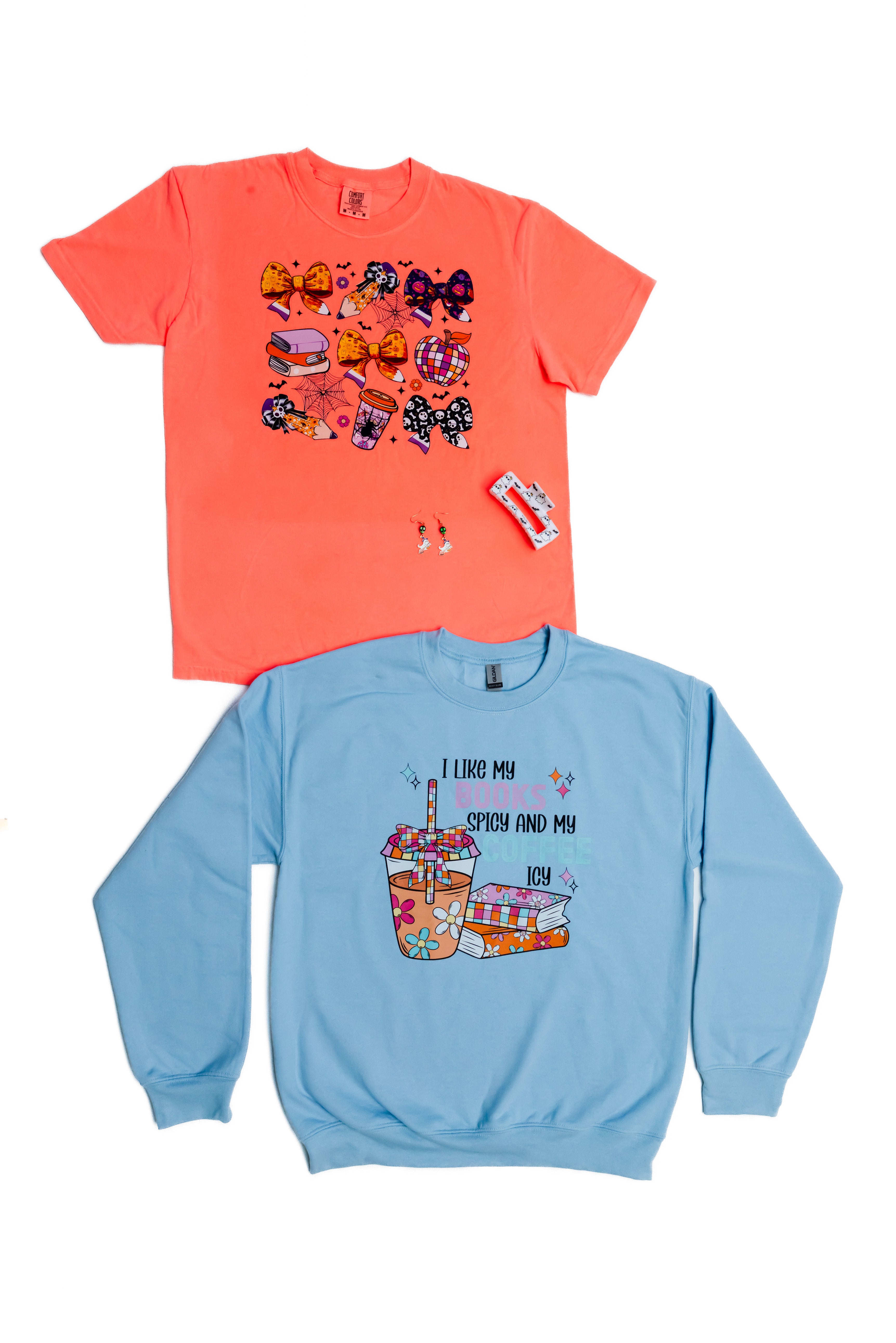 This Bundle will contain 1 graphic sweatshirt, 1 graphic tee, 2 Halloween accessories.