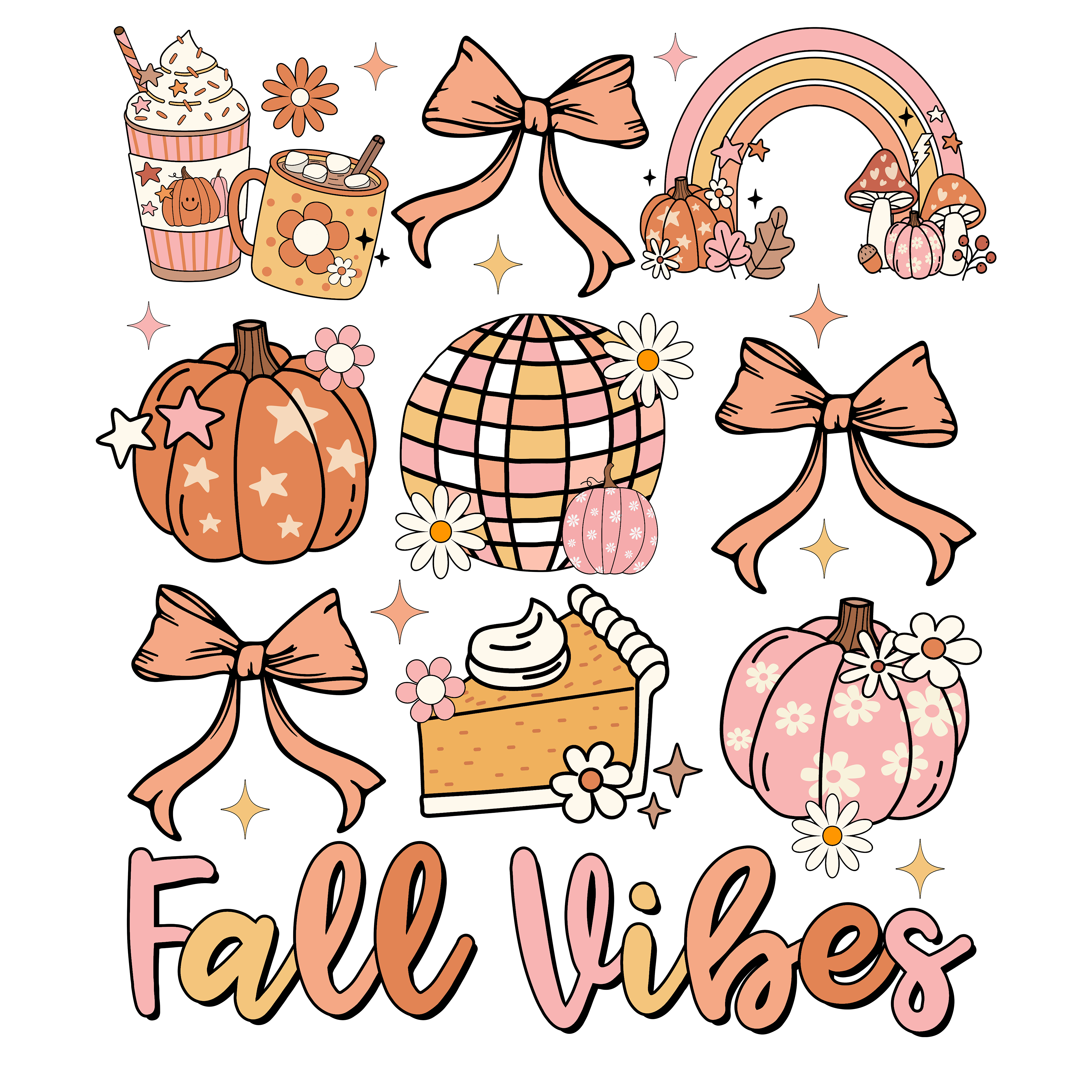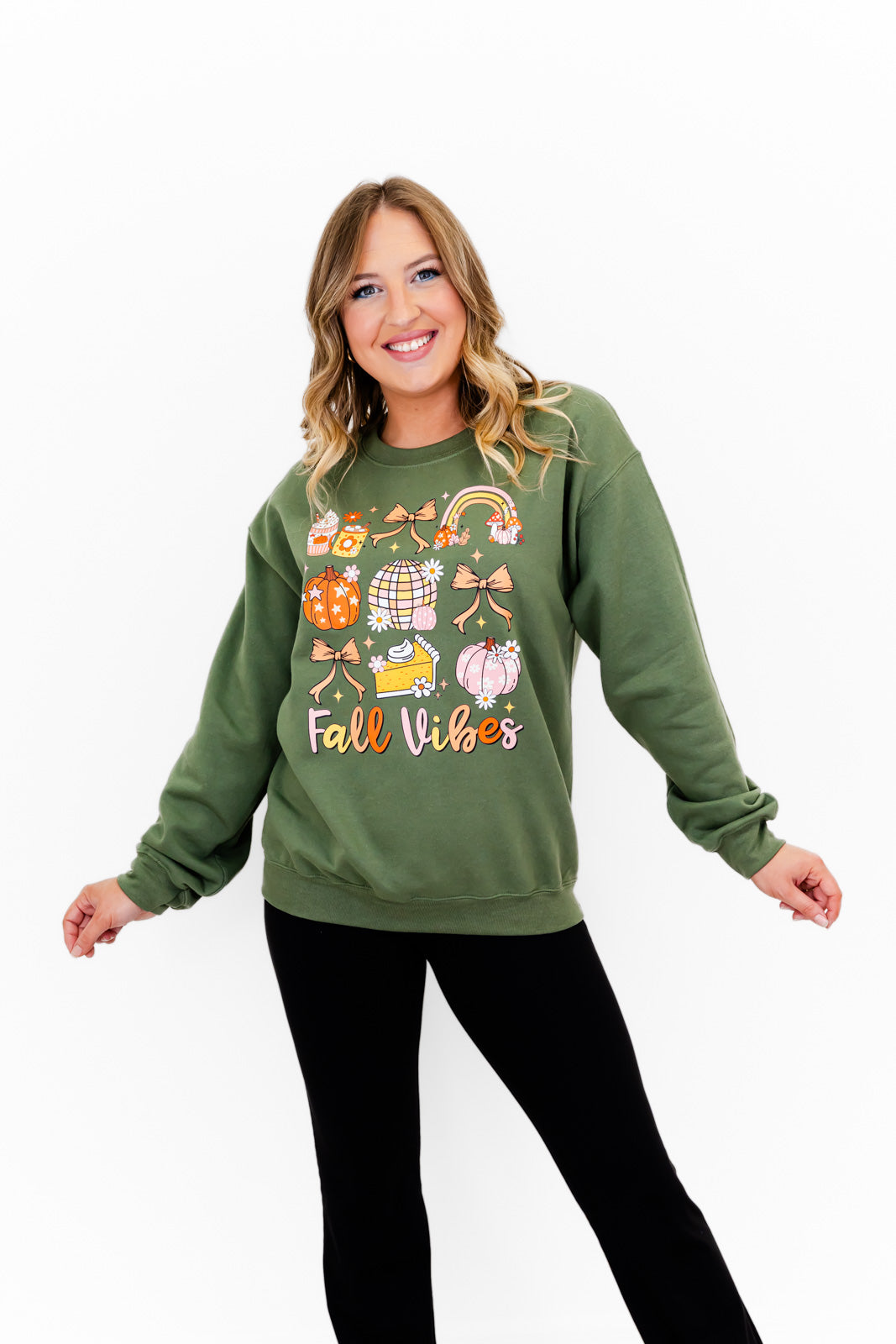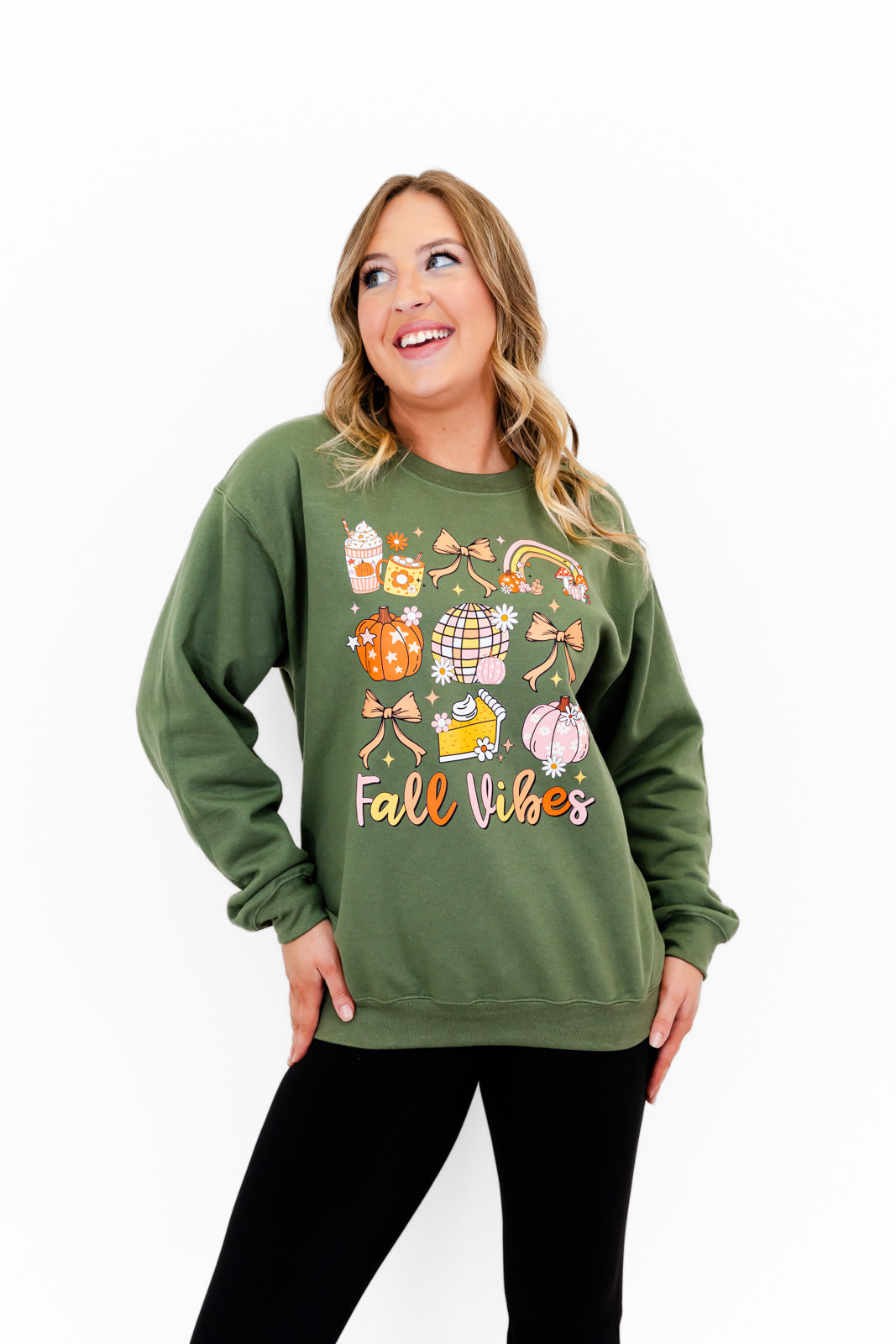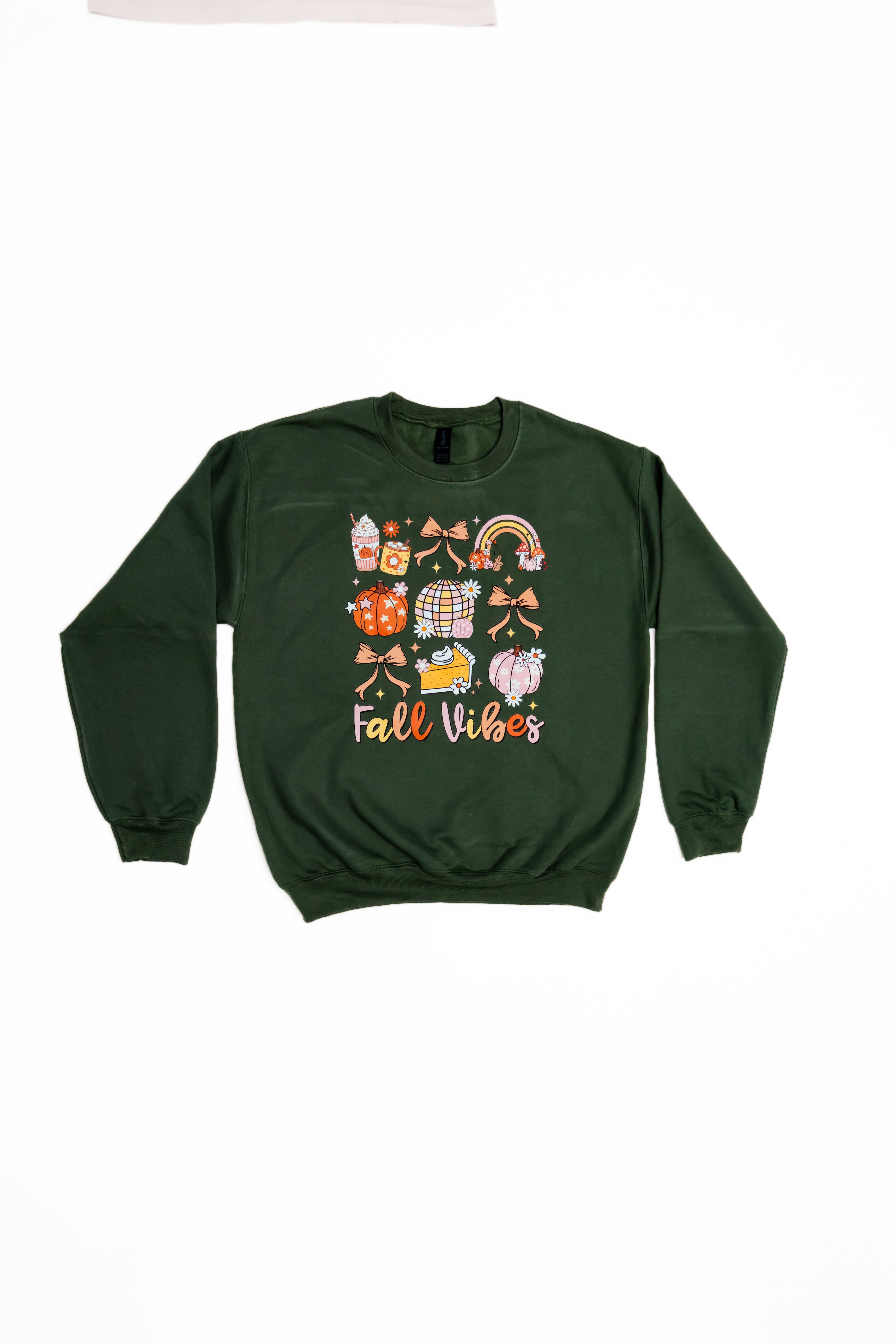 - Our Fall Vibes sweatshirt brings all your autumn dreams to life with a pastel twist! Featuring charming fall icons like whipped lattes, cozy mugs, disco pumpkins, slices of pie, rainbows, and the sweetest bows — all in soft blush, peach, and cream tones. Perfect for sipping cider, pumpkin patch strolls, or just being your cute, seasonal self. 🎀🎃🍁. Retail Value $19. Probability of receiving this sweatshirt, 100%