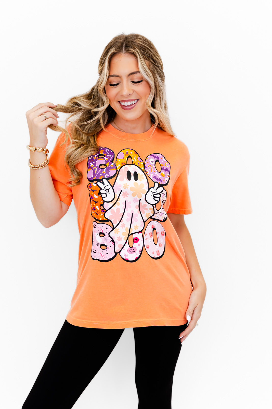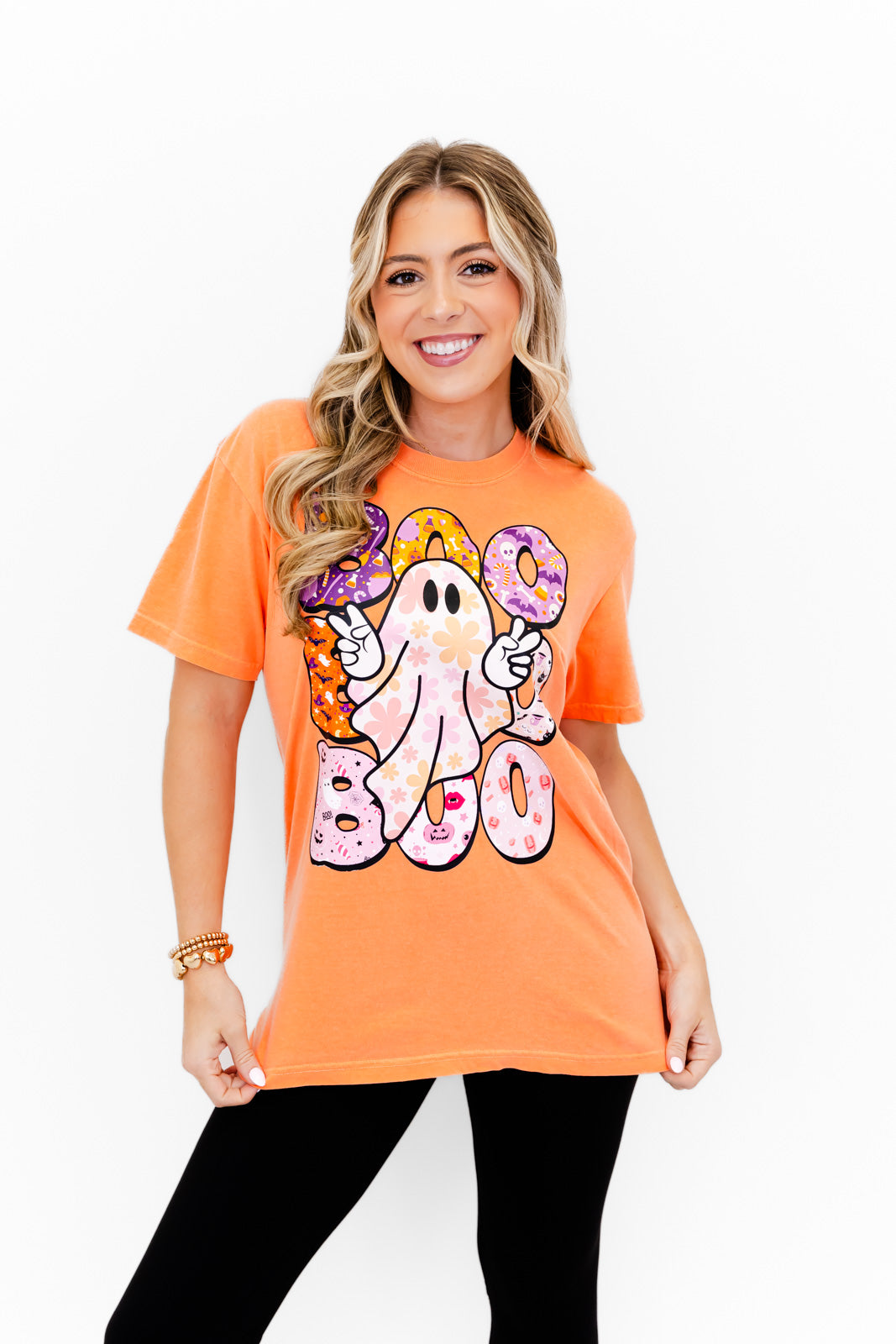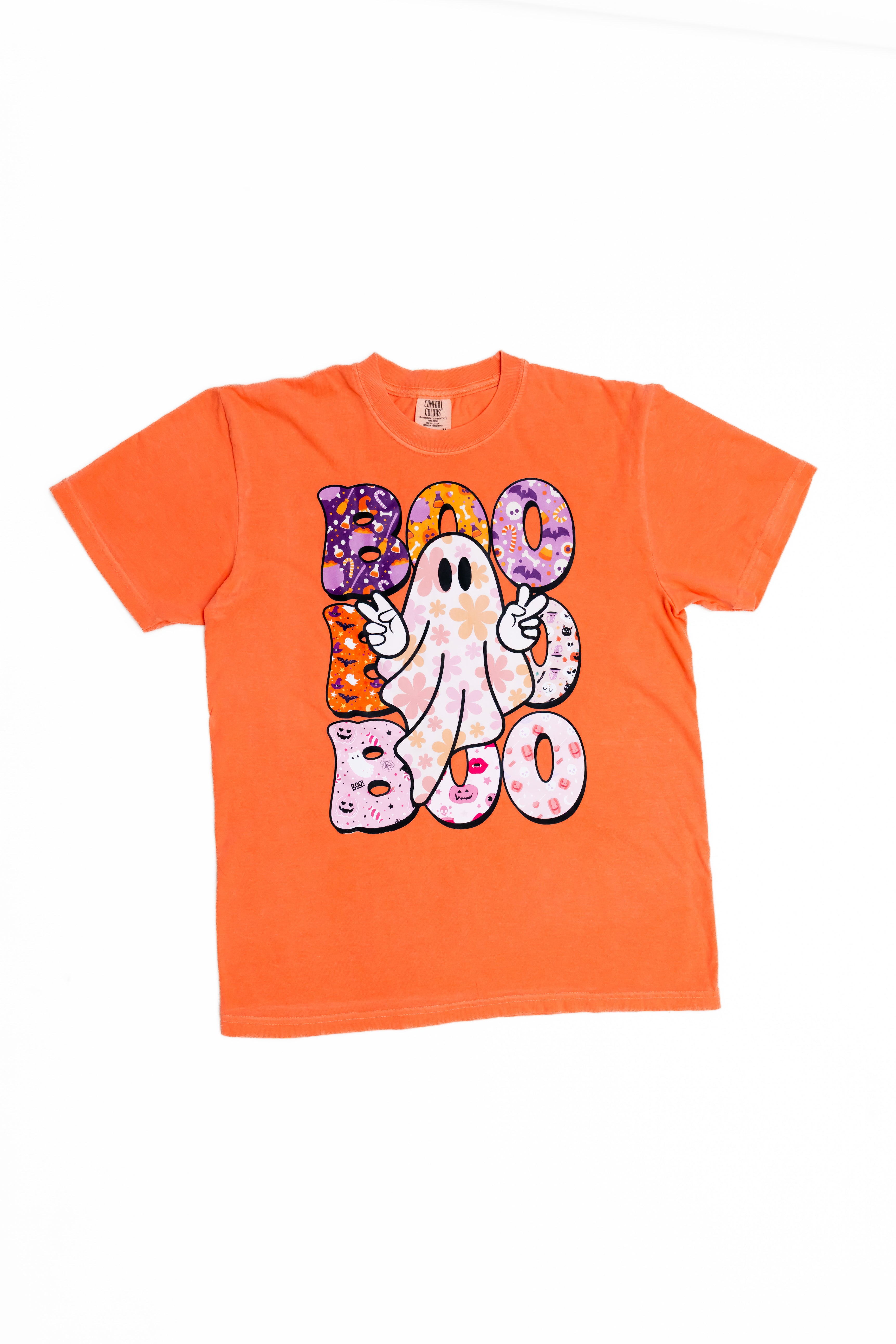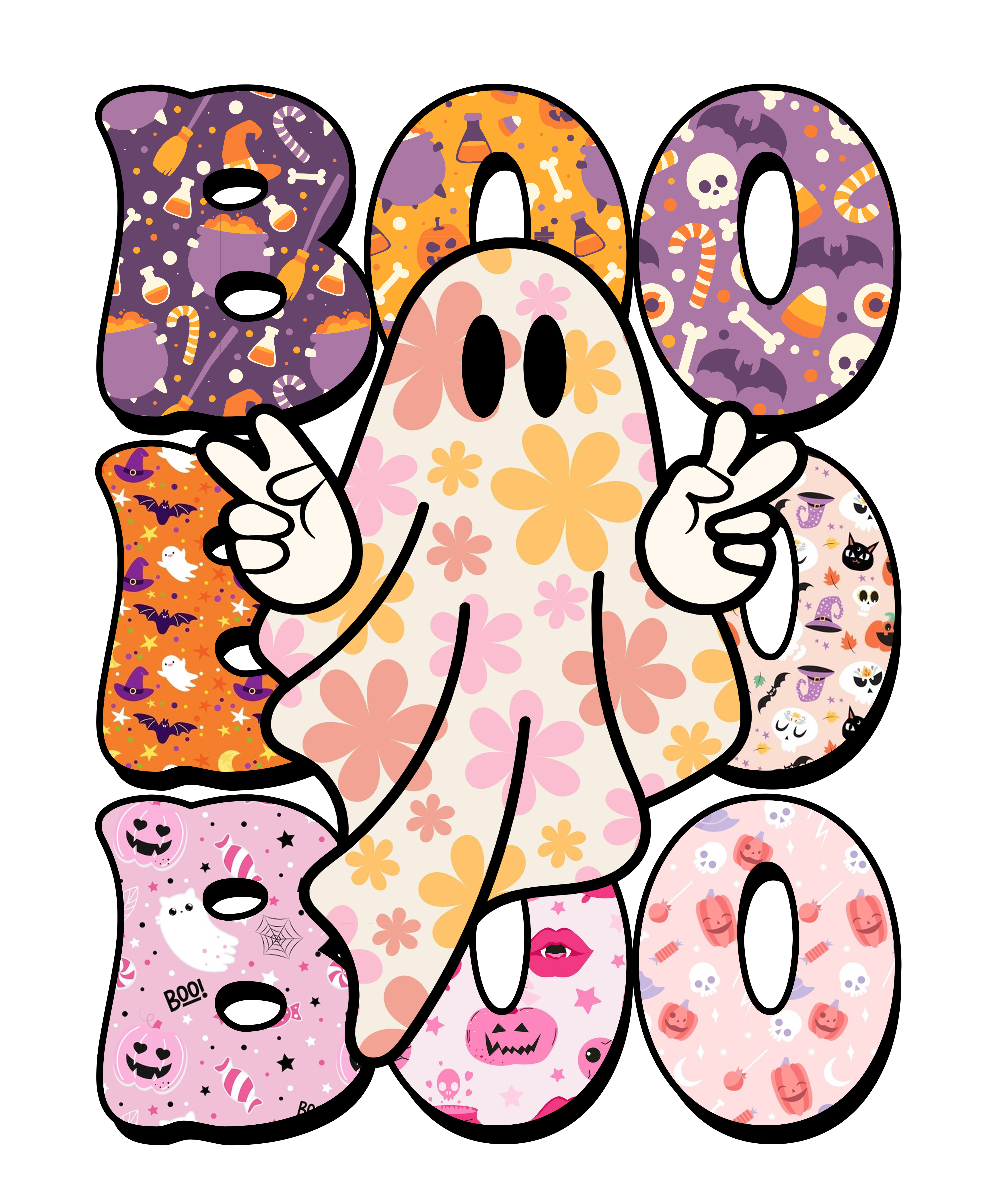 - This tee is a spooky-season must-have with a fun twist! Featuring a flower-power ghost throwing peace signs and surrounded by colorful, patterned “BOO” letters filled with all things Halloween — from candy corn to cauldrons and cute ghosts to glittery skulls. It's the perfect mix of spooky, sweet, and retro-chic! 🎃🌸🕸️ Probability of receiving this tee, 100%