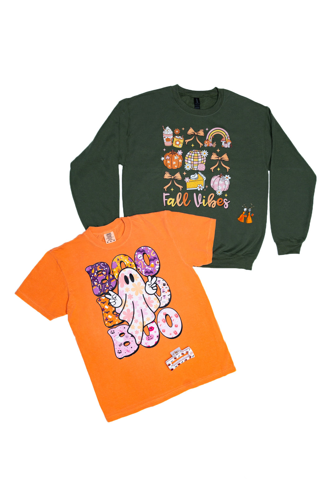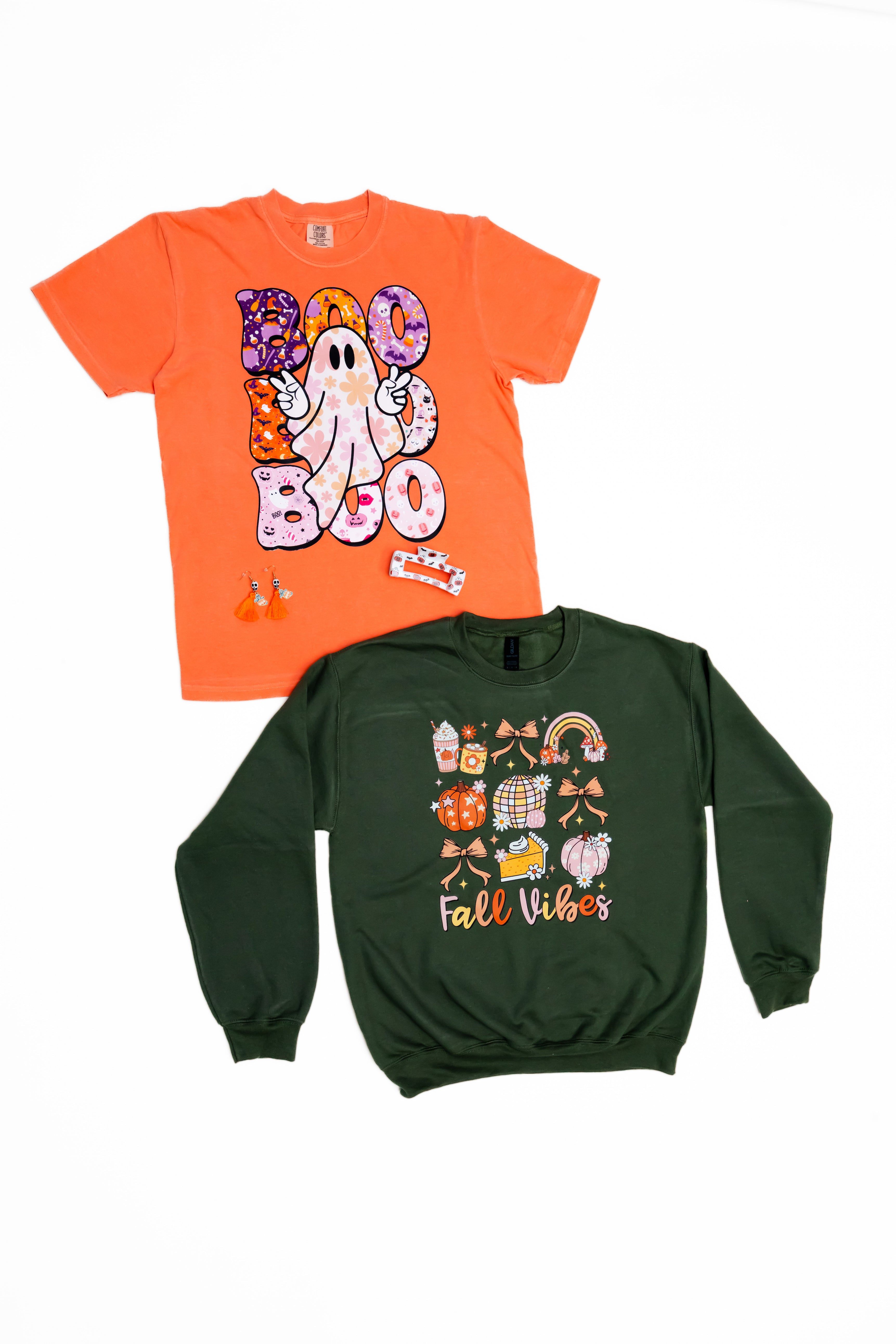 This Bundle will contain 1 graphic tee, 1 graphic sweatshirt , 2 Halloween accessories.