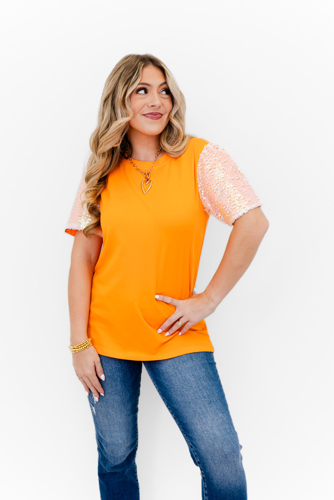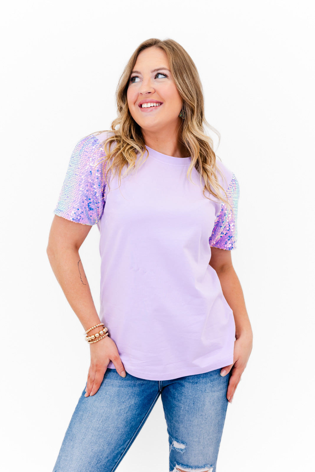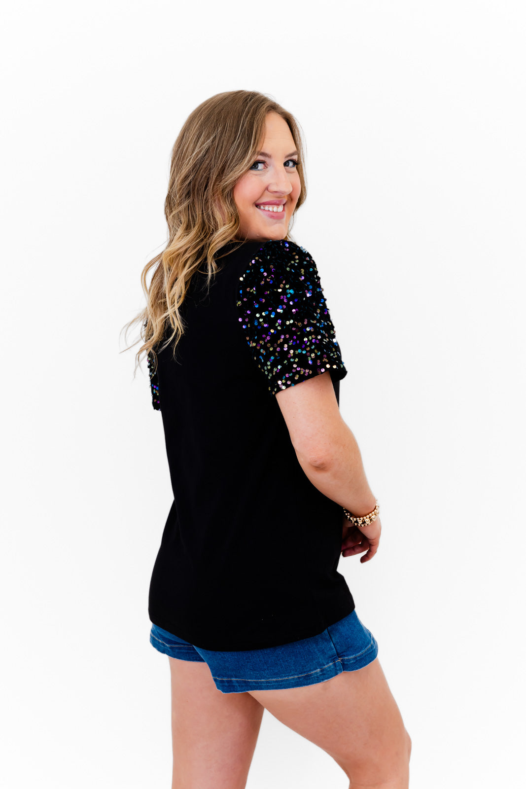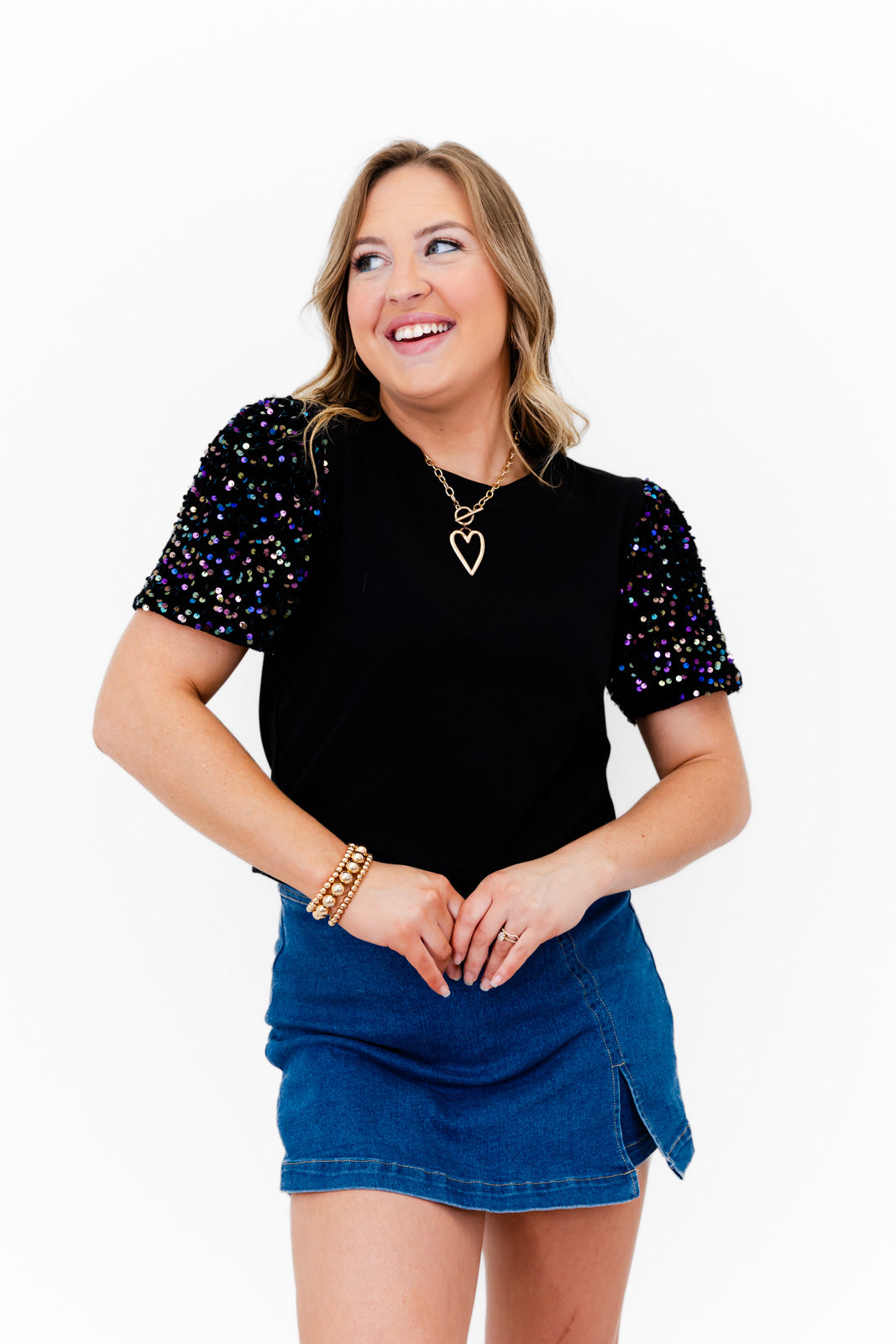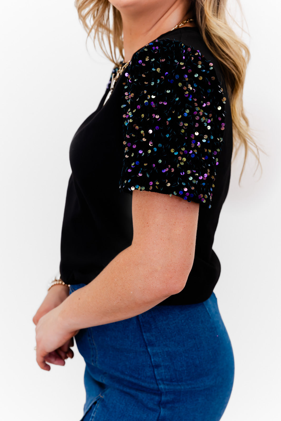 - Our Glitzy Girl Sequin Sleeve top combines classic style with a touch of sparkle courtesy of its sequin sleeves. Perfect addition to your holiday wardrobe for running around town, or a holiday party.