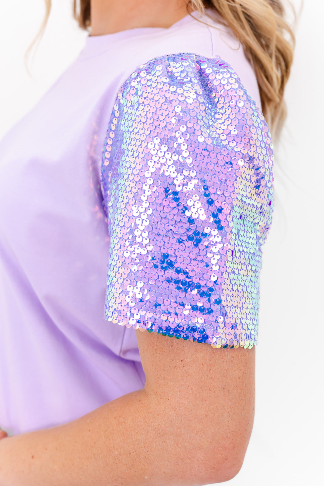 - Features a soft stretchy fabric, a crew neck, a glittery sequin puff short sleeve.