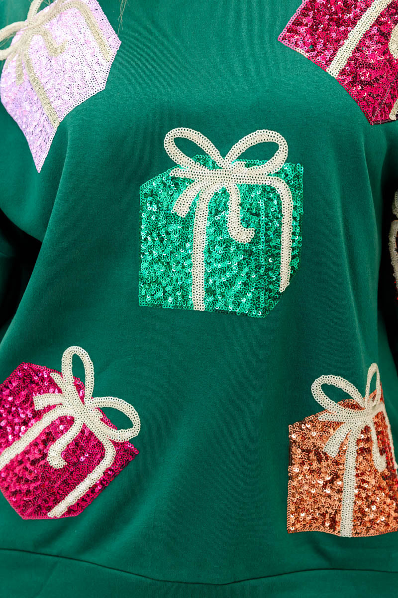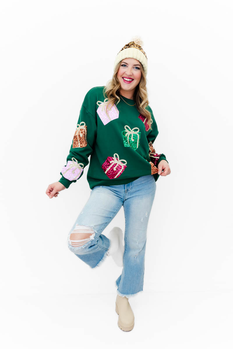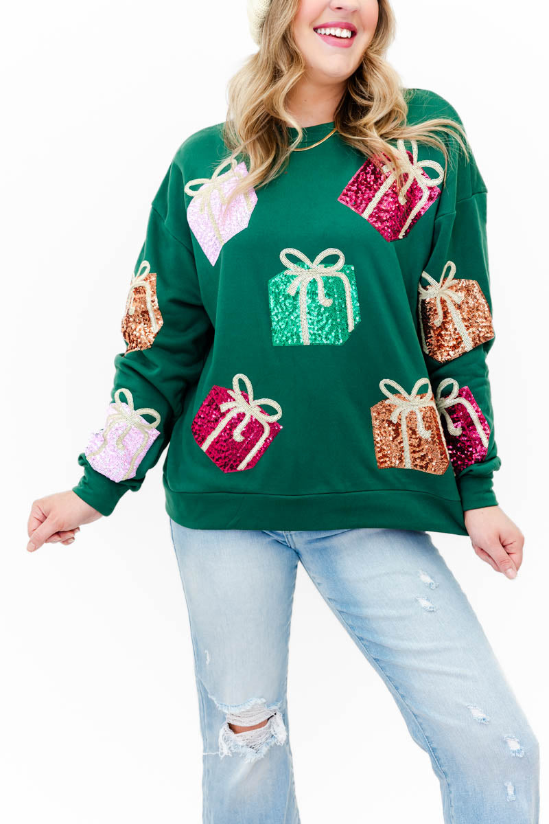 This festive green pullover is covered in colorful sequin gift boxes that shimmer with every move — the perfect mix of cozy and glam. Whether you’re wrapping presents, sipping cocoa, or heading to a holiday party, this sweatshirt keeps the vibes merry and bright!