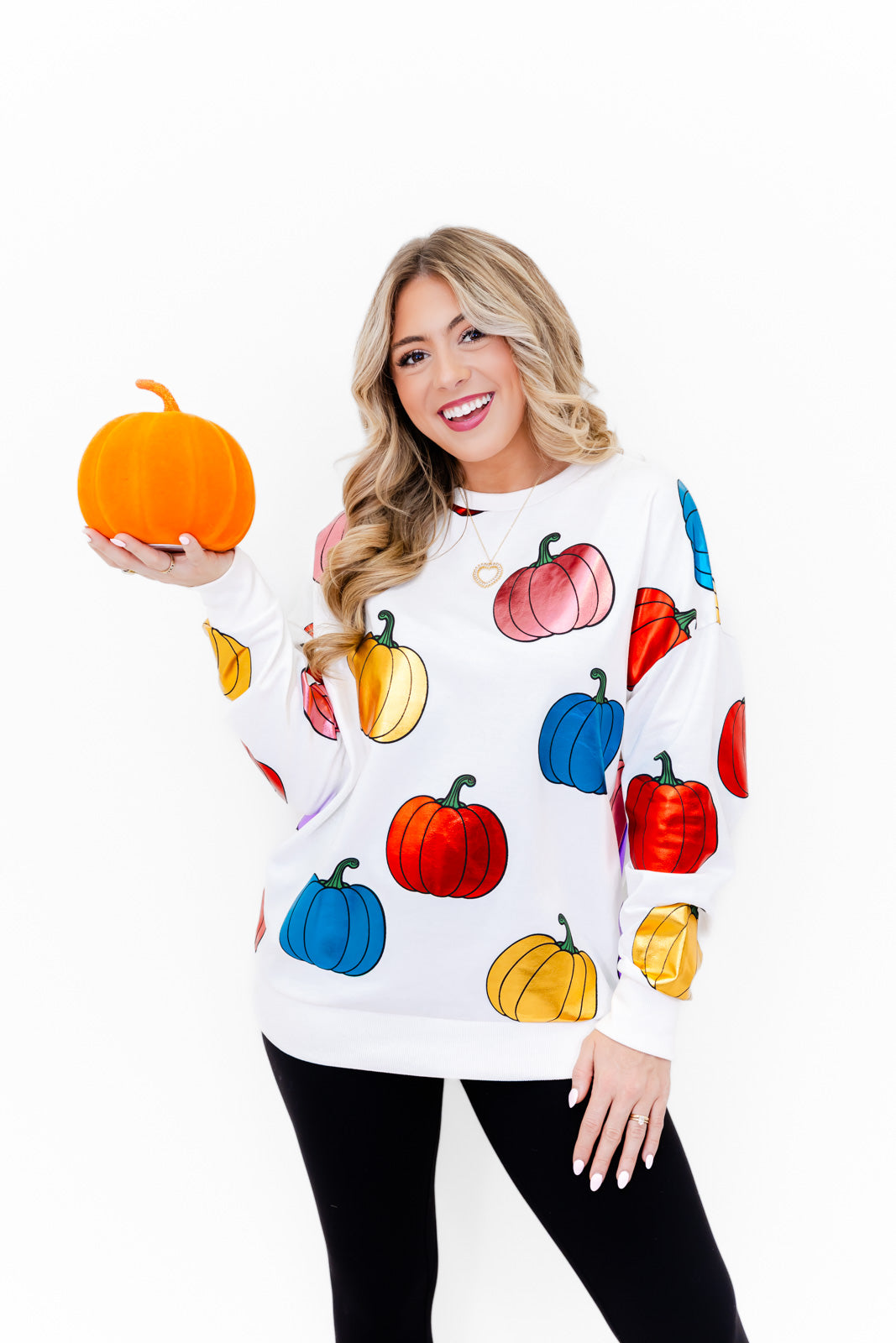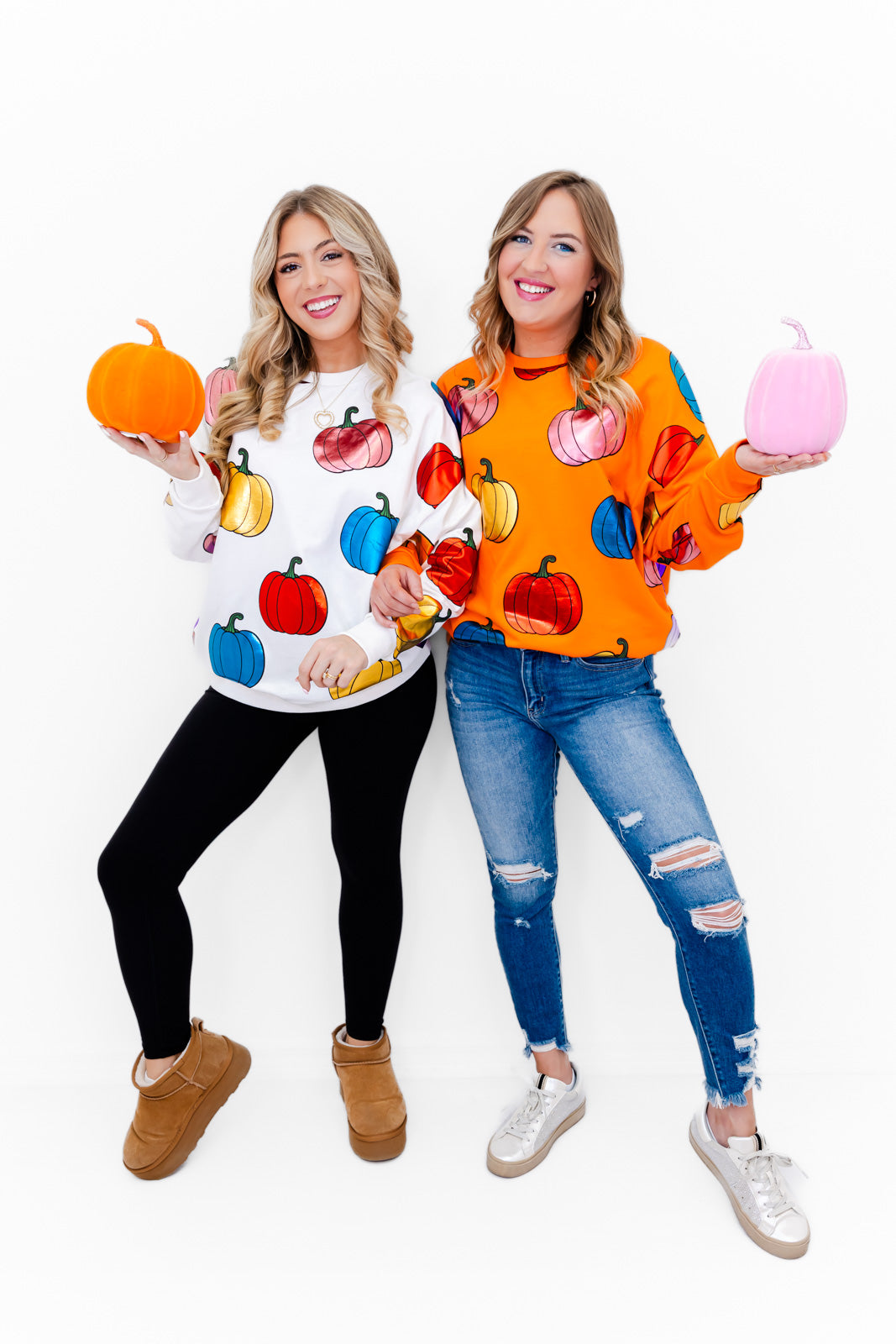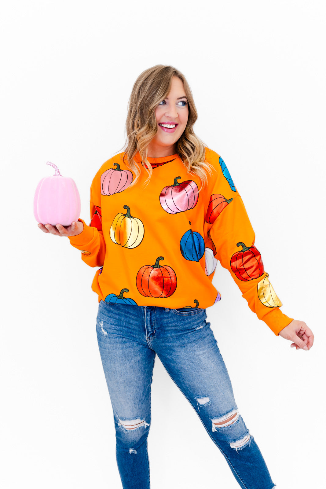 Cozy up in the ultimate fall vibe with our Rainbow pumpkin sweatshirt. This festive piece features foil printed allover pumpkins, making it the perfect blend of comfort and glam. Whether you’re grabbing your favorite latte or heading out for pumpkin patch fun, this sweatshirt will be your go-to all season long.