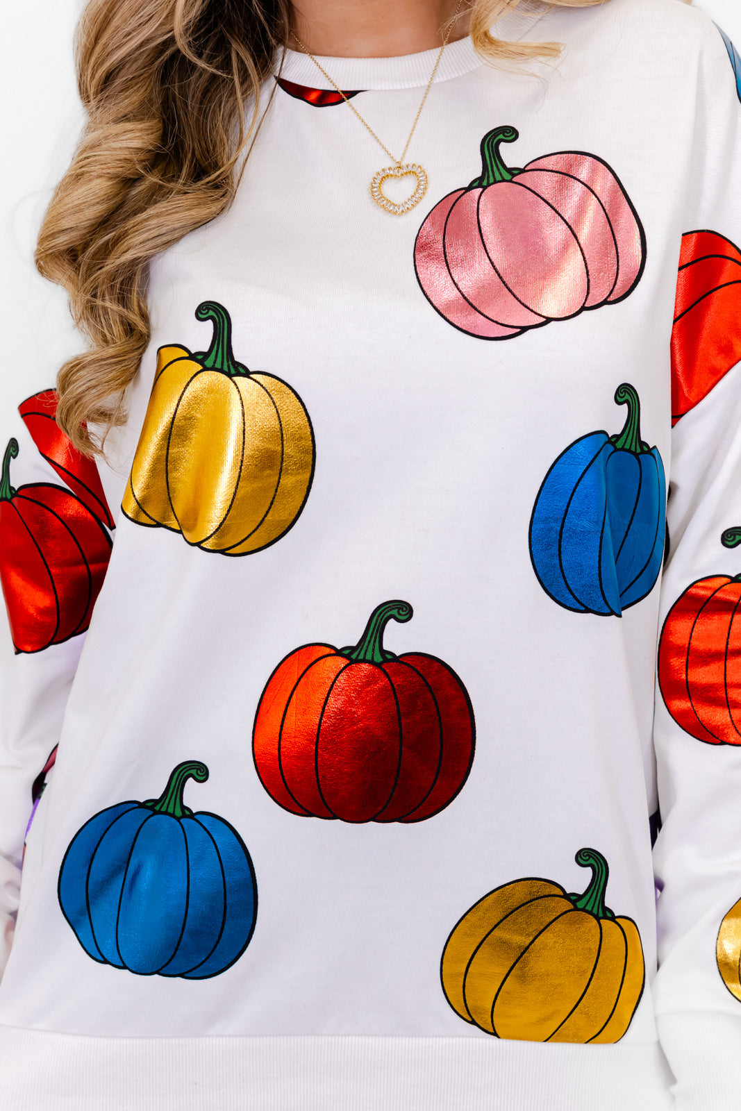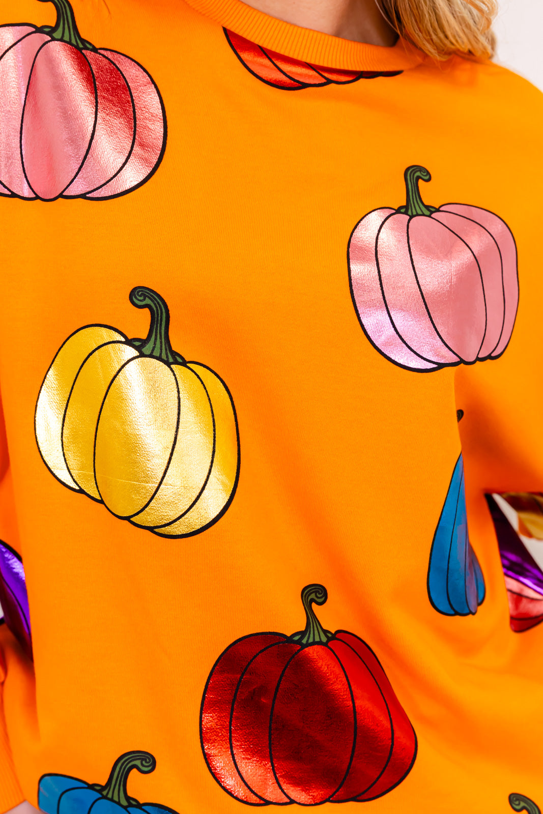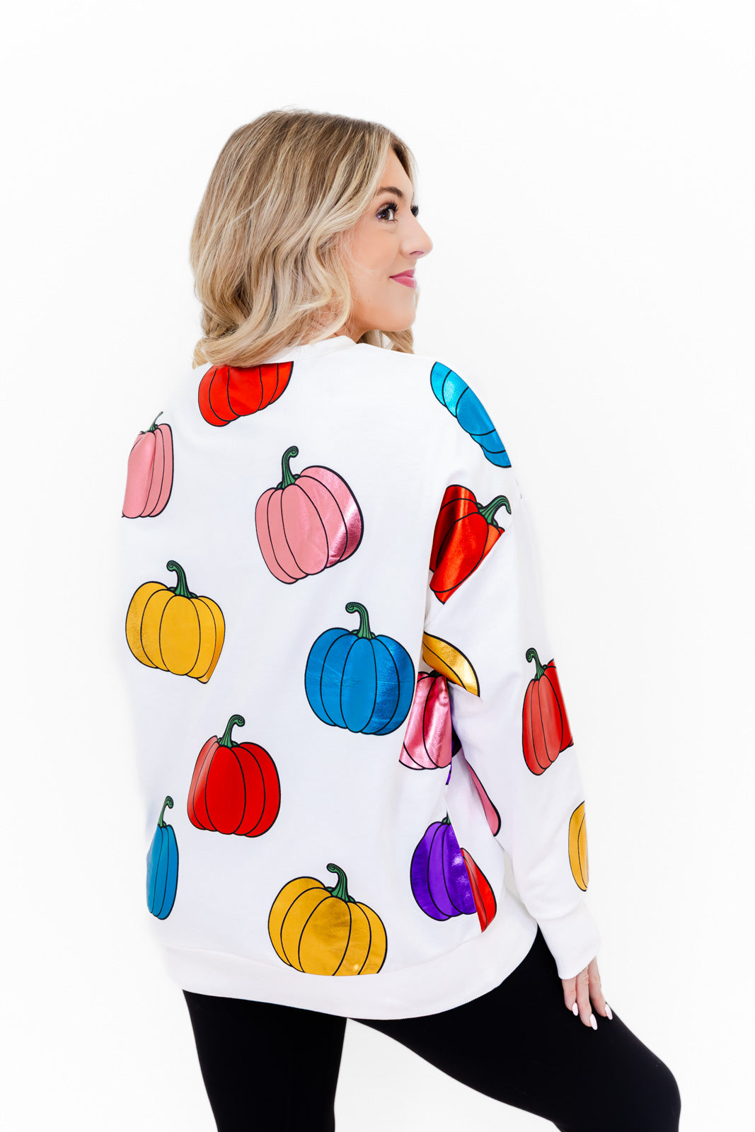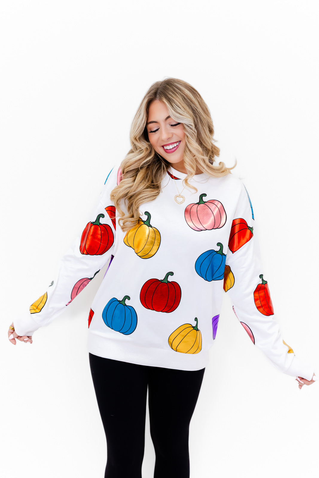 Cozy up in the ultimate fall vibe with our Rainbow pumpkin sweatshirt. This festive piece features foil printed allover pumpkins, making it the perfect blend of comfort and glam. Whether you’re grabbing your favorite latte or heading out for pumpkin patch fun, this sweatshirt will be your go-to all season long.