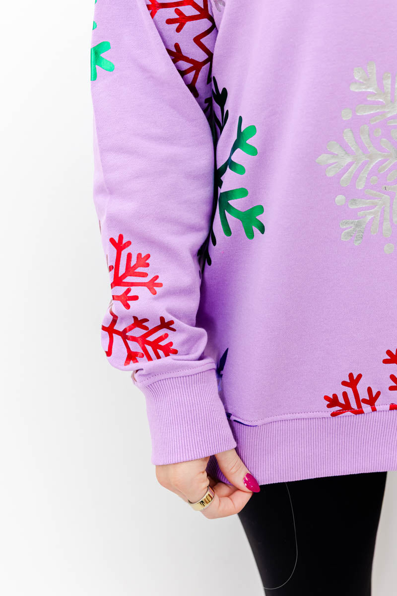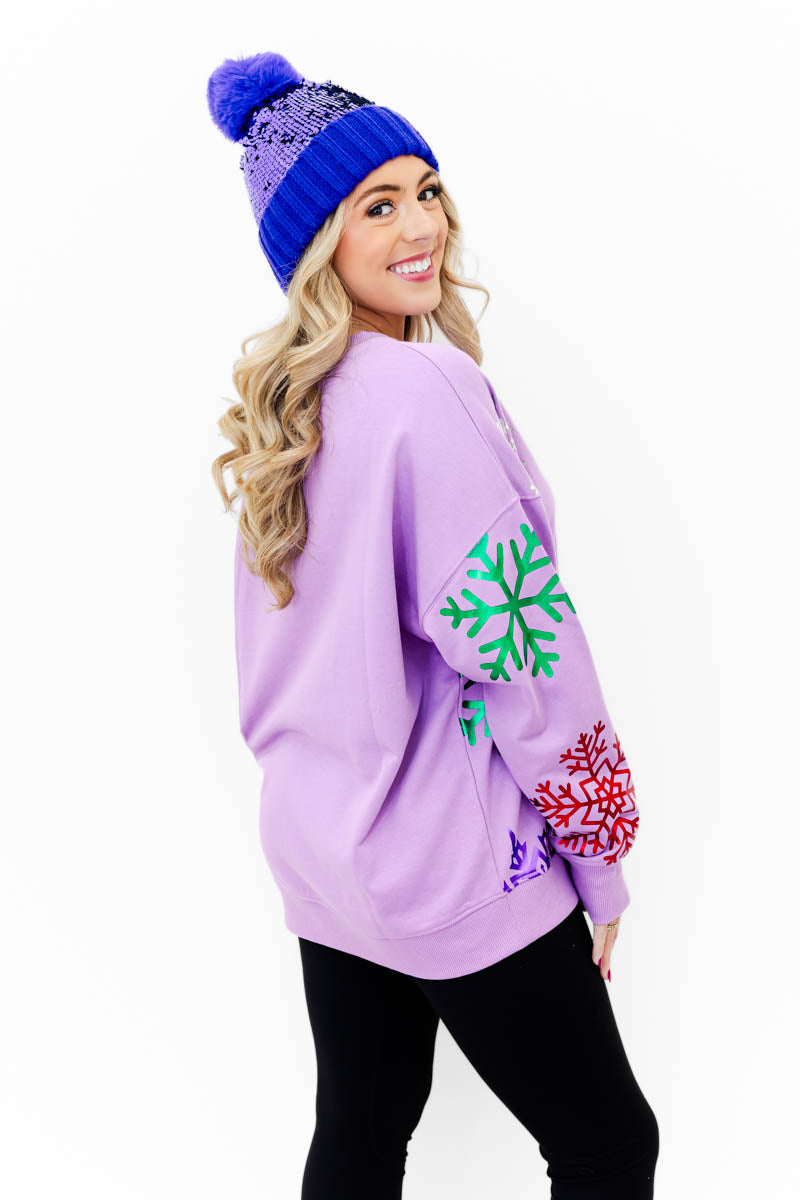 This festive favorite is made to brighten your winter days — featuring bold, colorful foil snowflakes that shimmer with every move. Perfect for holiday outings, cozy nights in, or festive photos with your besties, this sweatshirt adds just the right amount of magic to your cold-weather style. -