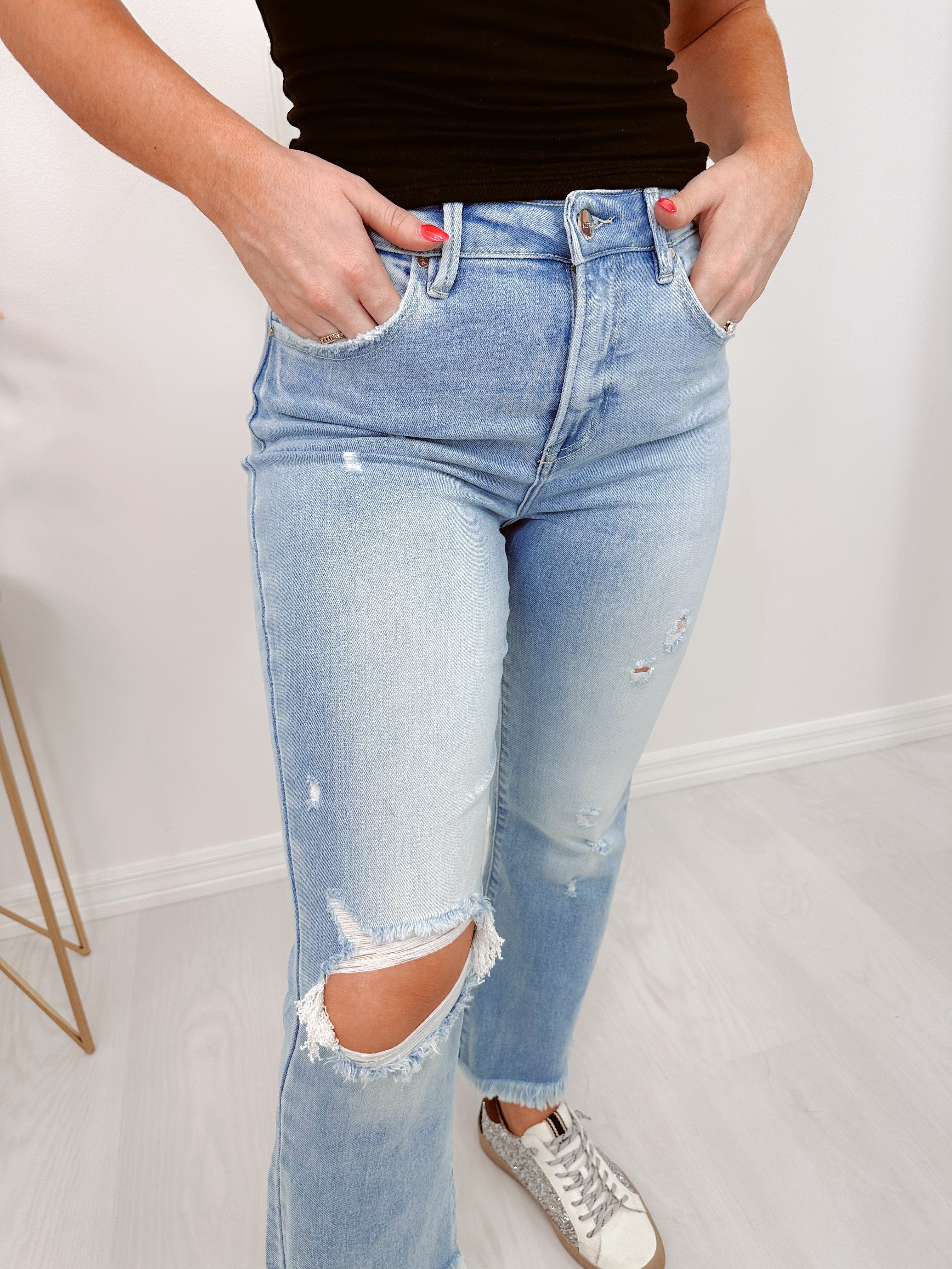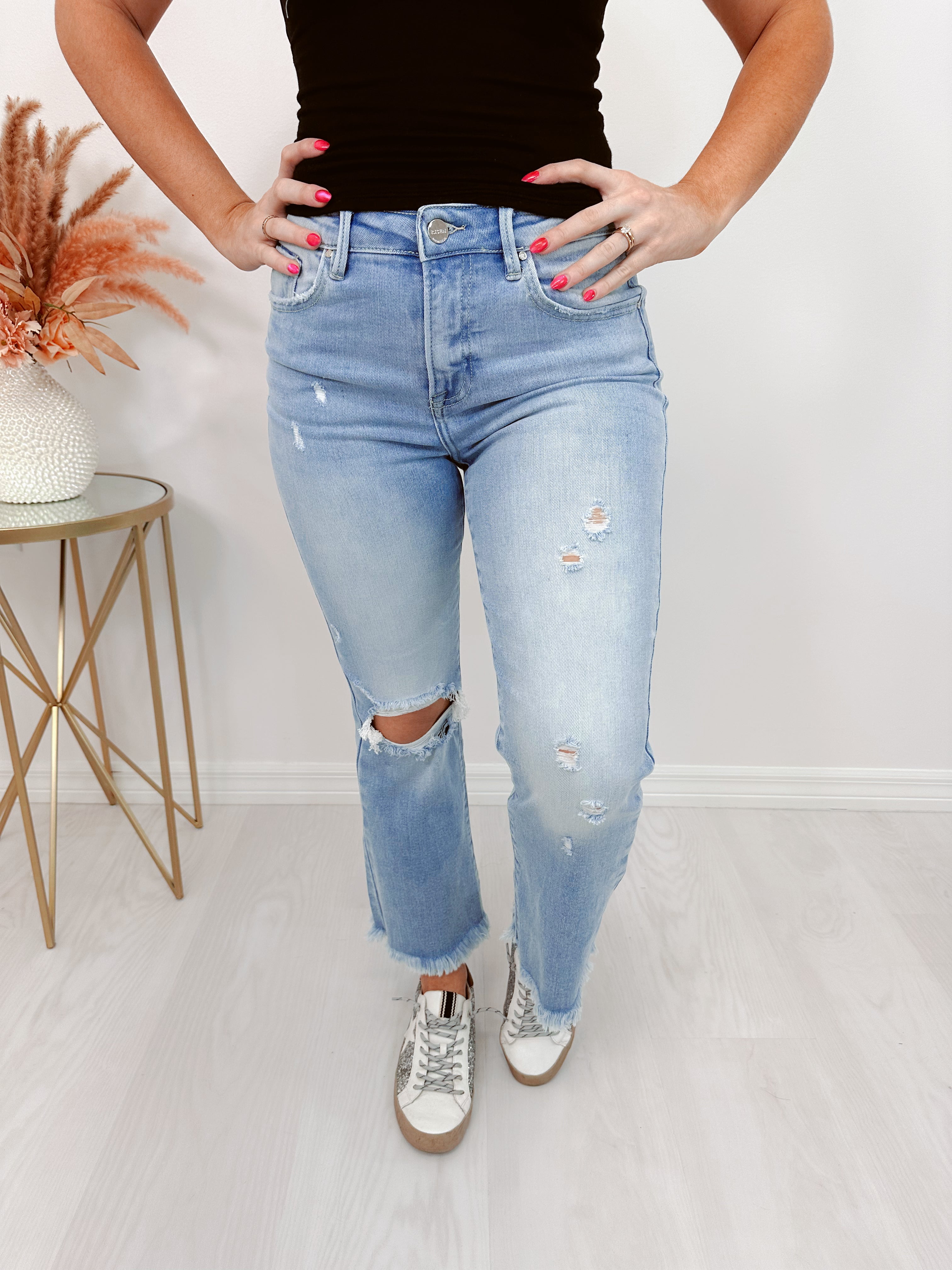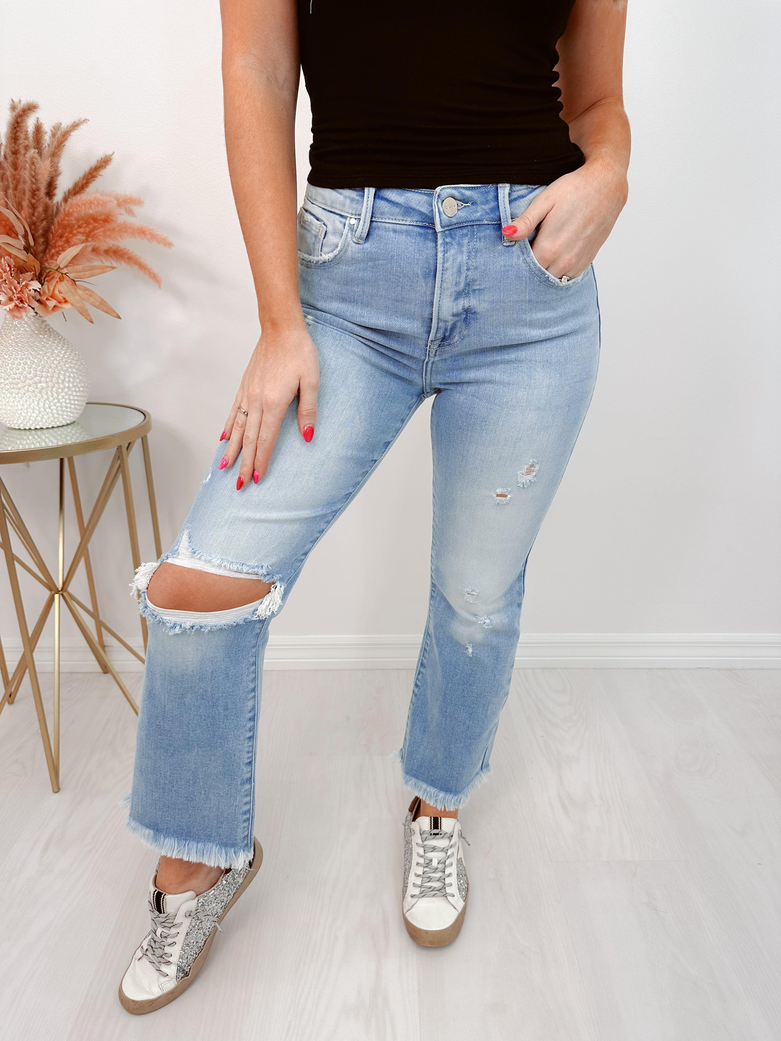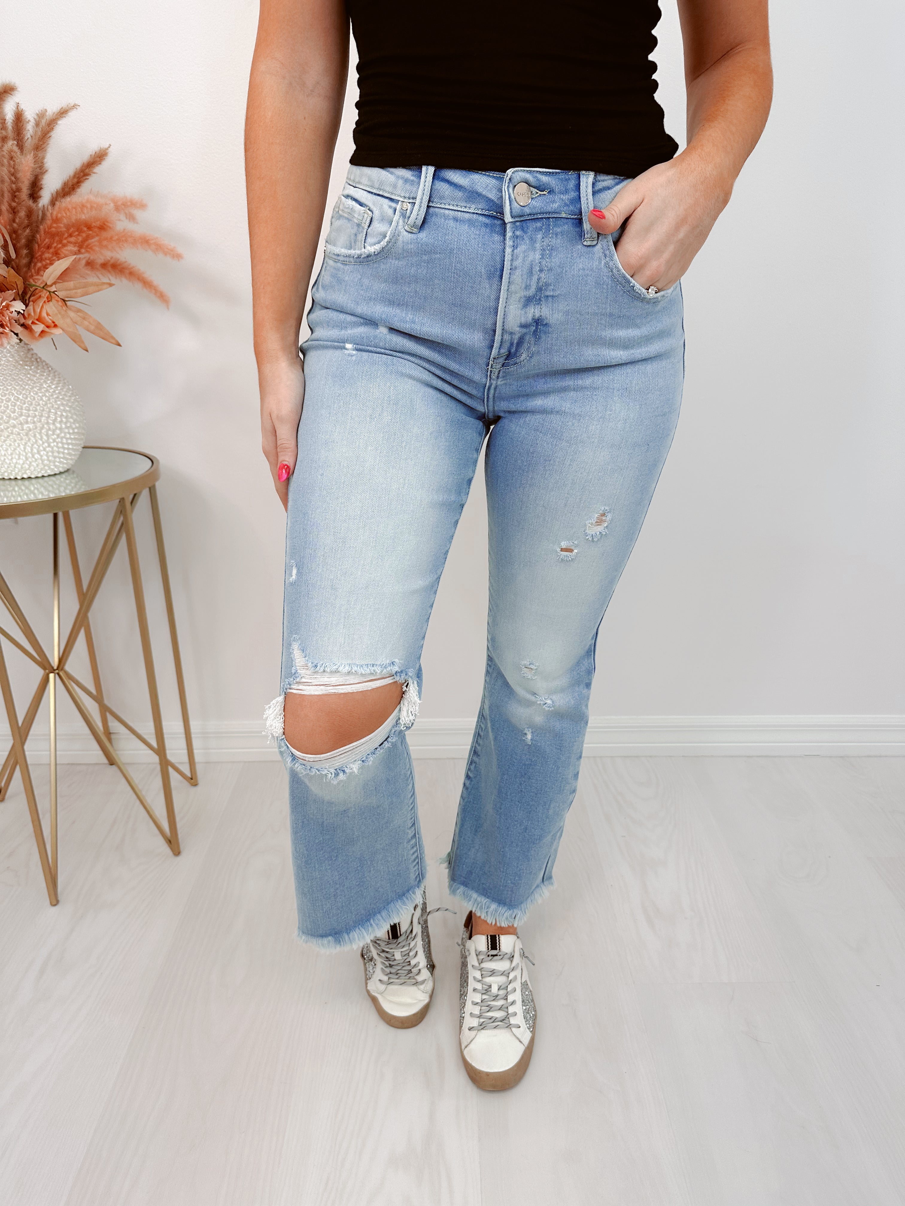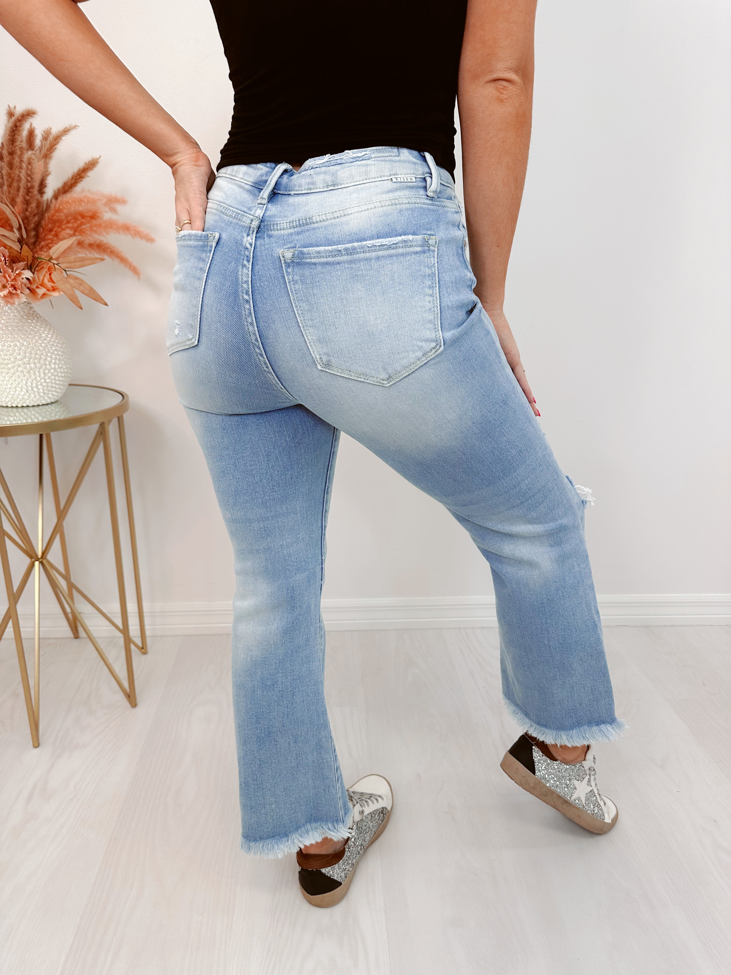 - Our Hustler High Rise Crop Frayed Jeans are a super trendy item to add to your denim collection. These high rise crop bootcut jeans will pair perfectly with a fitted tee and heels to complete a super cute OOTD.
