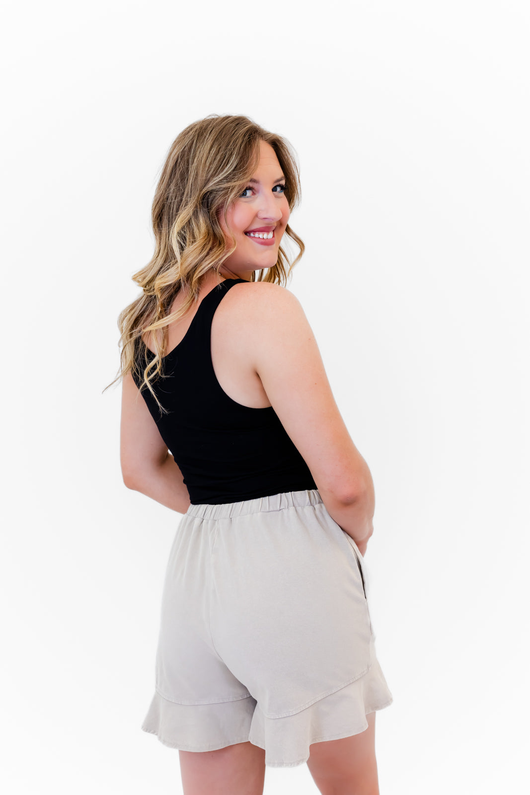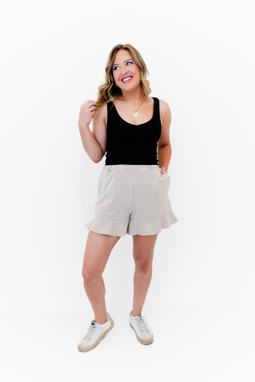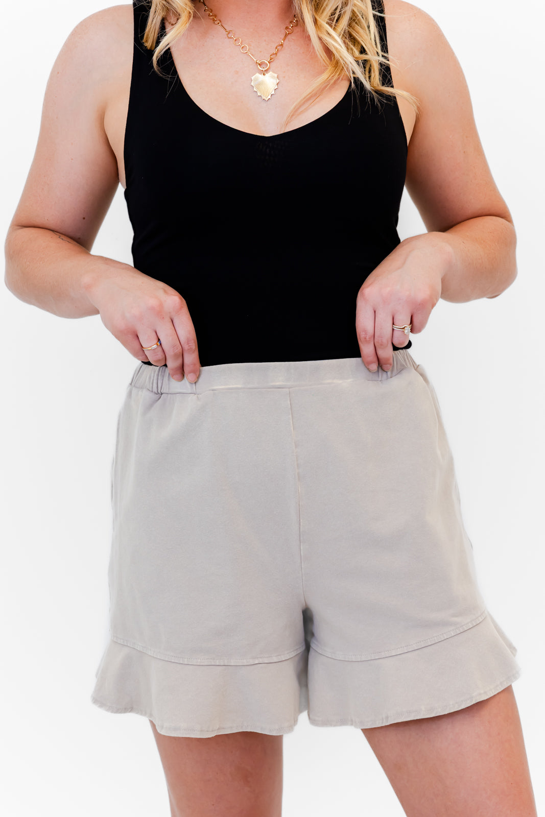 • Slip into comfort with a side of charm in our Frilly Hem Mineral Wash Shorts. These mineral-washed comfy shorts feature a relaxed fit and a flirty ruffle hem that elevates your casual OOTD. Whether you're styling these with a cropped tee, a cozy pullover, or a graphic tee, these shorts are a must have.