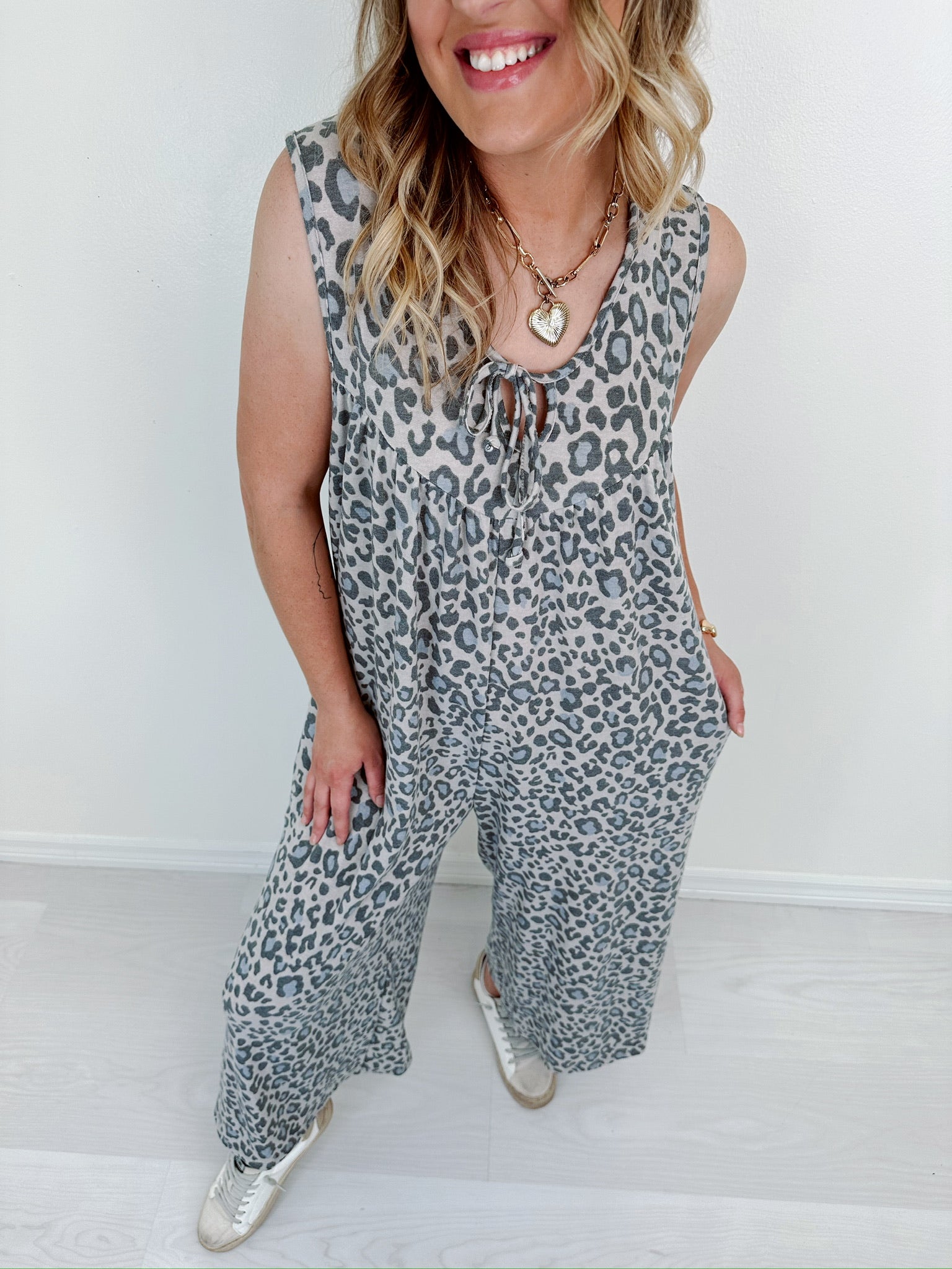 - Features a super soft leopard print fabric, a scoop neck with self-tie peek-a-boo detail, sleeveless, a flowy gathered seamed bust and back yoke, and wide eg pant with side slit pockets.