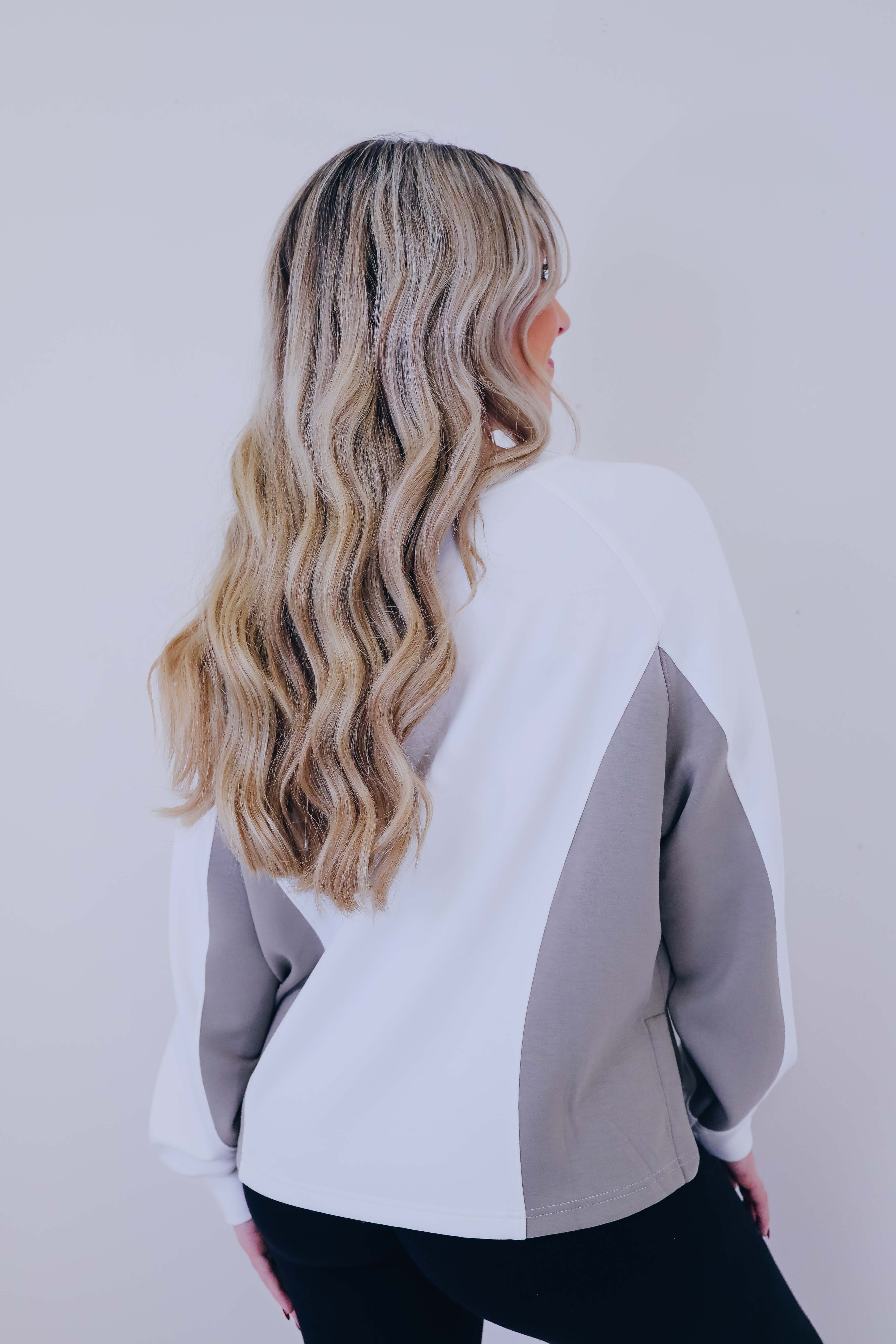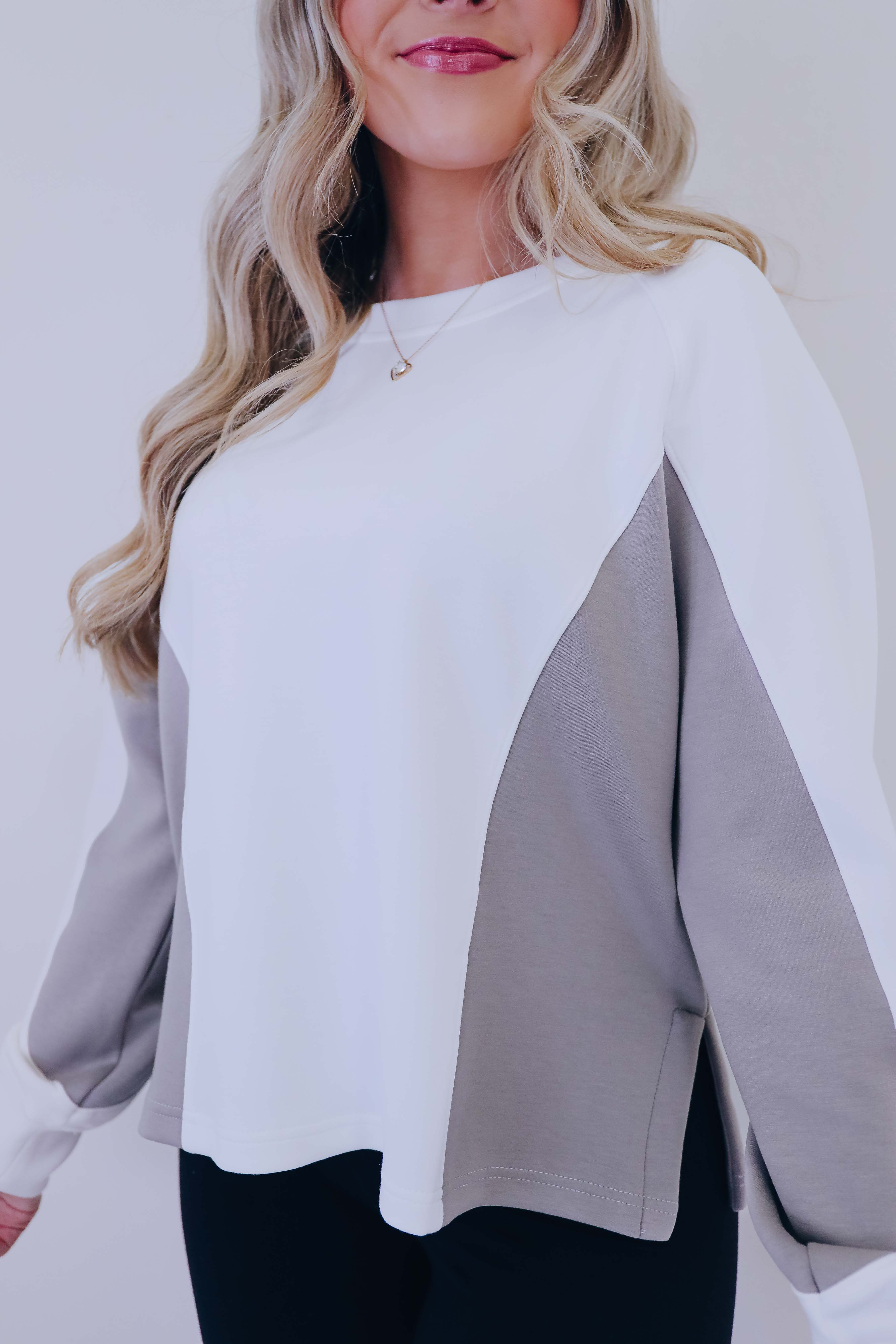 - Featuring a super soft knit fabric, a round neck, a raglan full length sleeve with banded cuff, a side slit hem, and is completed with with a flattering grey and ivory colorblock design.