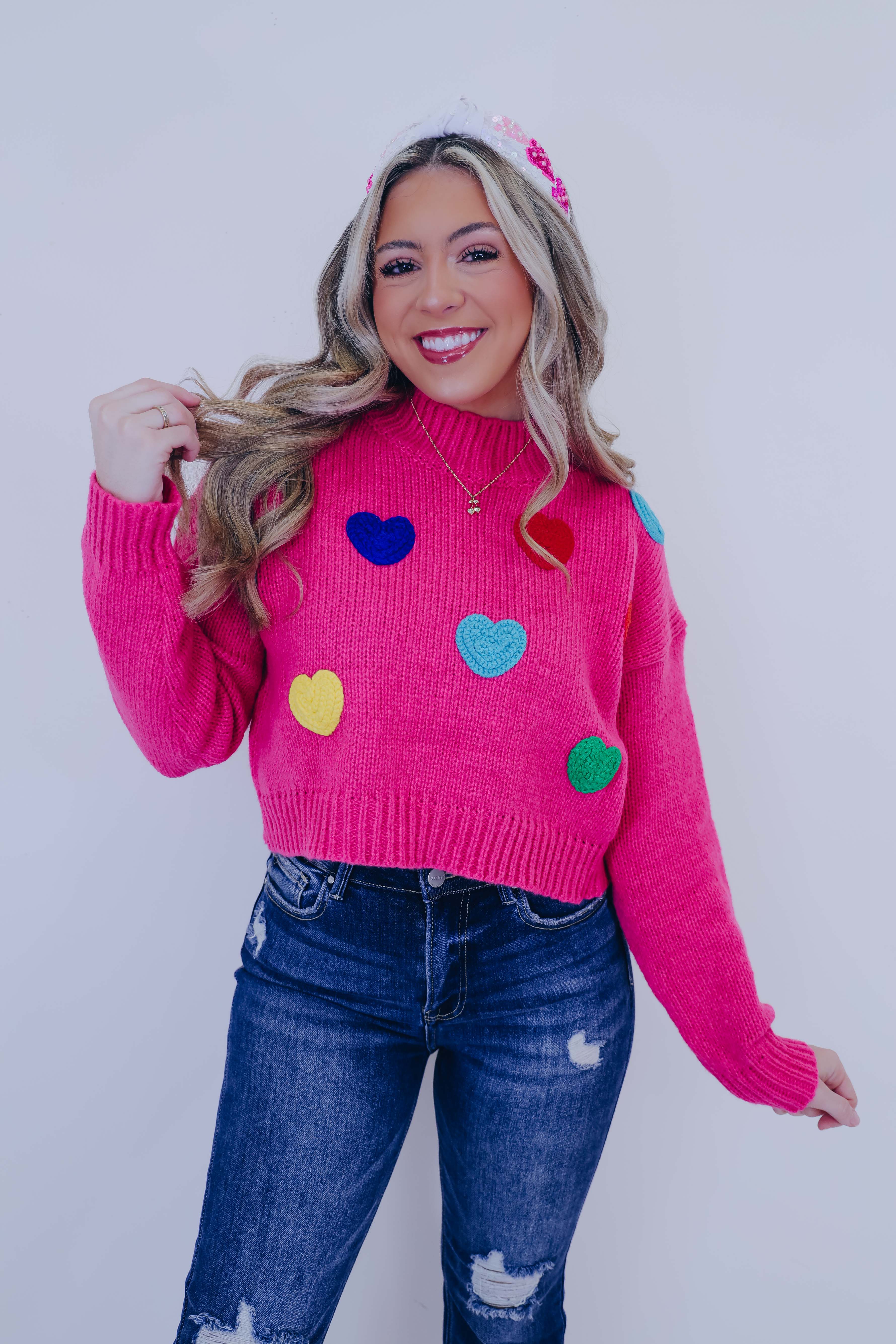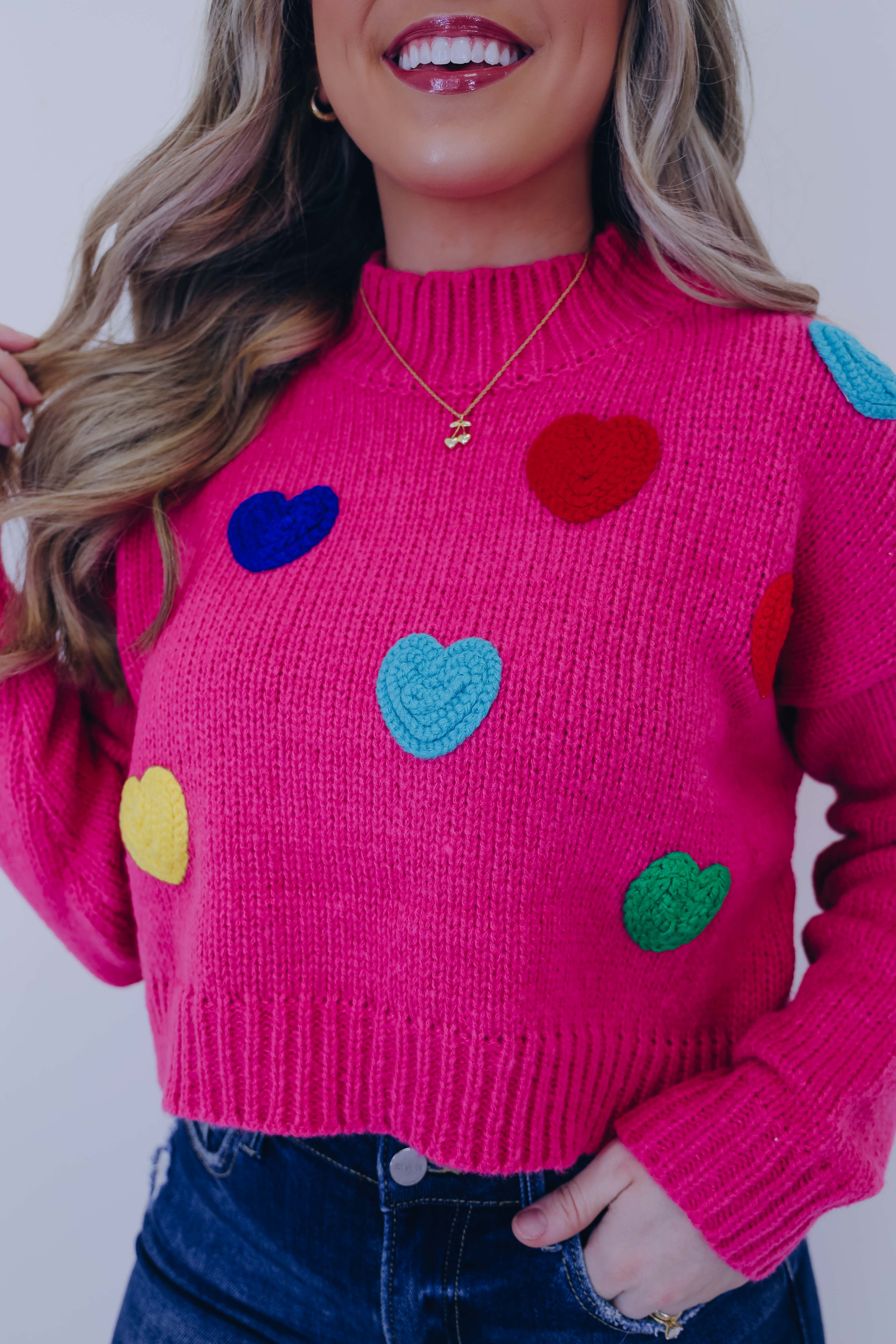 • Featuring a soft knit fabric, a ribbed mock neck,  drop shoulder long sleeves with ribbed cuff, a  cropped ribbed hem, and is completed with multi-color 3D  braided hearts embellishing the front.