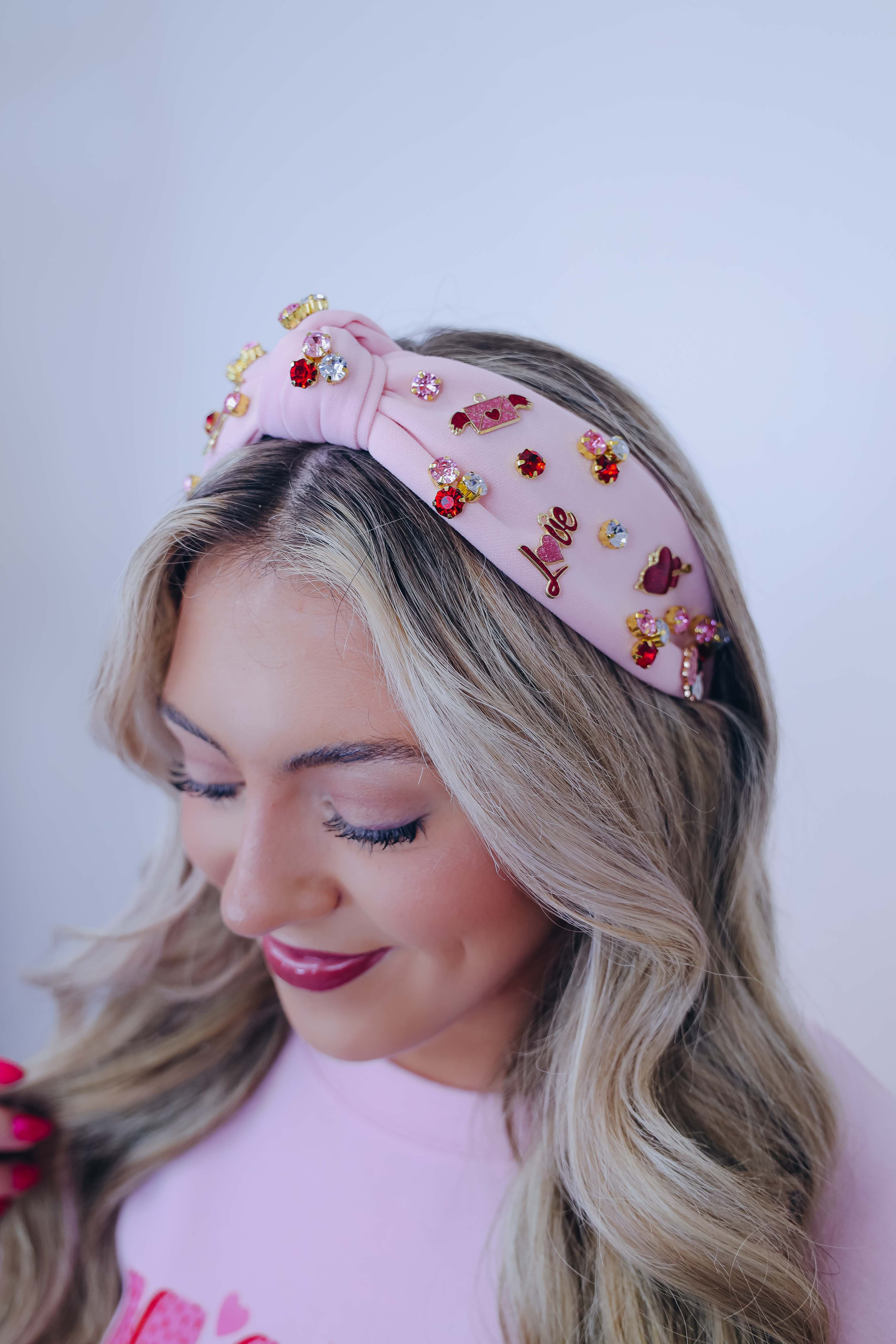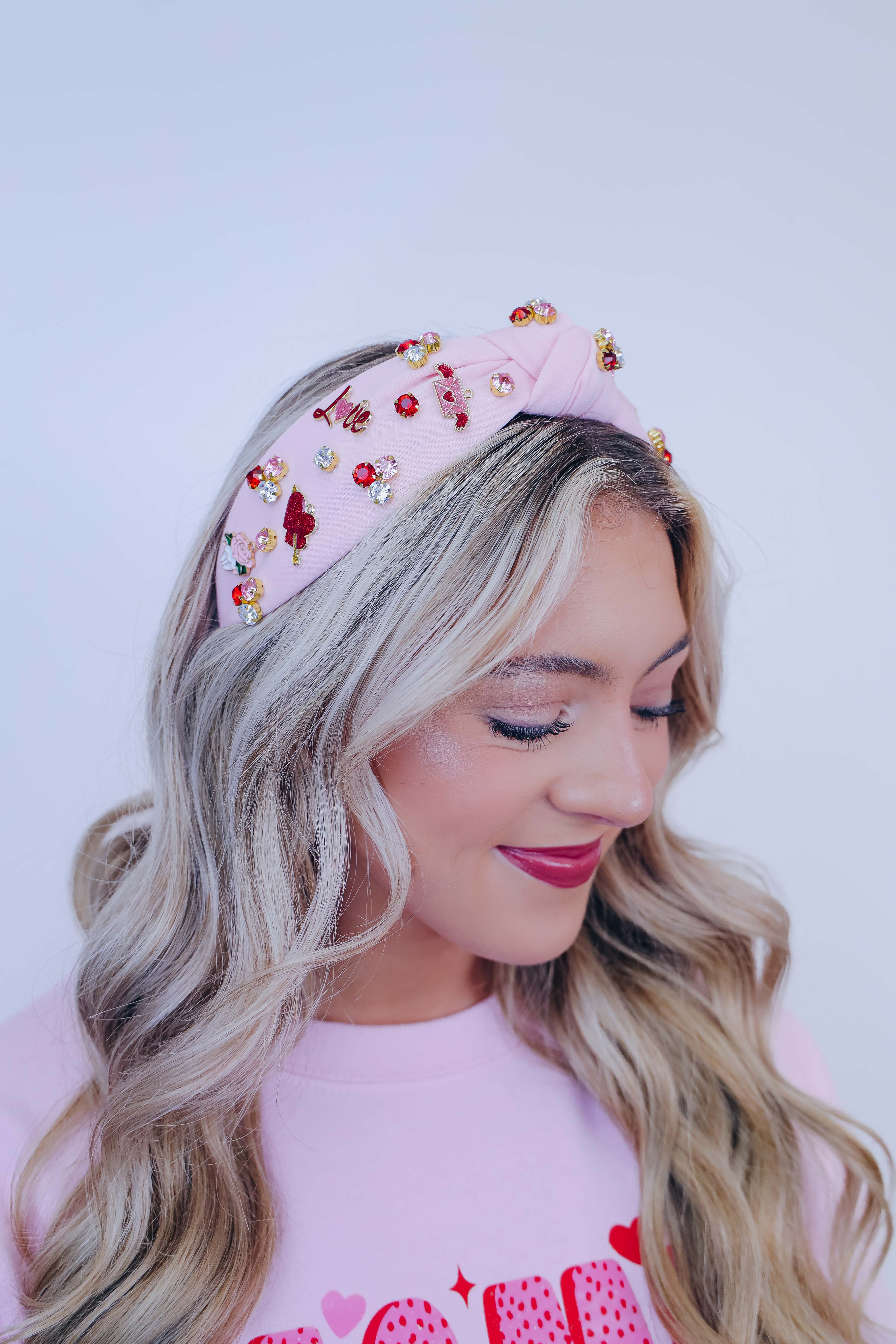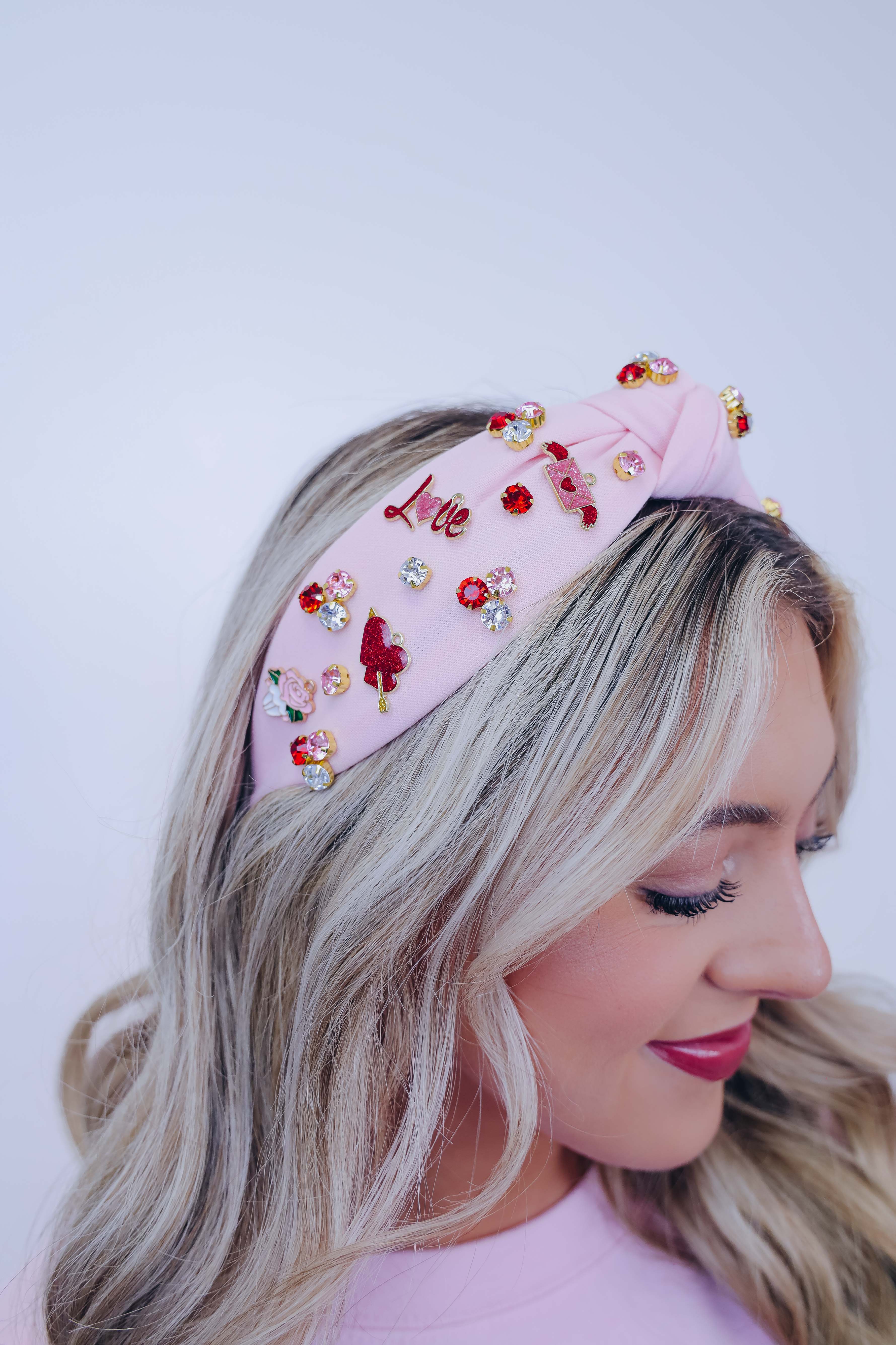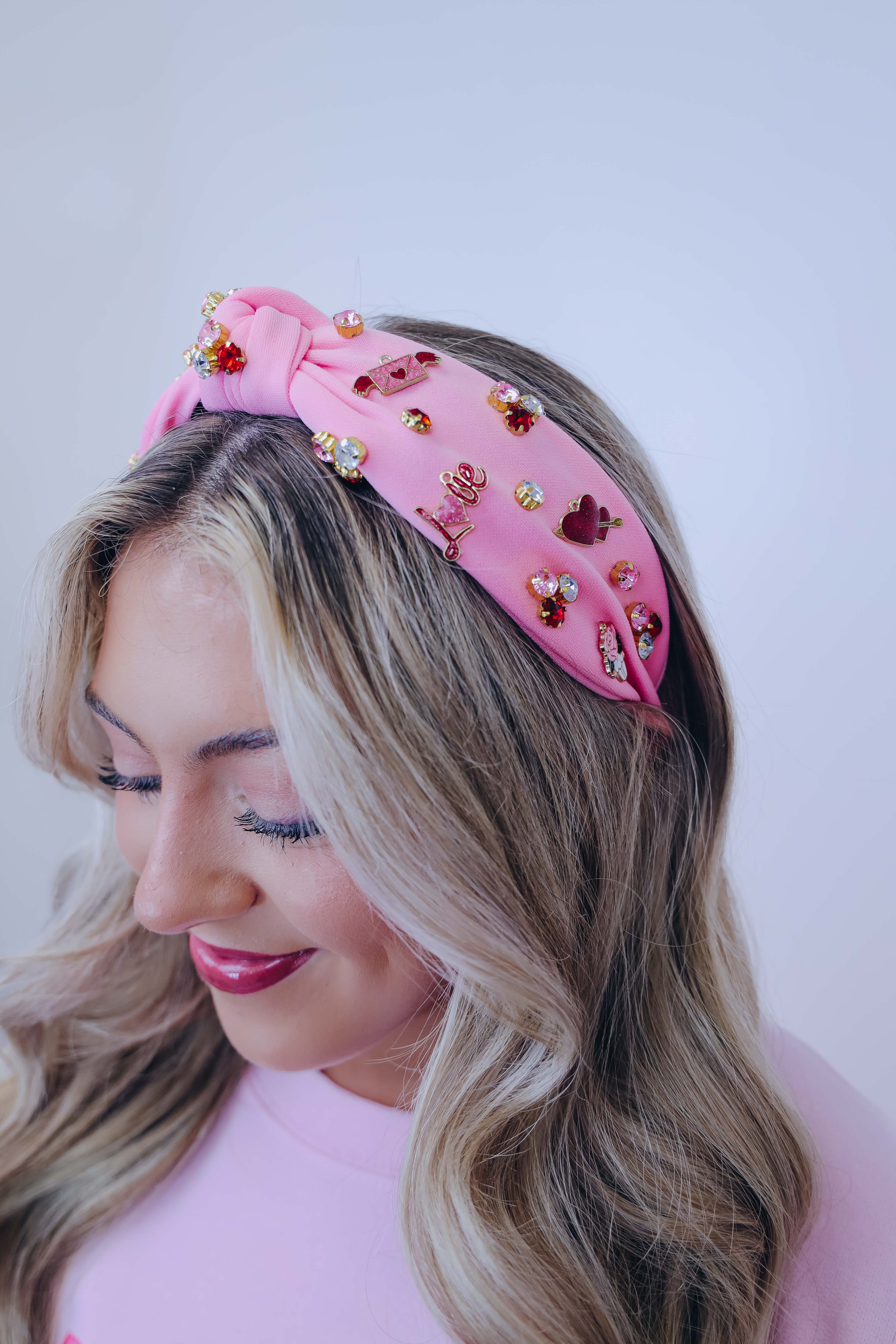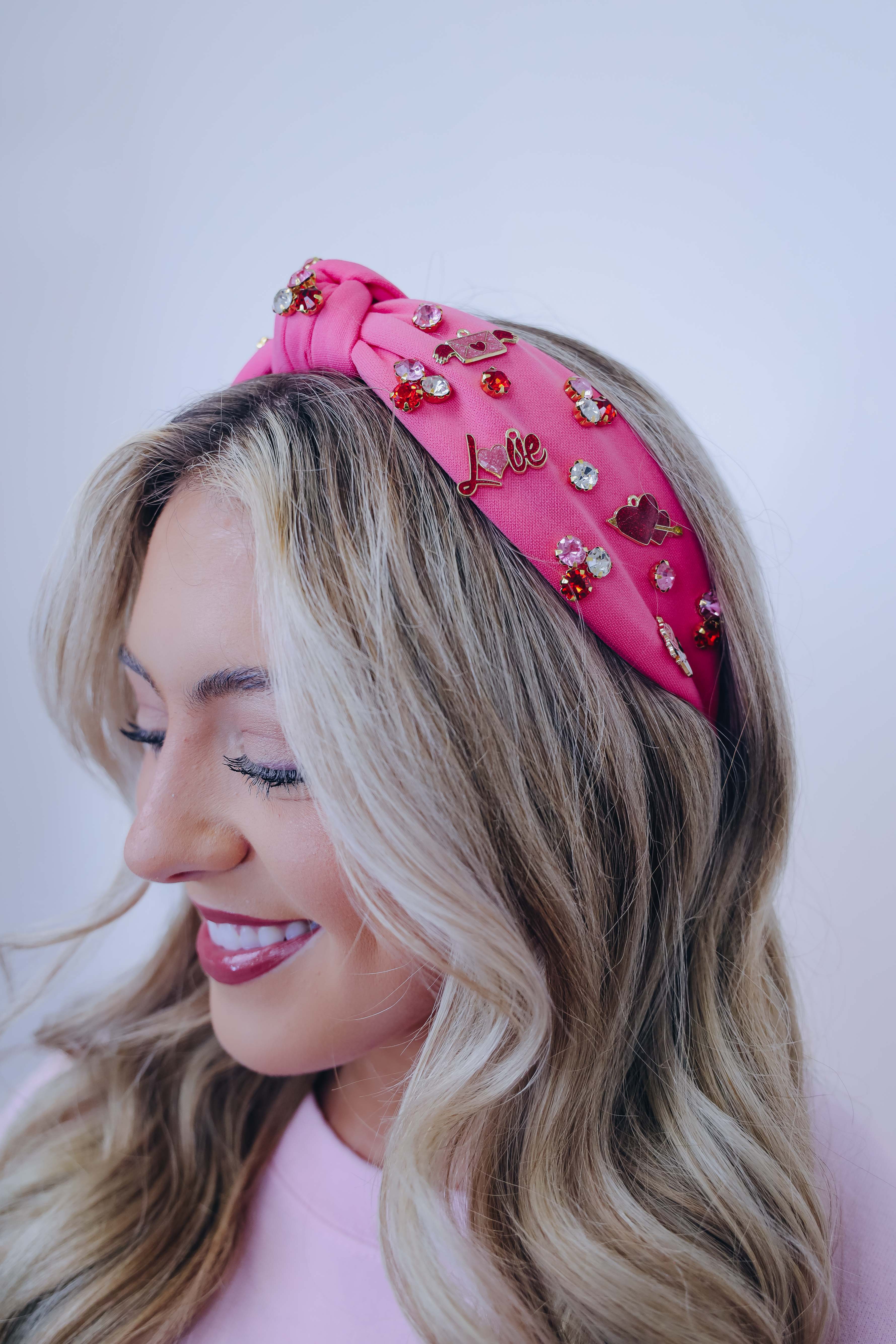 • Featuring a knotted headband adorned with colorful stones and charms including hearts with a arrow through it, roses, "love", and a love letter.