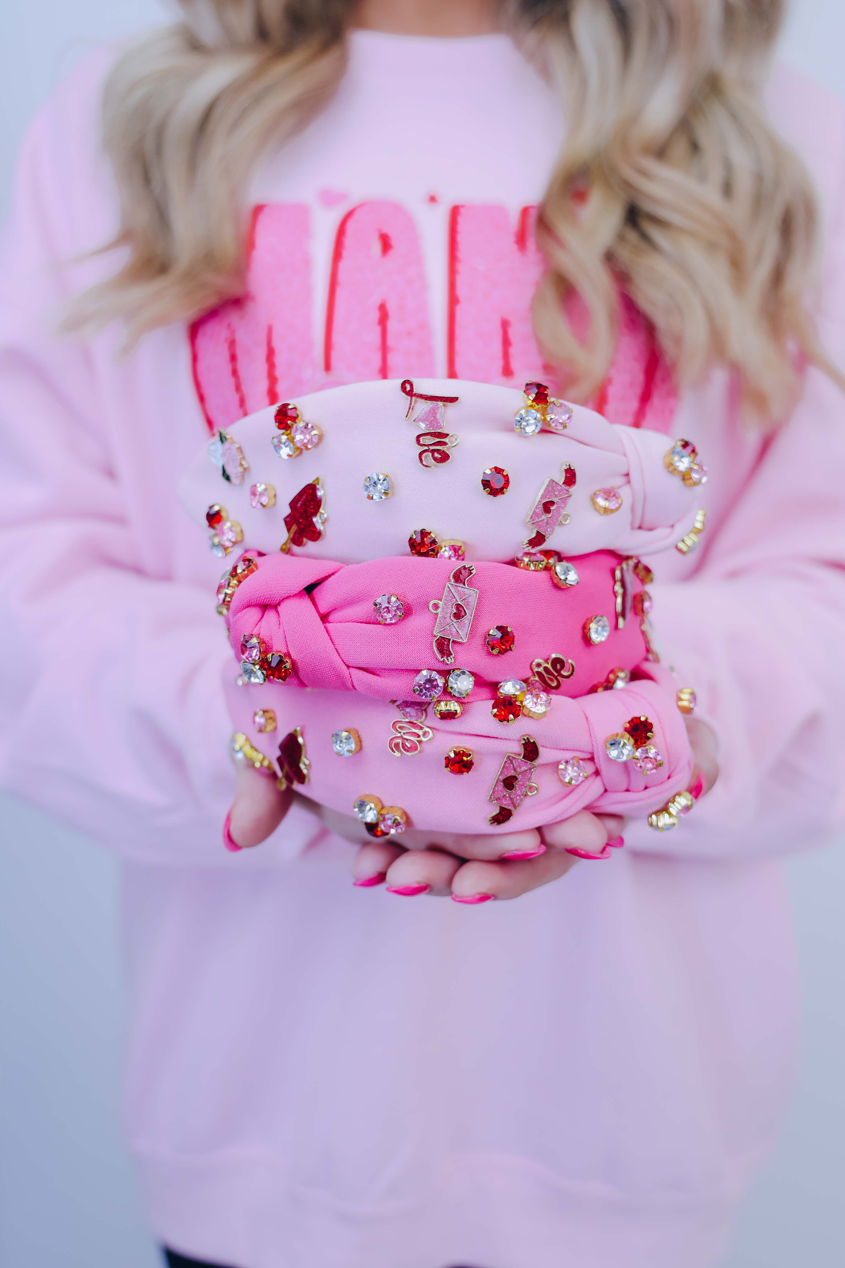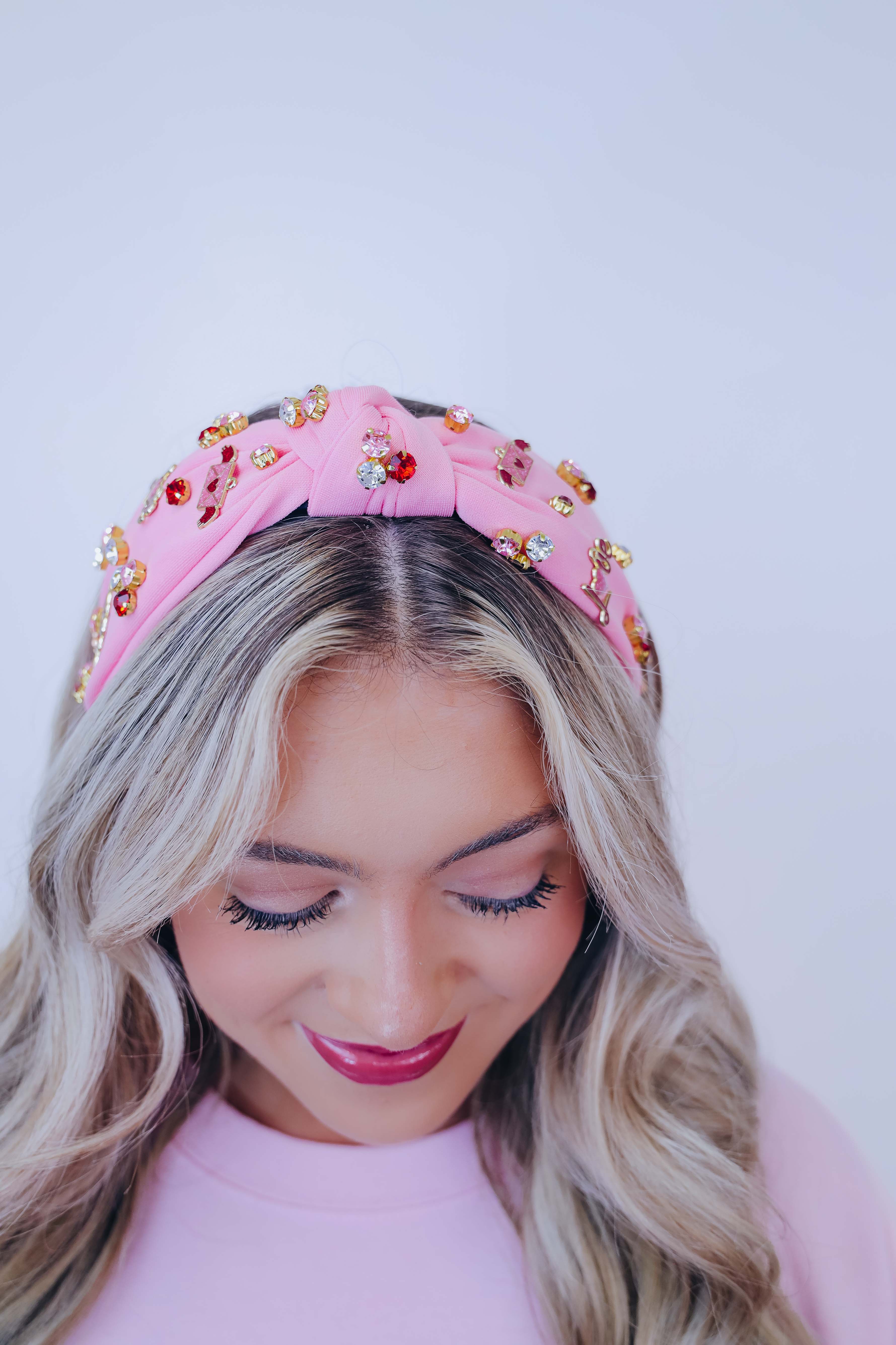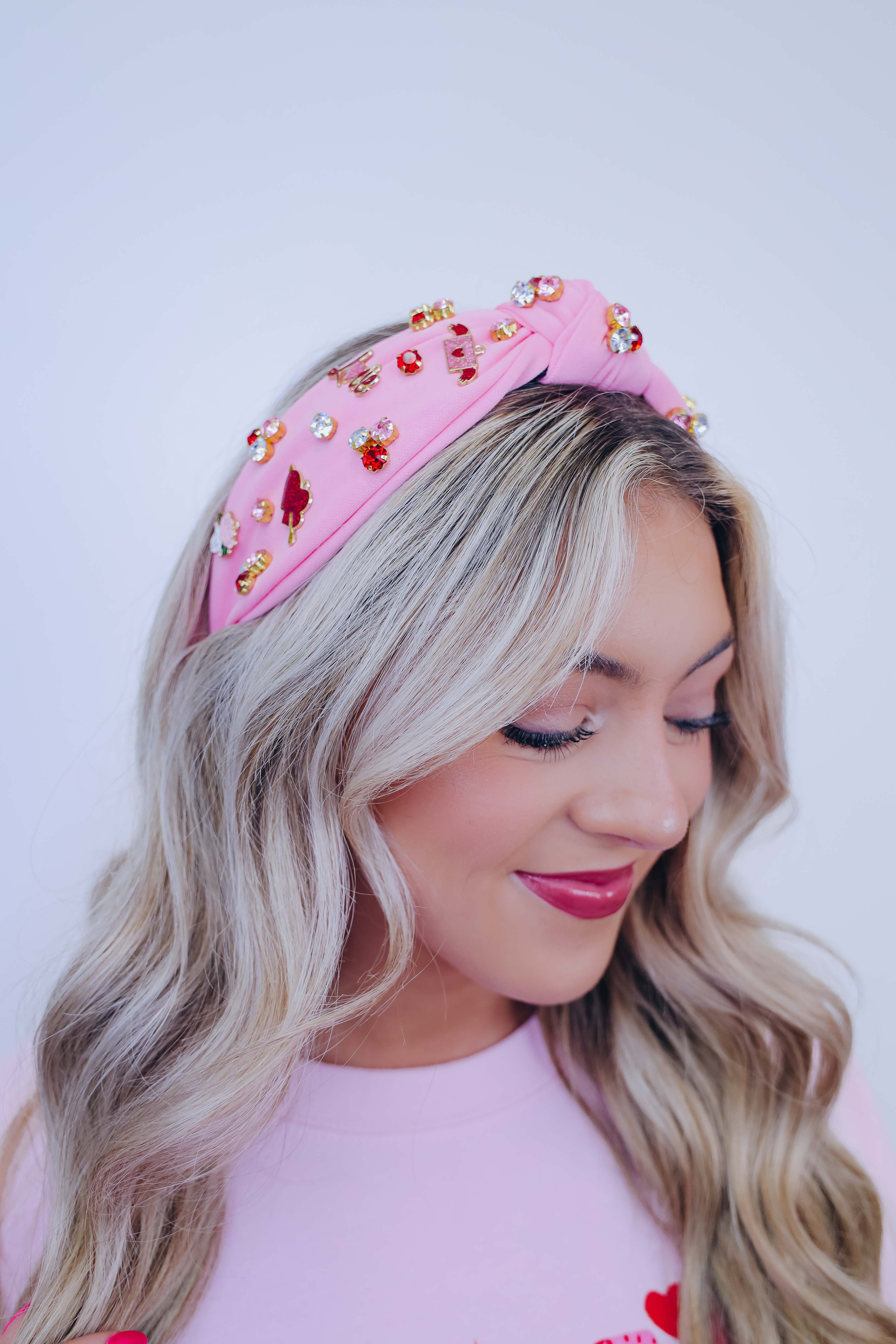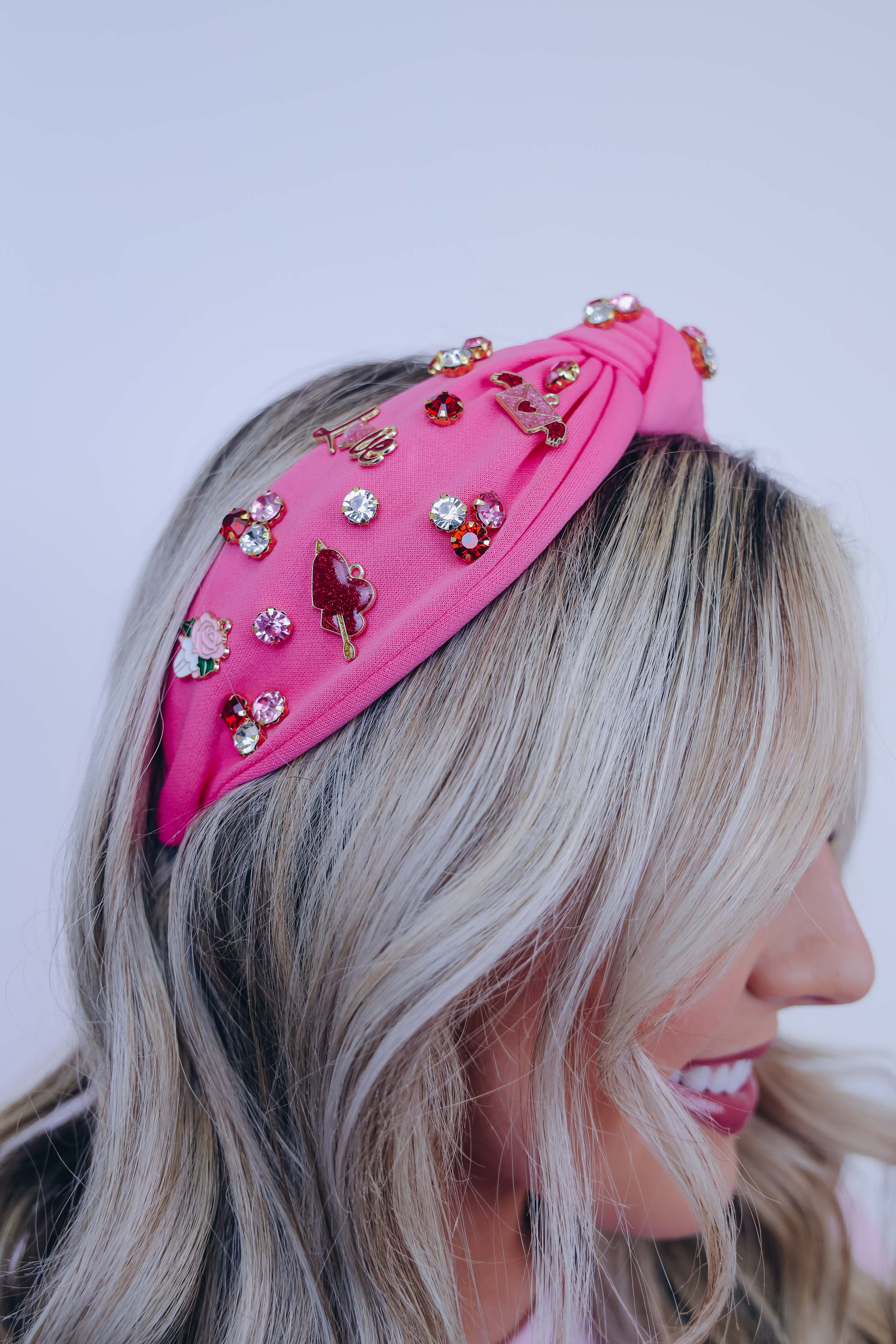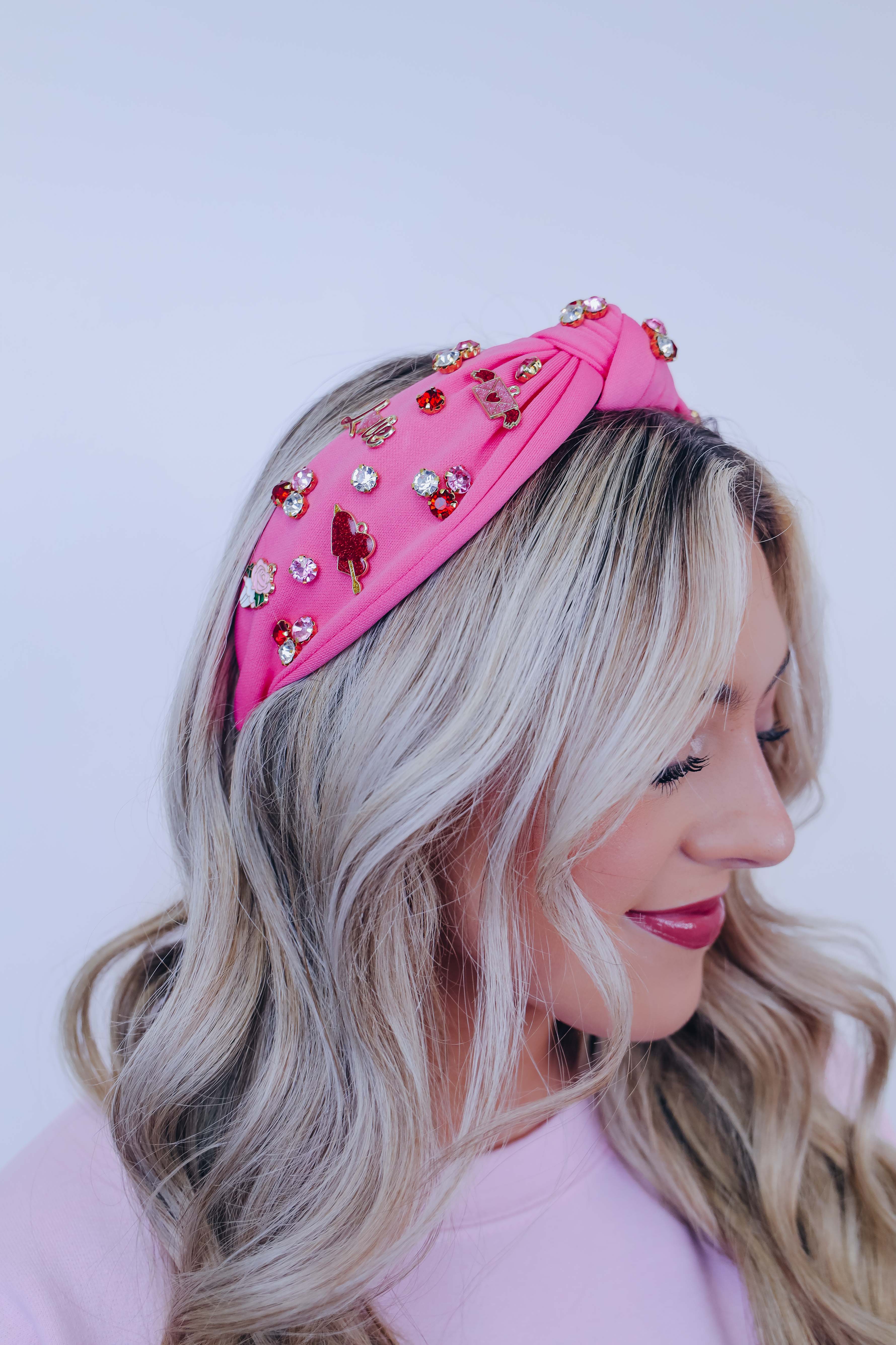 • Featuring a knotted headband adorned with colorful stones and charms including hearts with a arrow through it, roses, "love", and a love letter.