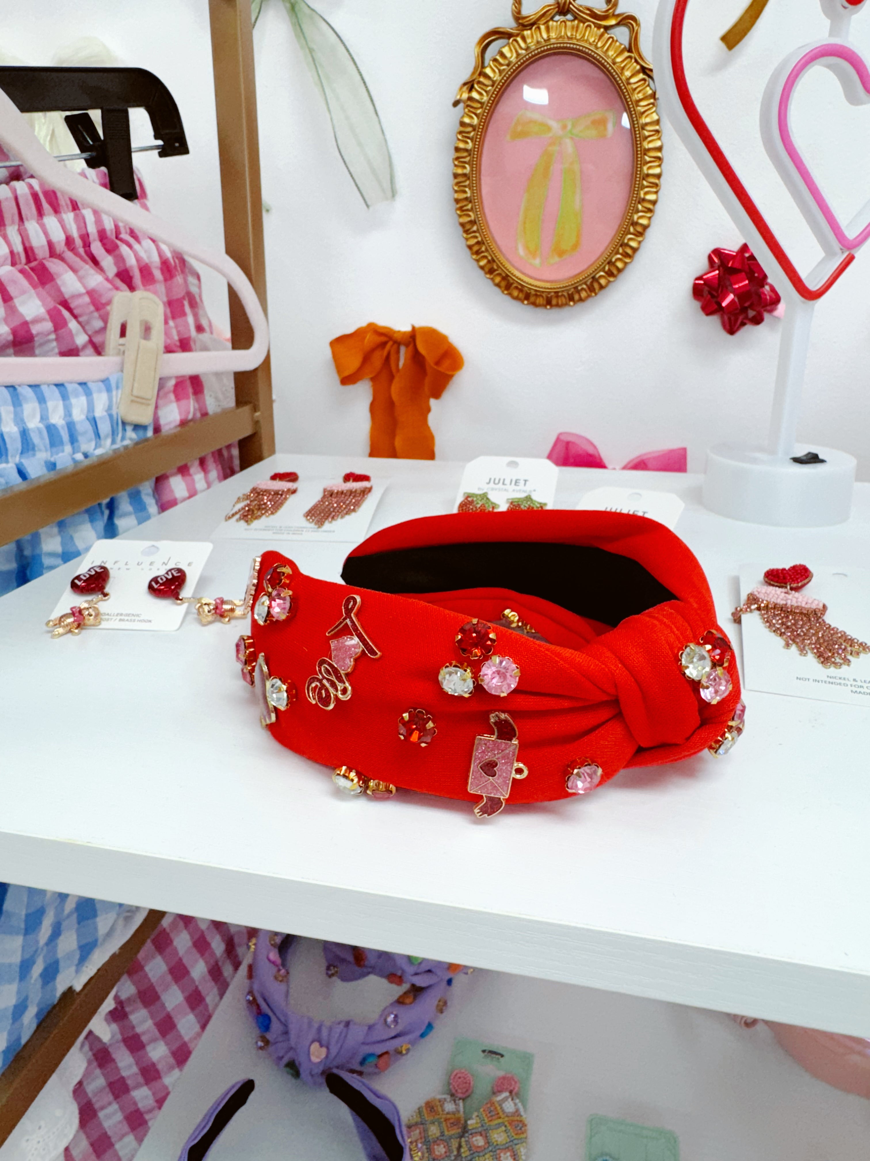 • Add a pop of color and charm to any outfit with our Pinned My Heart Jeweled Headband! This headband is the perfect statement piece to wear on your next date or girls' night out!