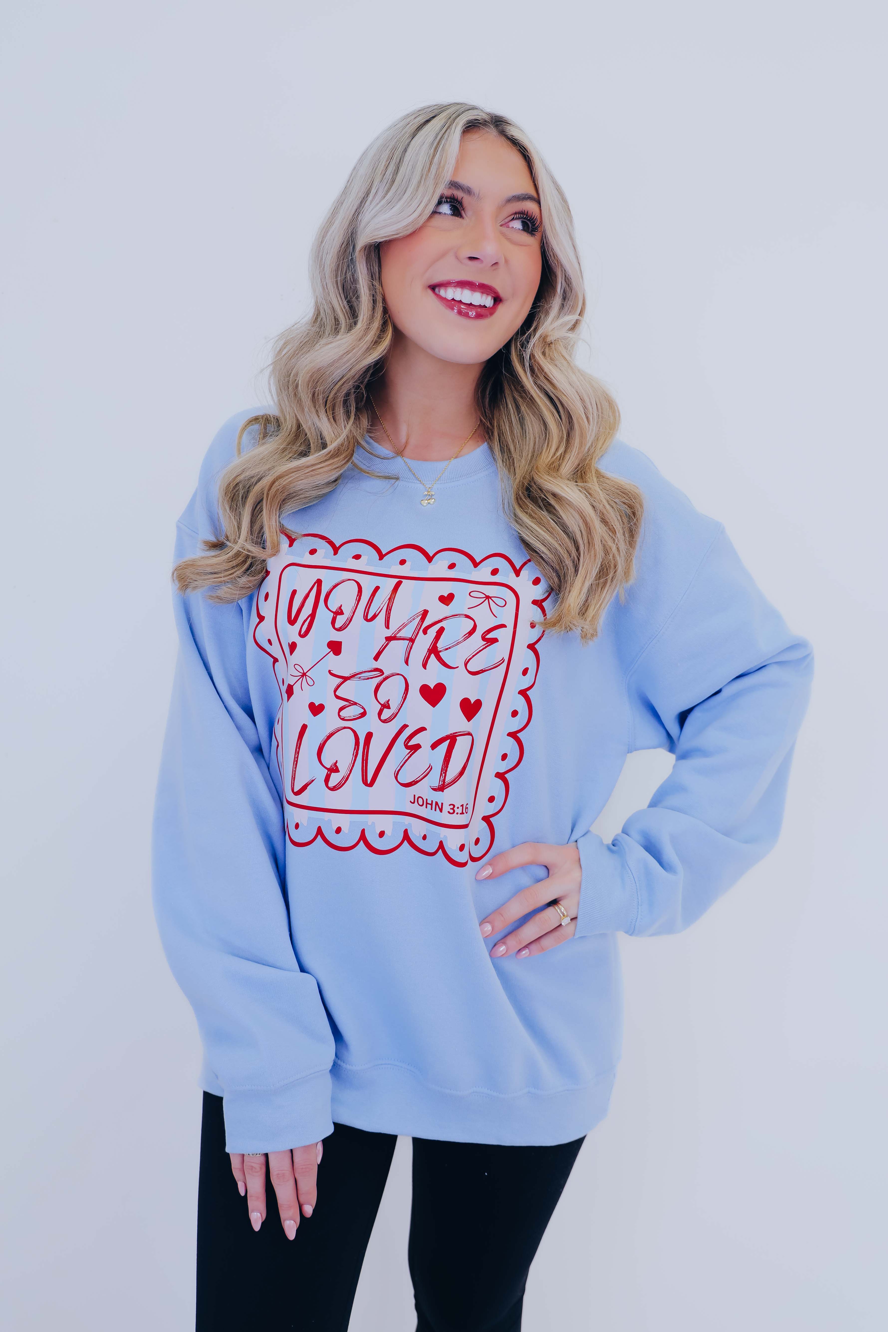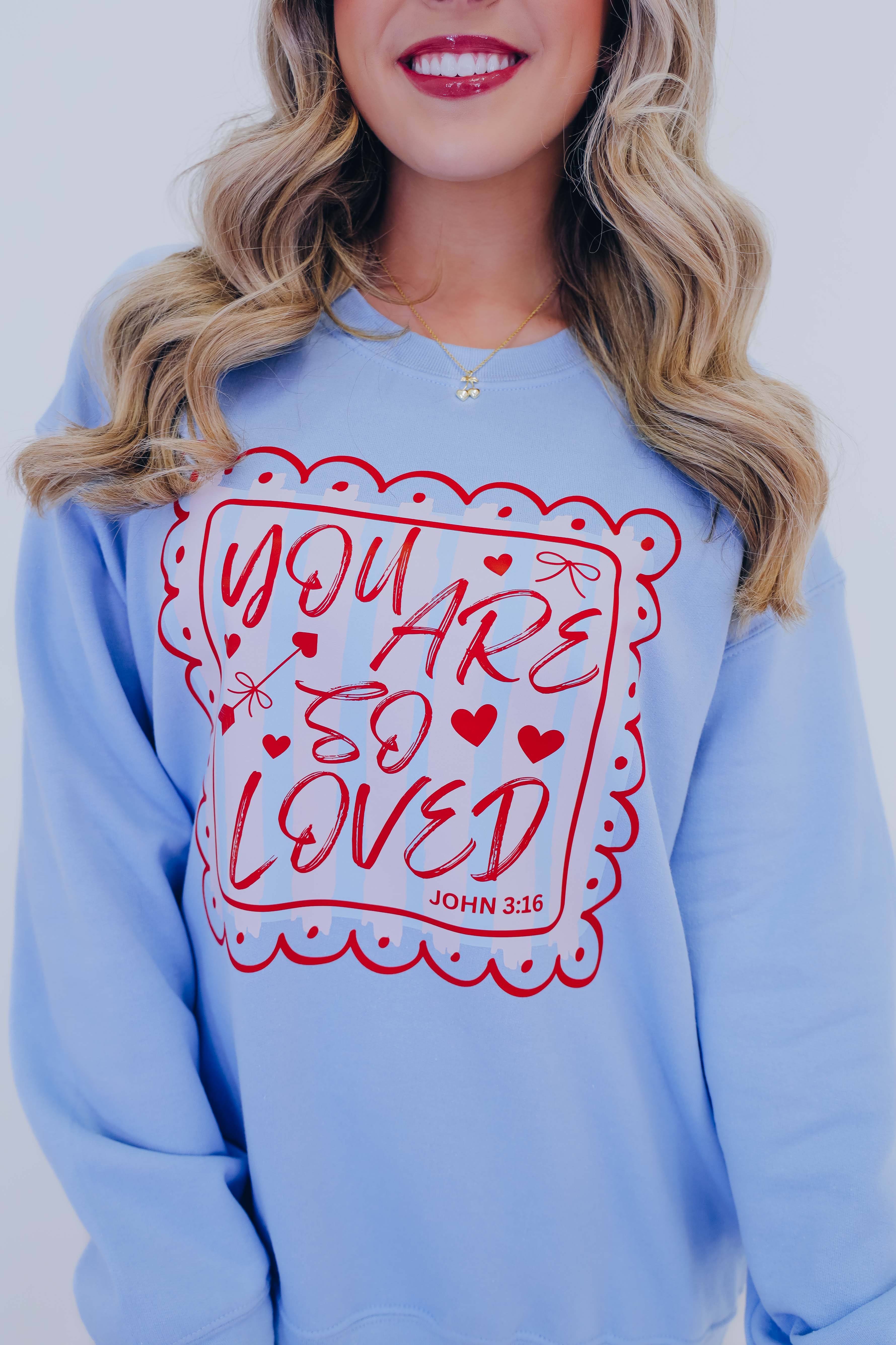 - Features a Gildan poly-cotton base, crew neck, long sleeves, graphics include a filigree frame with pink and blue stripes with "You Are So Loved" decorated with Valentine elements and John 3:16 inside the frame.