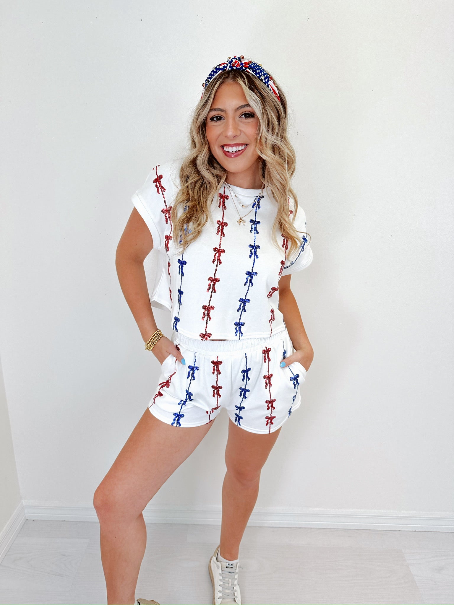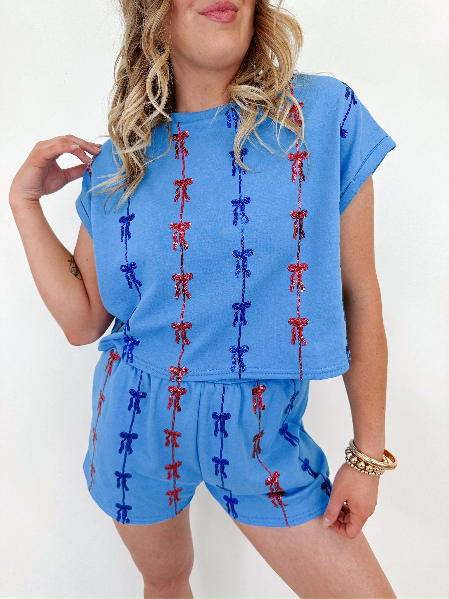 • Our Bows N Bling Sequin Short Set isn’t just an outfit — it's a total vibe!  With its patriotic color palette and sequin bow details, this cutesy set was made for our sparkle-loving girlies. Wear it as a matching set or mix and match the pieces with your fav basics for endless elevated comfy looks.