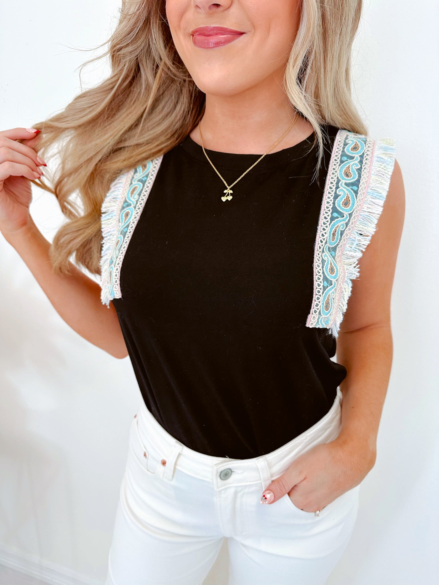 - Features a soft solid body fabric, a round neck, a sleeveless silhouette with a pastel paisley embroidered fringe trim applique trim adorning the edge and shoulder of the arm, and a straight hem.