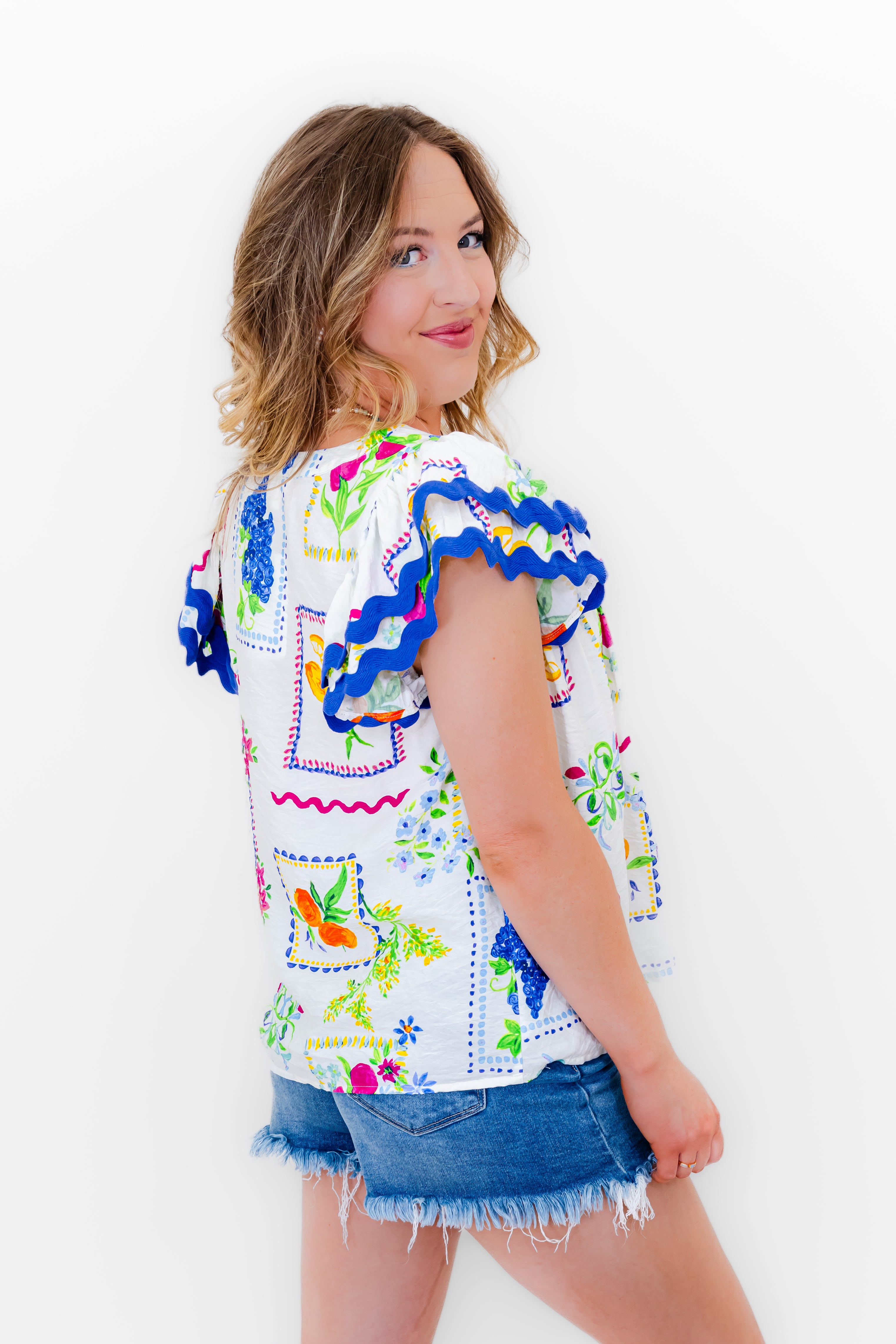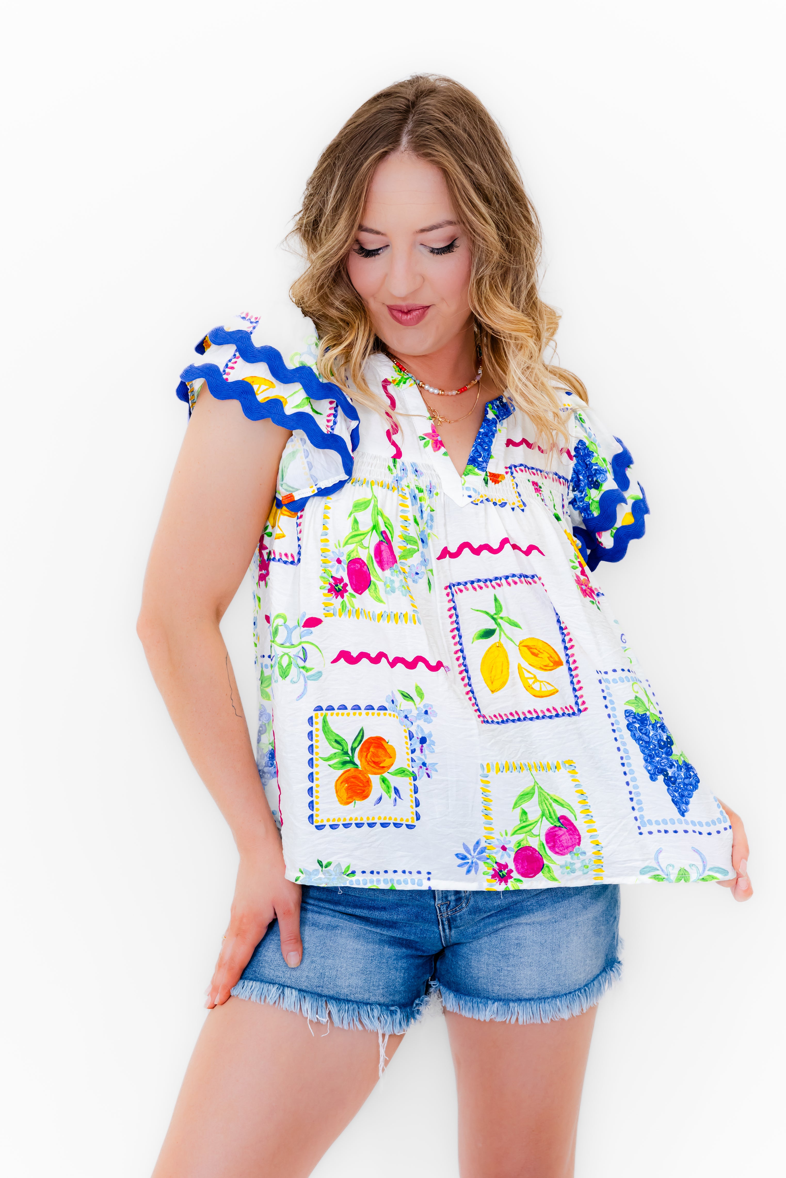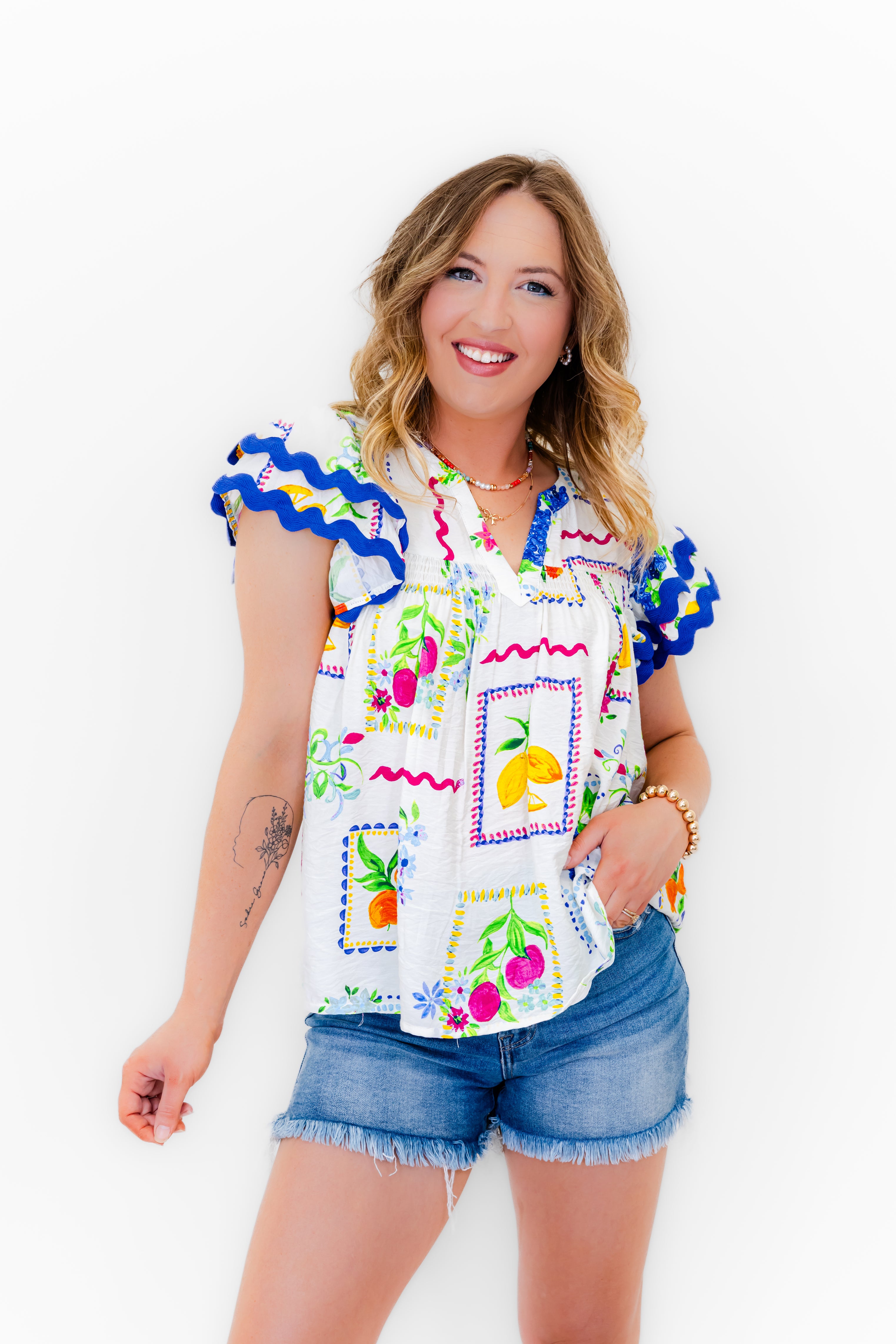 • Our Blooming Bliss Frilly Smock Top is a charming blend of French countryside flair and summertime sweetness. With its colorful fruit and floral print this top is made for sunny days and weekend getaways.