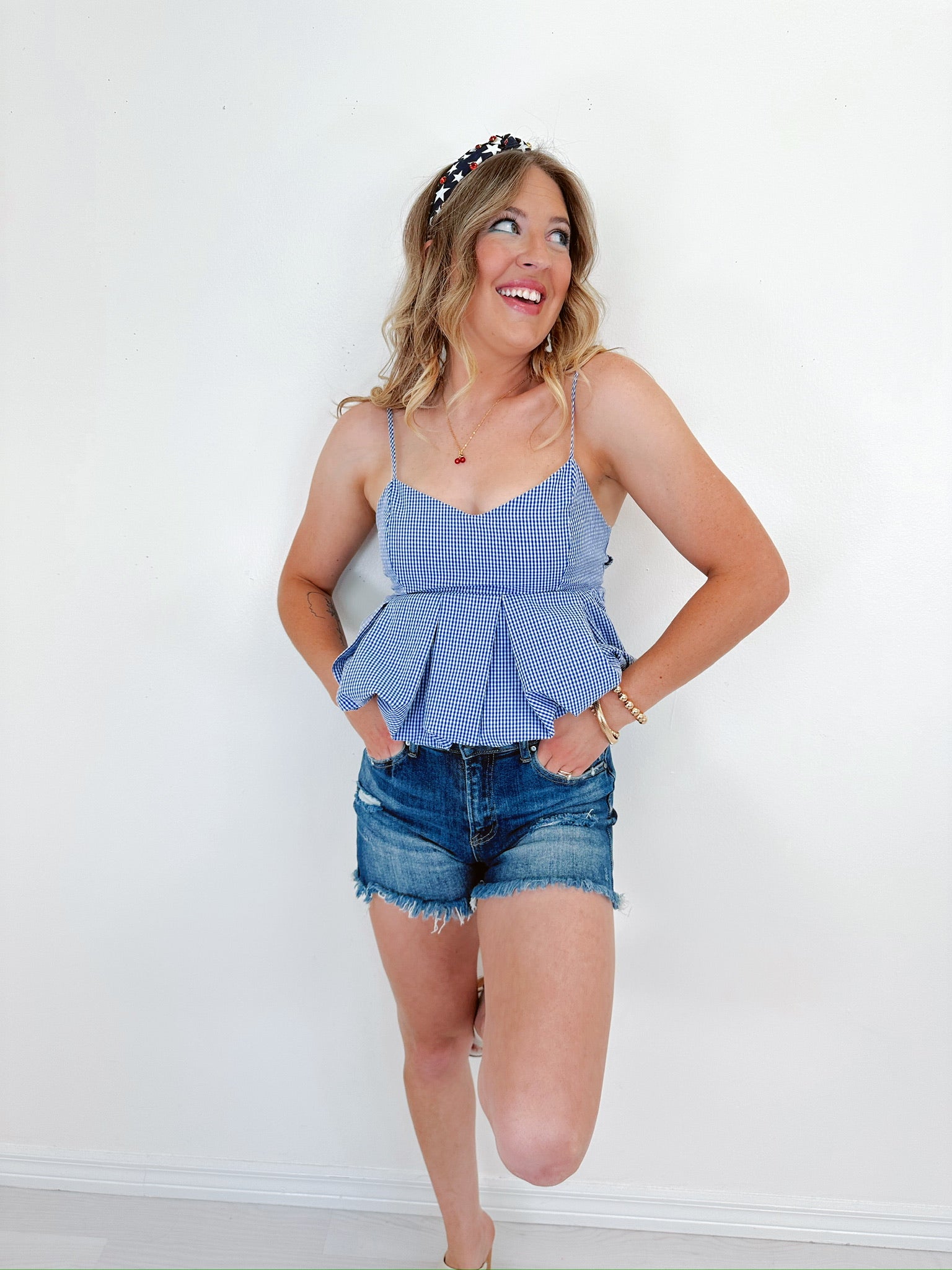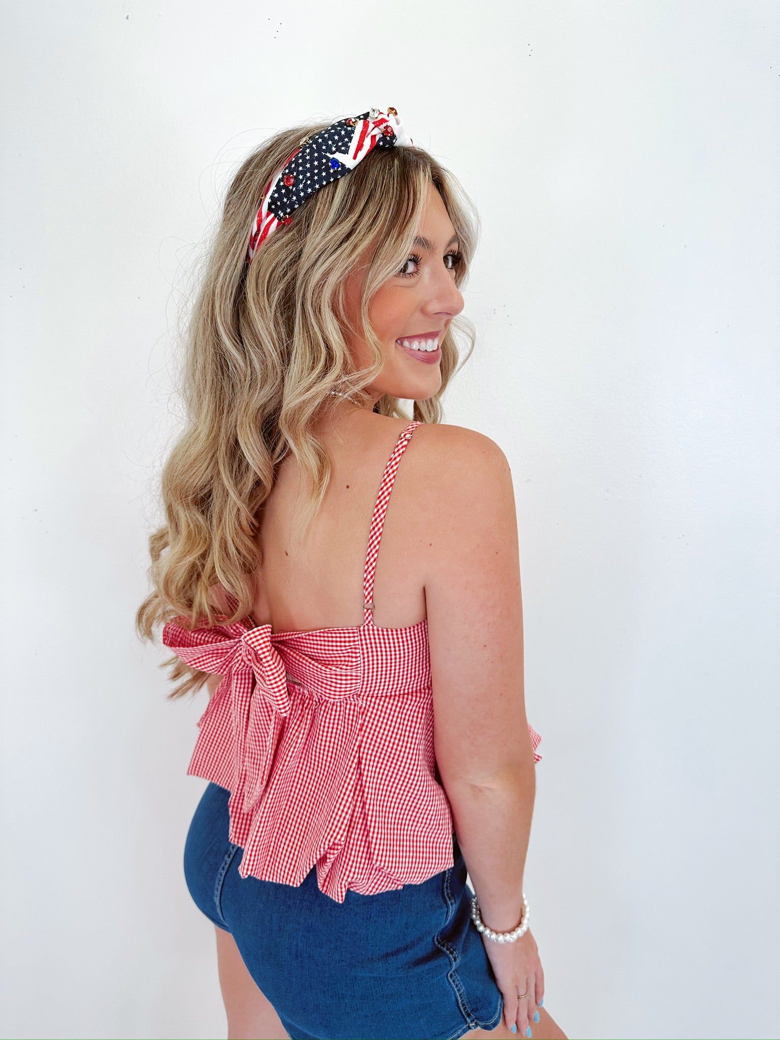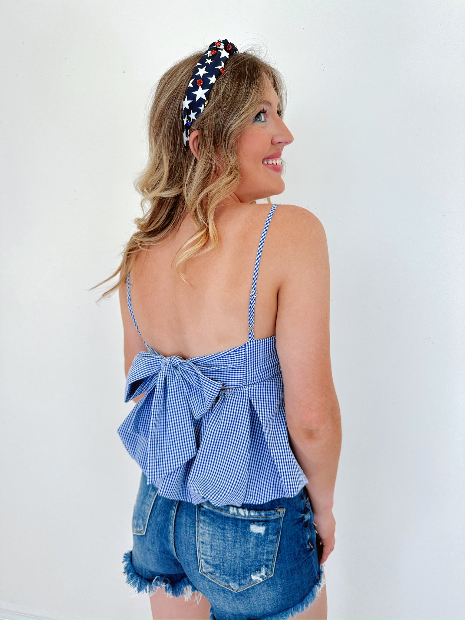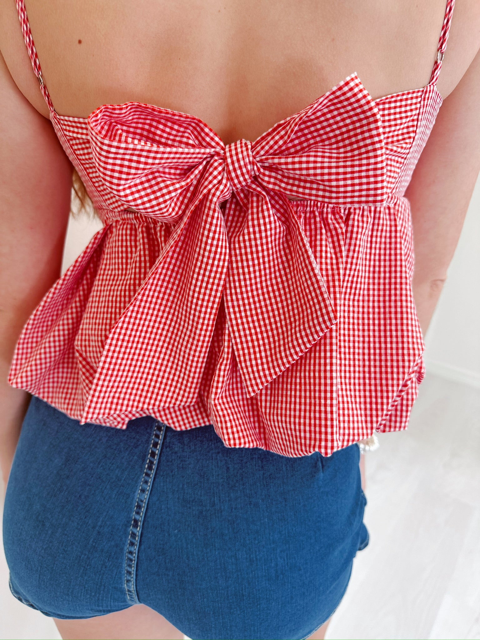 • Flirty, fun, and full of girly sass, our Gingham Glam Bubble Hem Crop Top is the ultimate summer statement. The tie back bow adds a trendy twist, while the cropped fit brings the sass. Style it with your fav high rise shorts or a white mini skirt, add espadrilles and dainty hoops to complete a sweet head to toe summer fit.