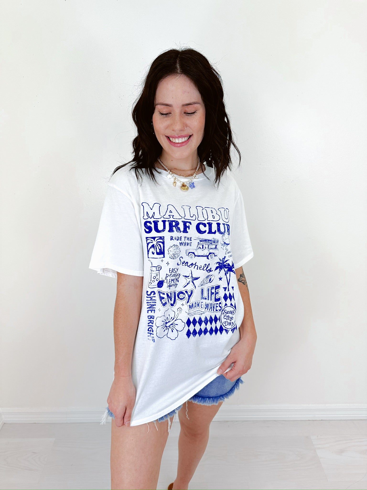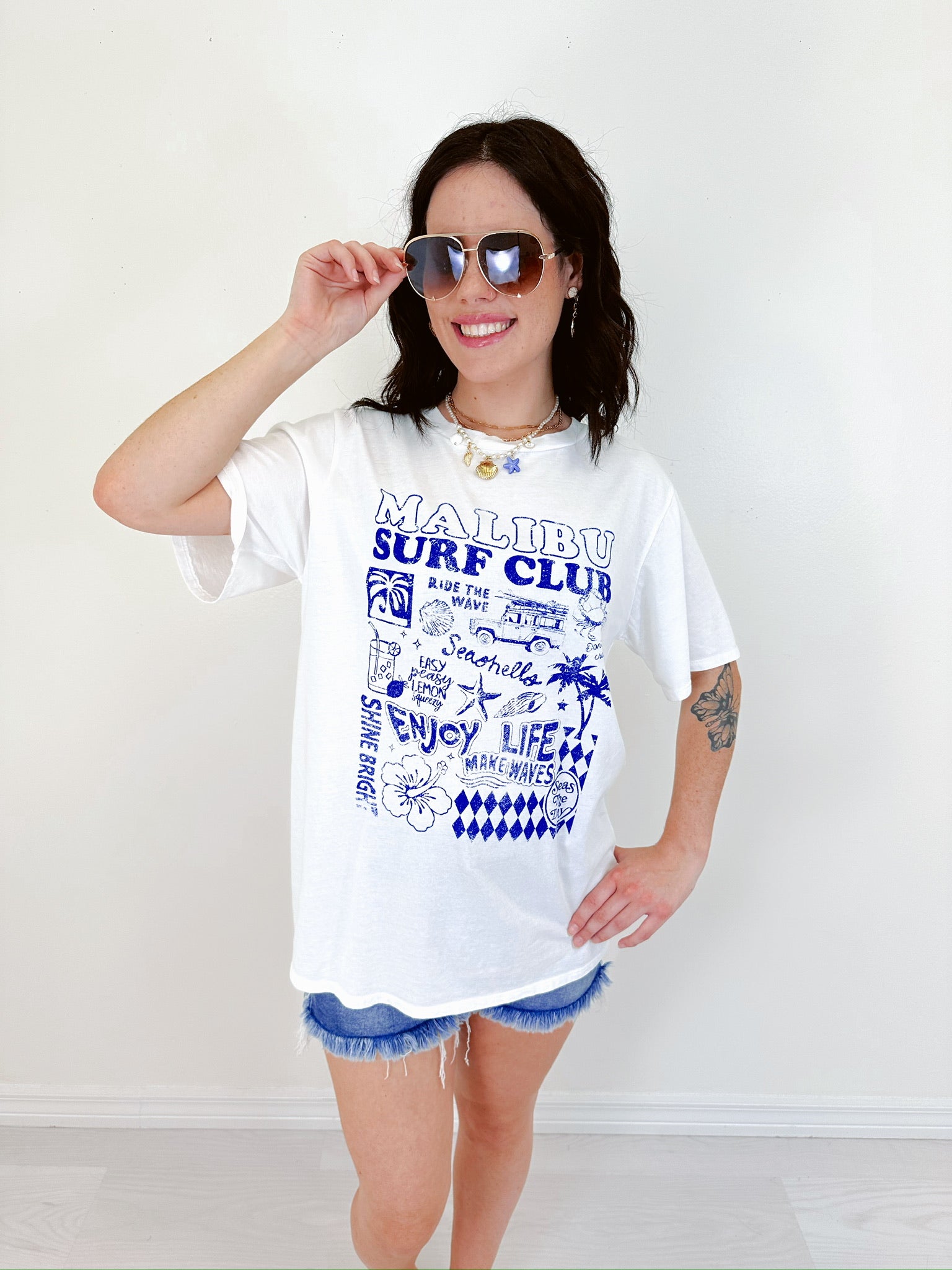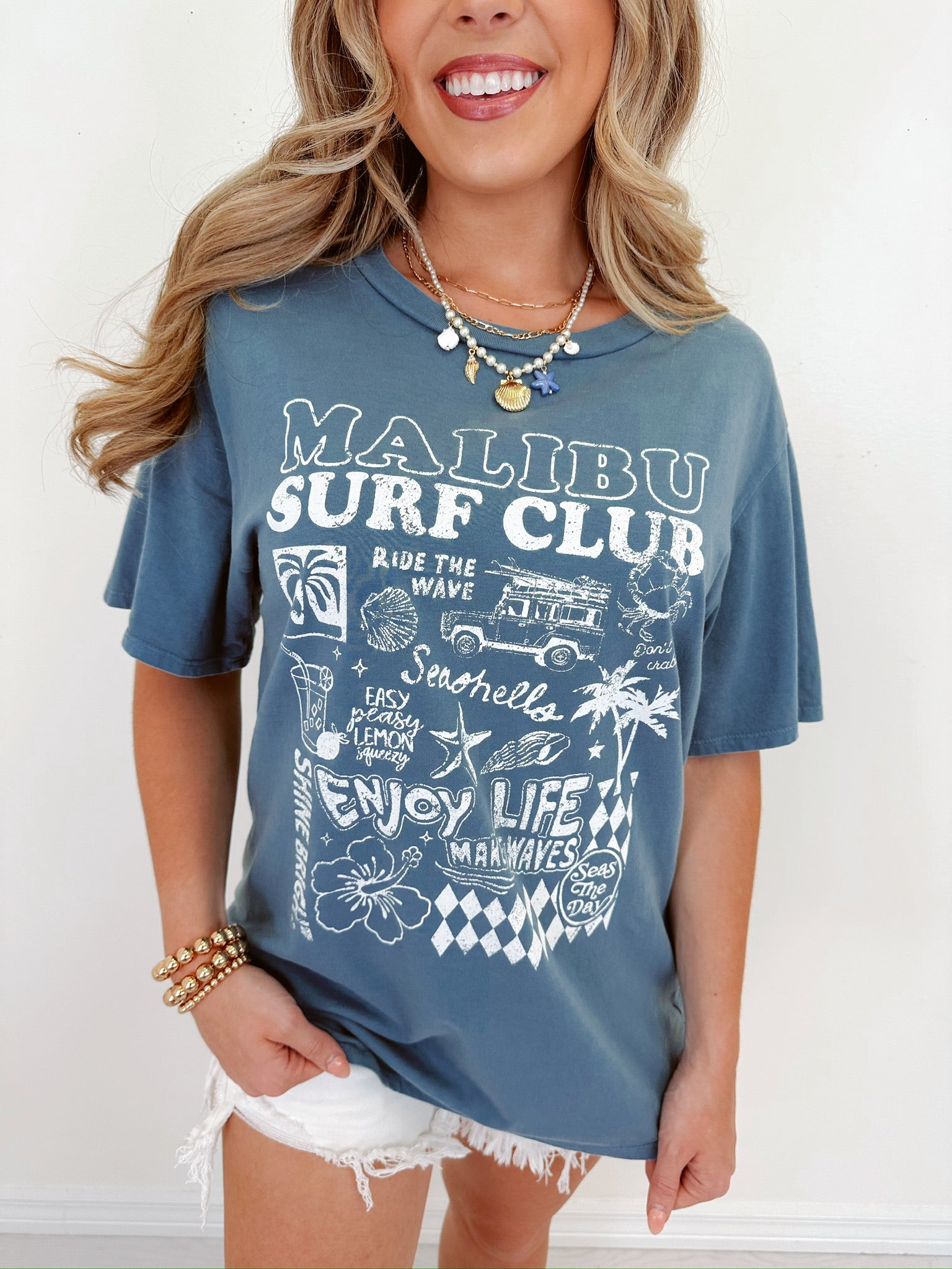 - Like an old favorite, our Malibu Surf Club Vintage Graphic Tee has that soft lived in feel! Pair it with distressed denim shorts and your fav sneakers for a casual beach day look or a relaxed errand day fitl.