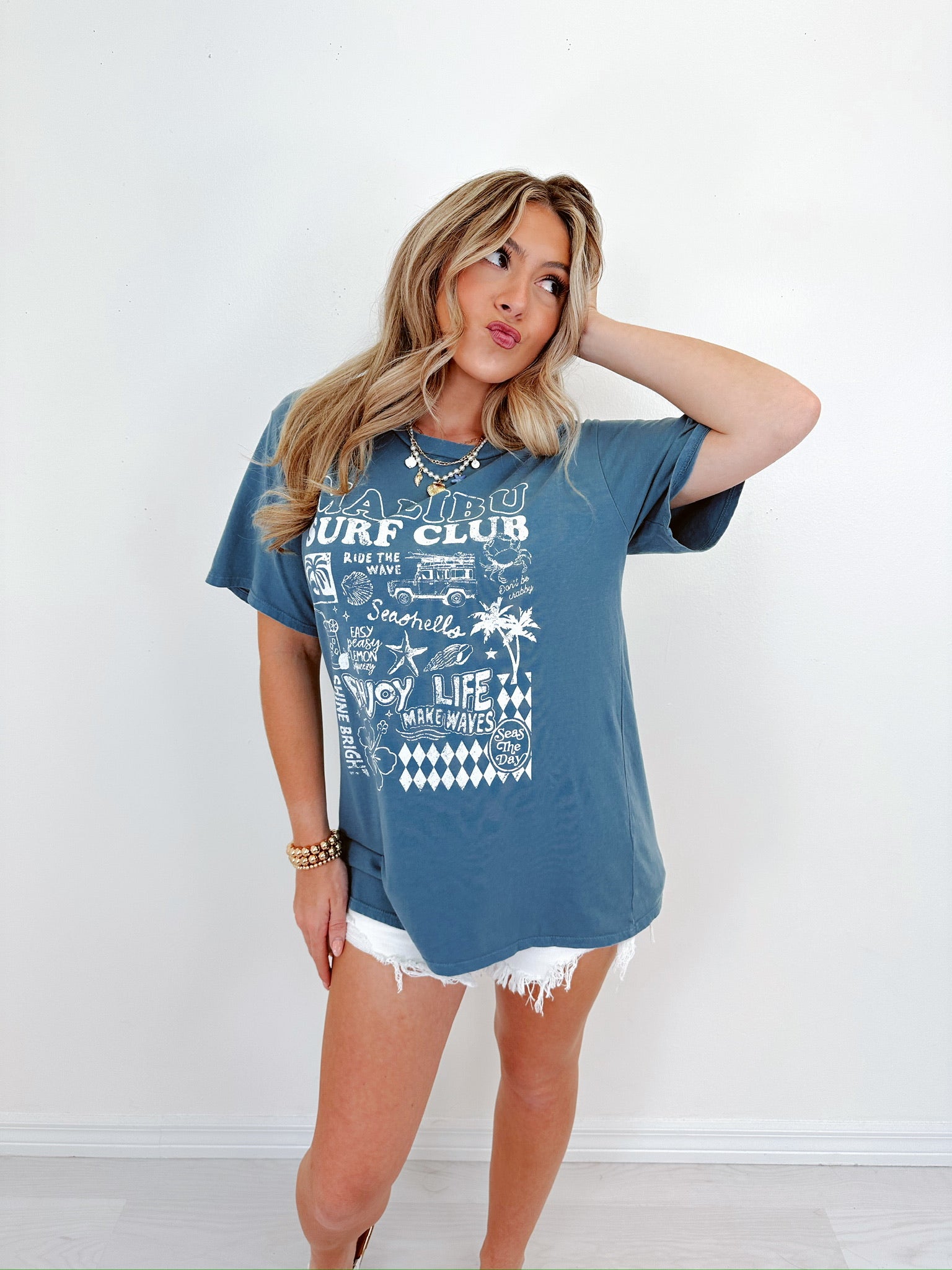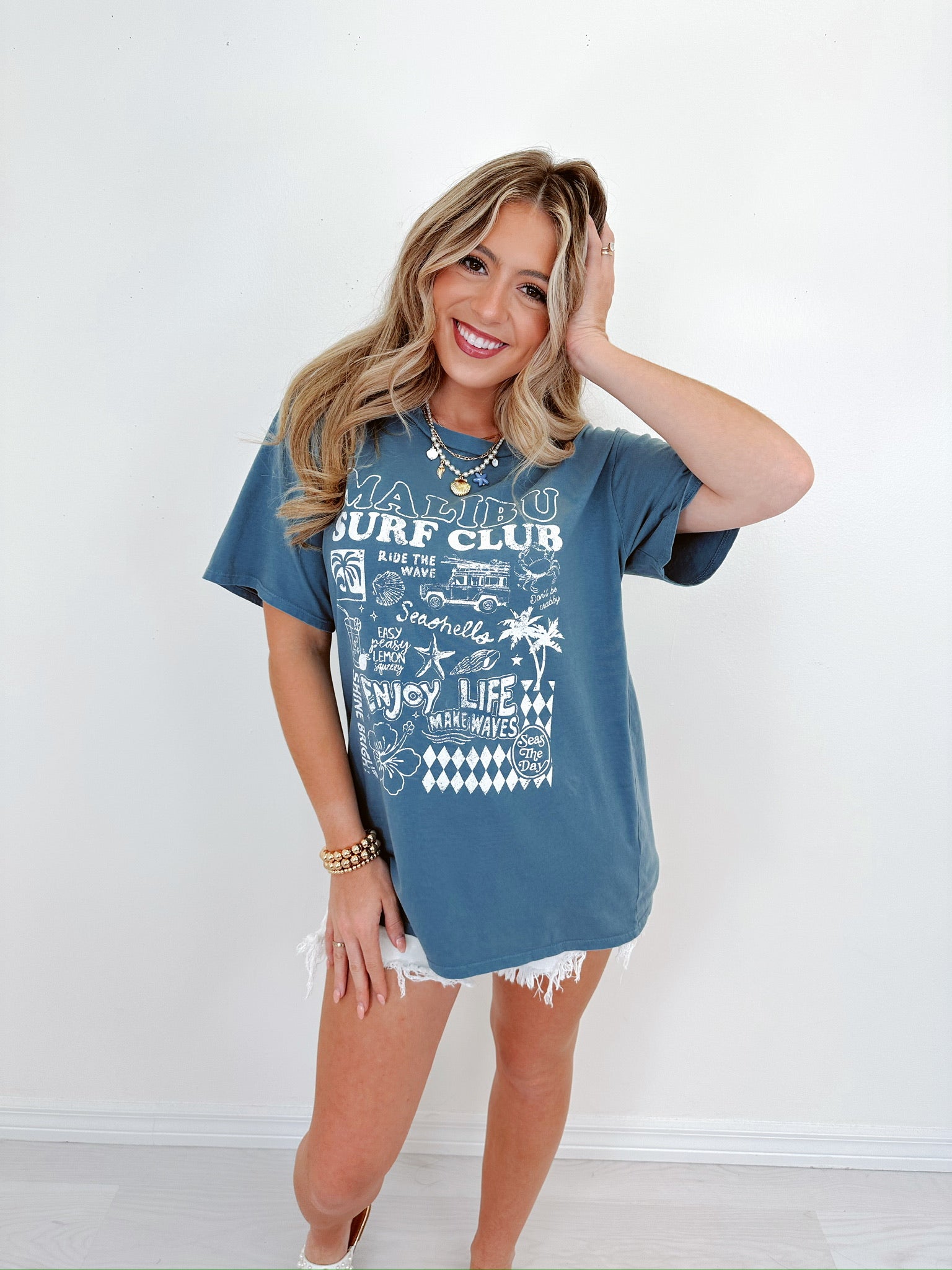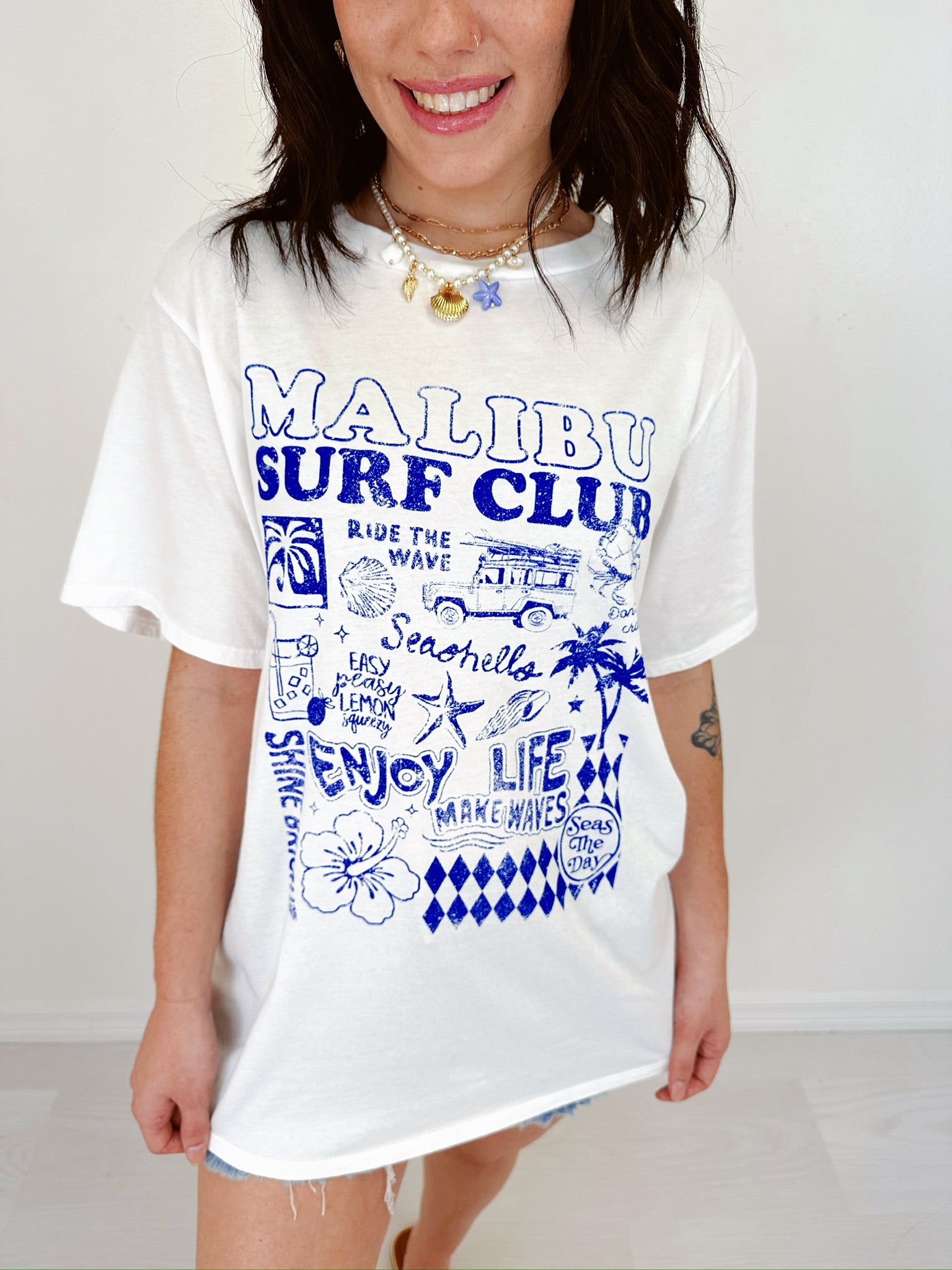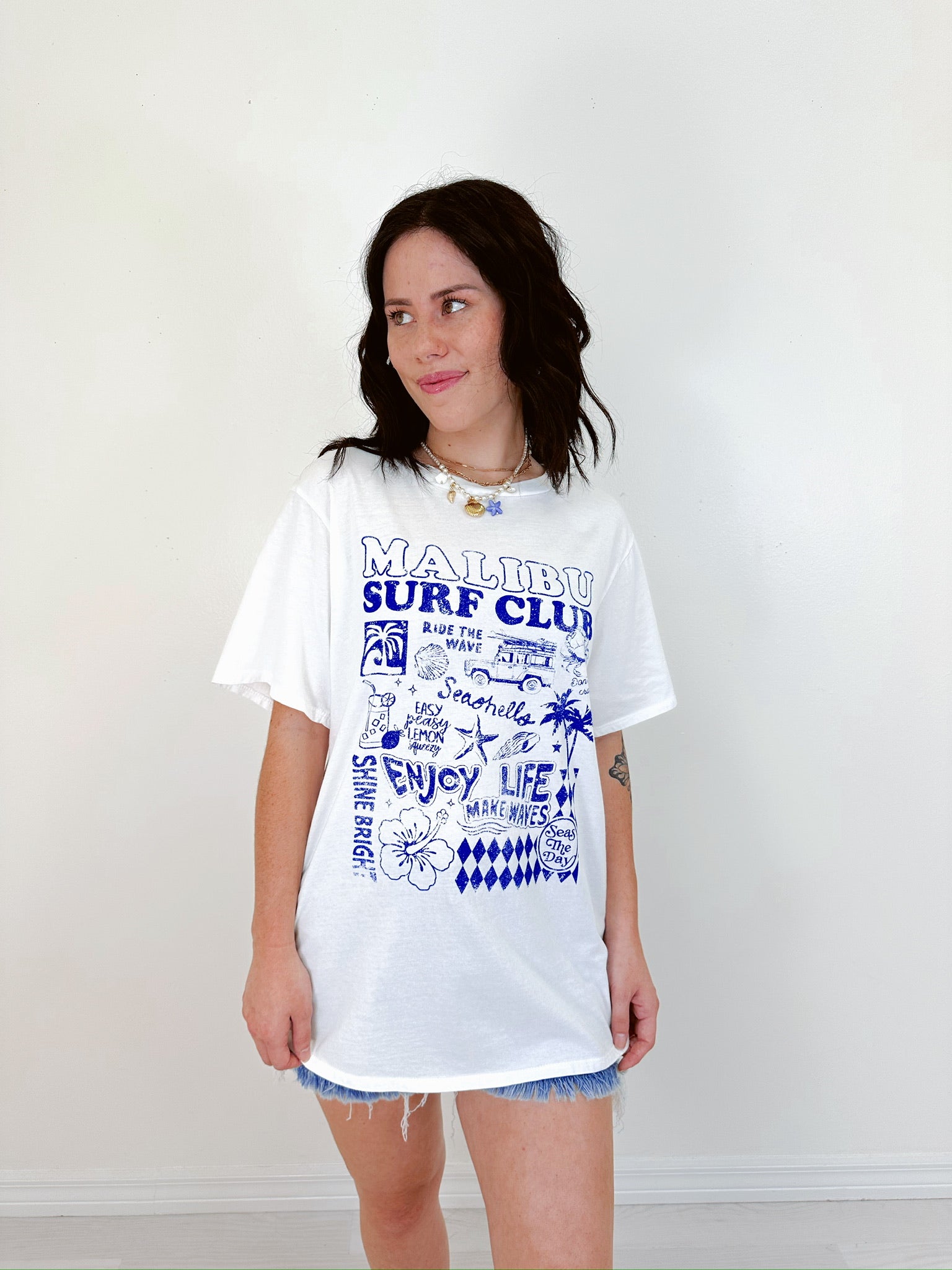 - Like an old favorite, our Malibu Surf Club Vintage Graphic Tee has that soft lived in feel! Pair it with distressed denim shorts and your fav sneakers for a casual beach day look or a relaxed errand day fitl.
