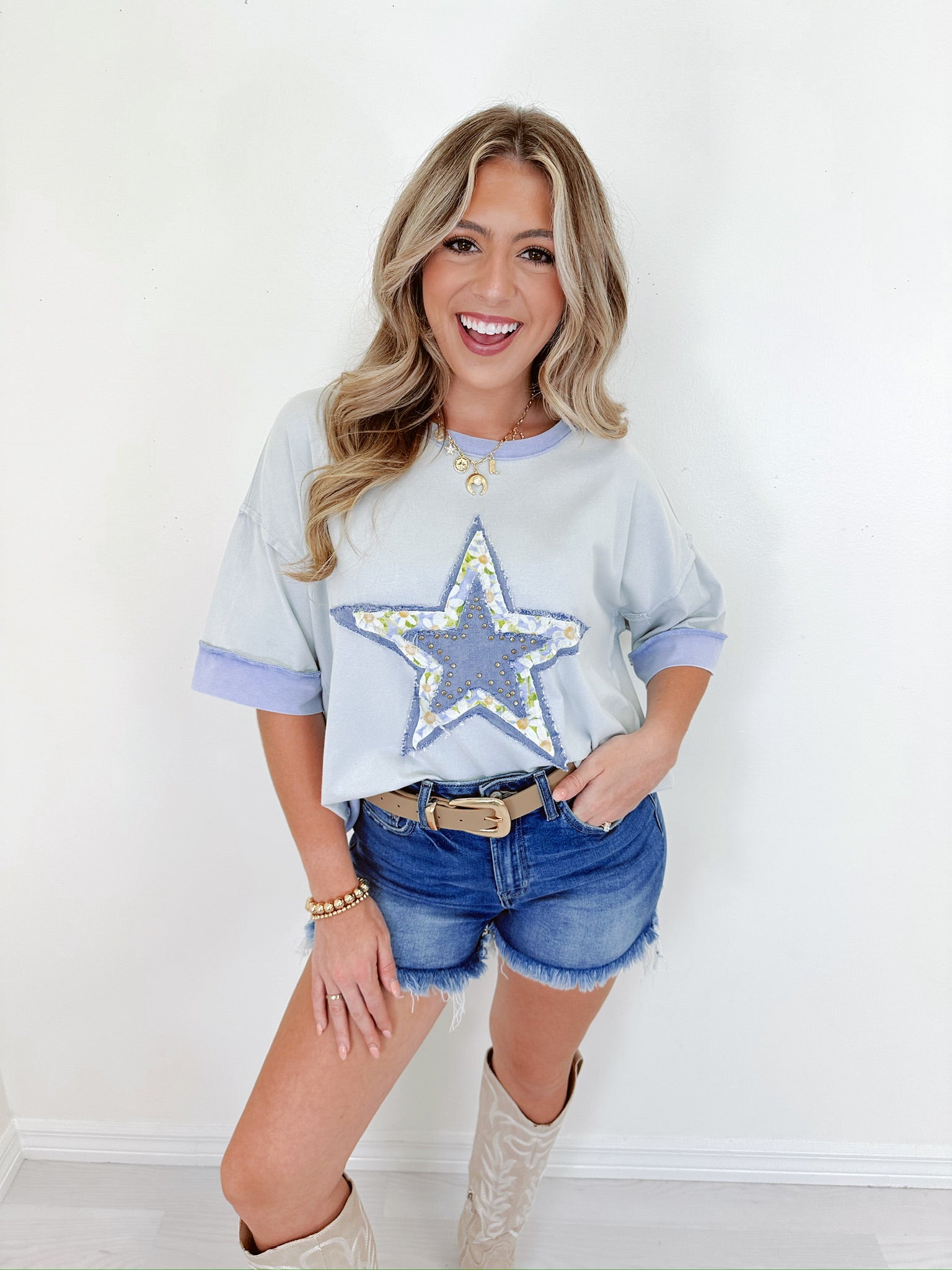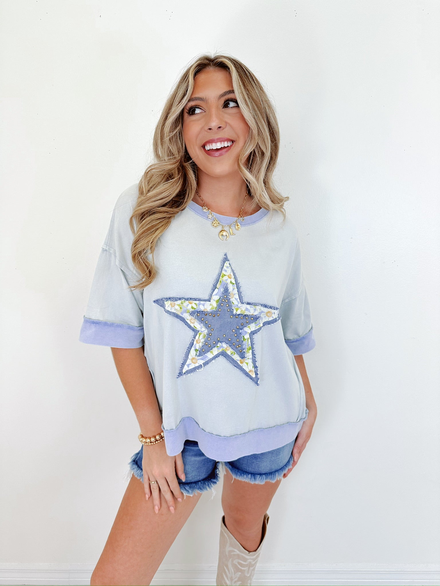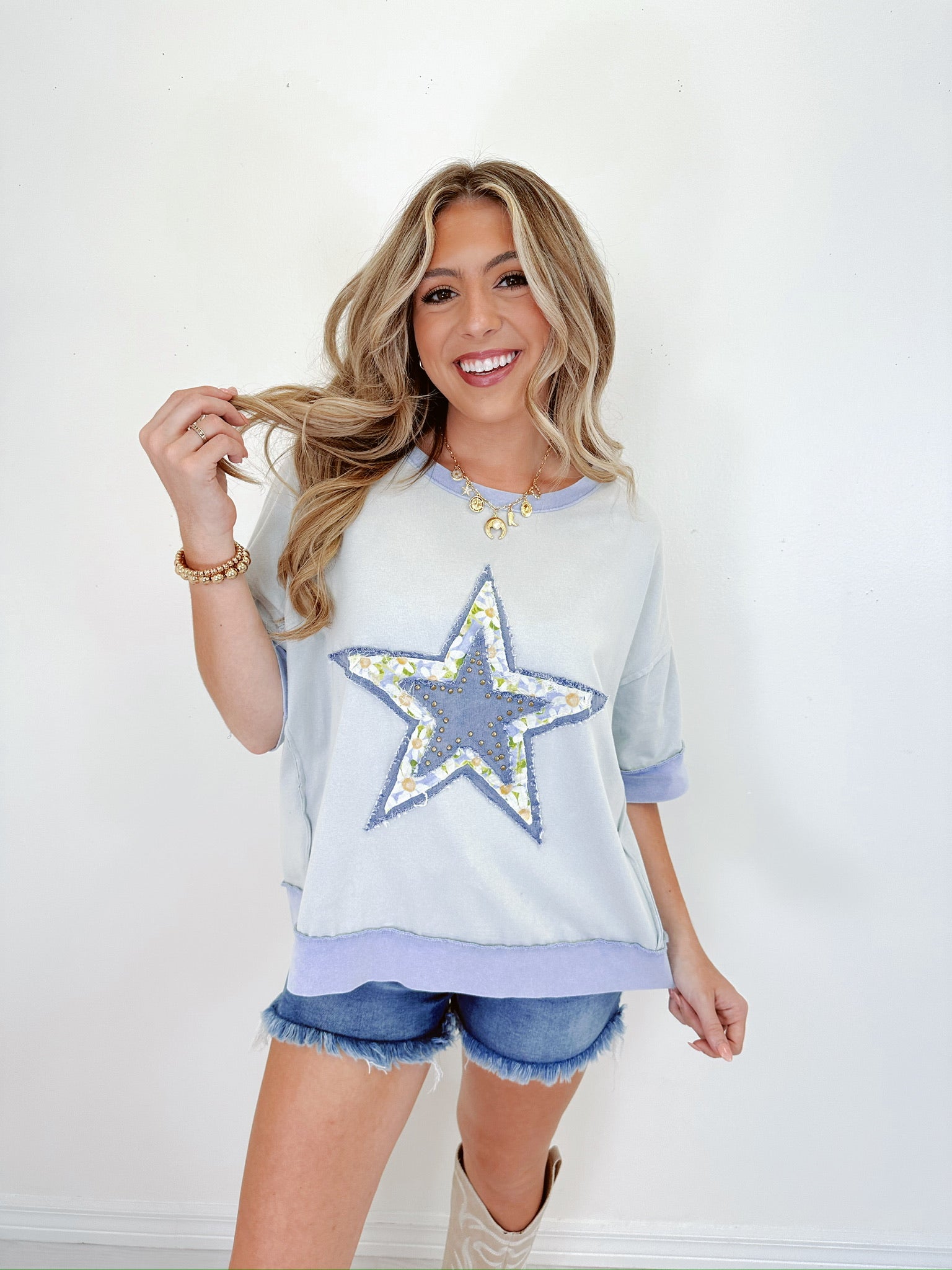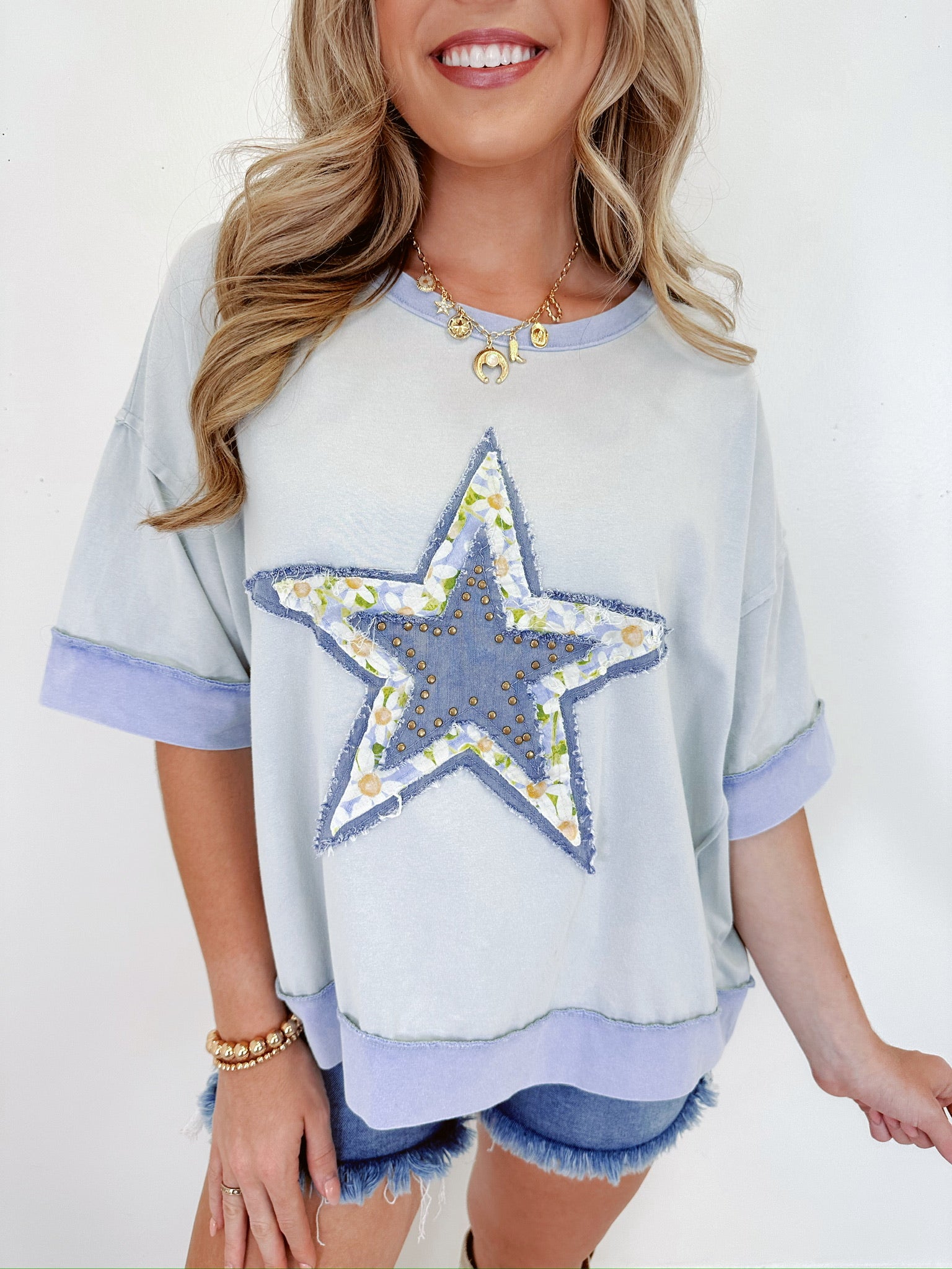 - This round neck top features a super soft mineral wash cotton fabric with a floral ditsy print raw edge star adorned with silver tone rivet studs is front and center, a drop shoulder sleeve with banded edge, a roomy body with a banded straight edge hem.
