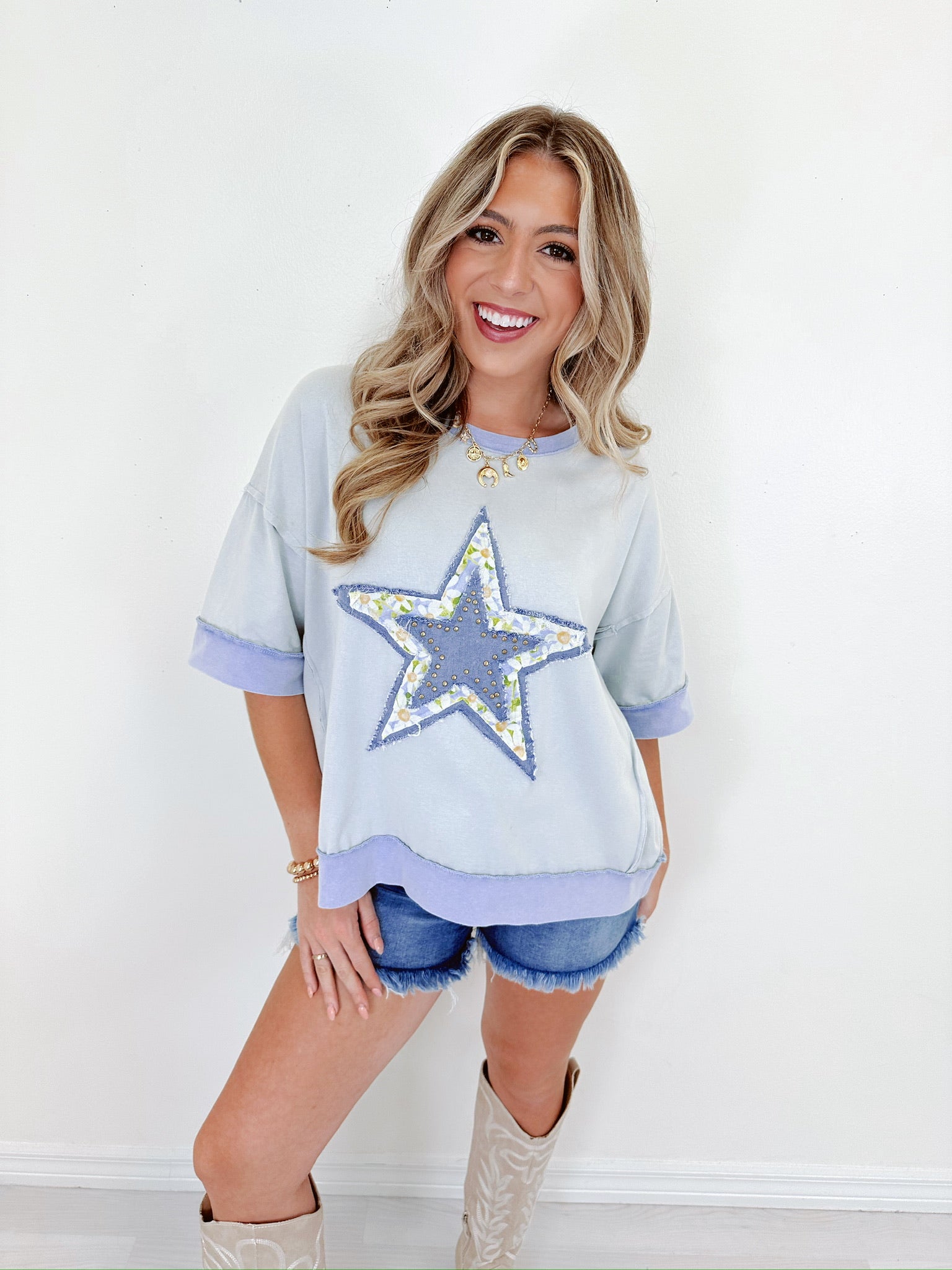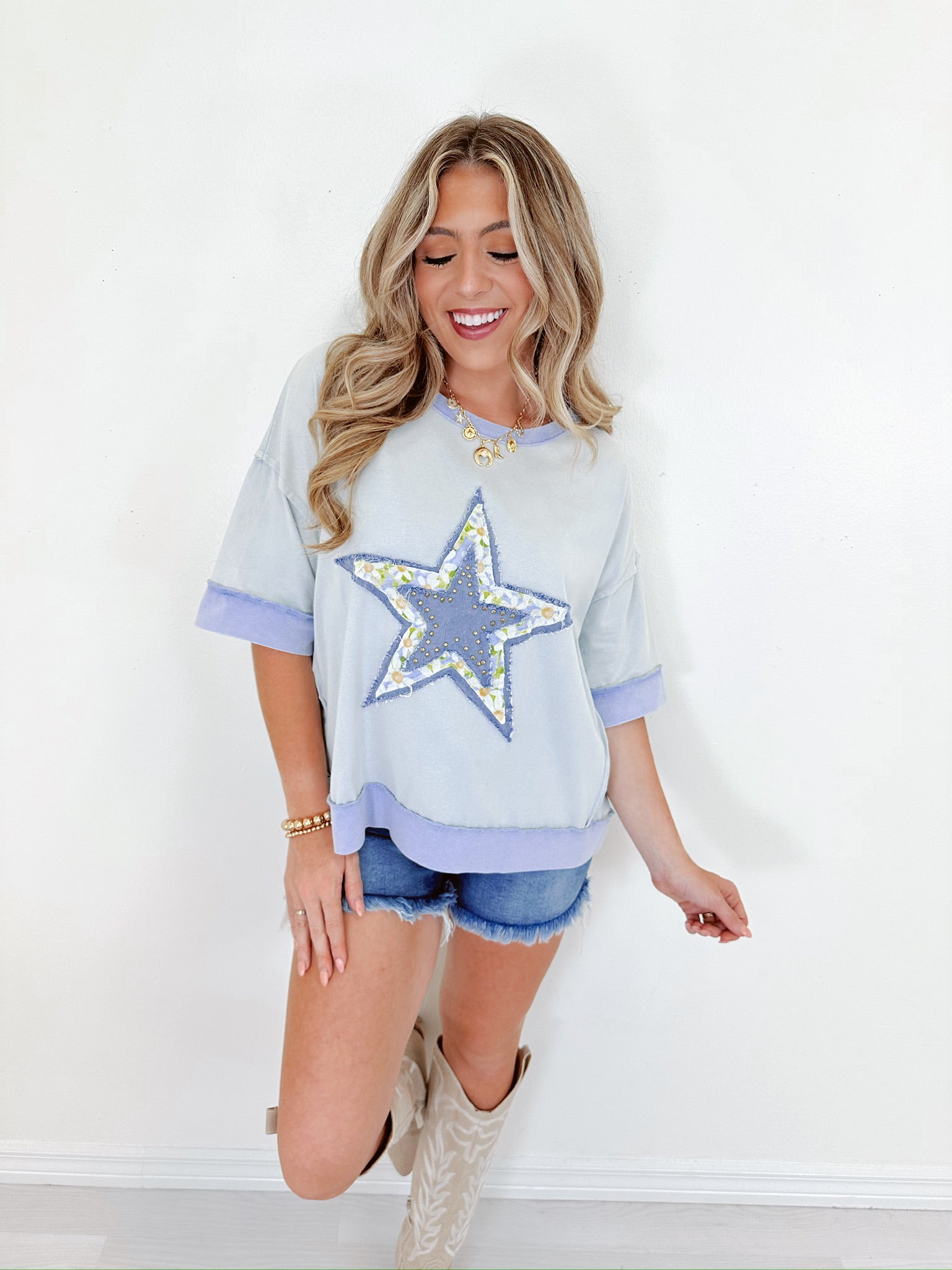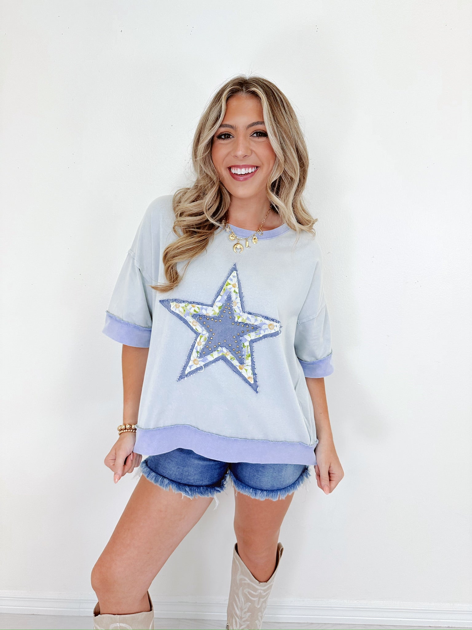 - This round neck top features a super soft mineral wash cotton fabric with a floral ditsy print raw edge star adorned with silver tone rivet studs is front and center, a drop shoulder sleeve with banded edge, a roomy body with a banded straight edge hem.