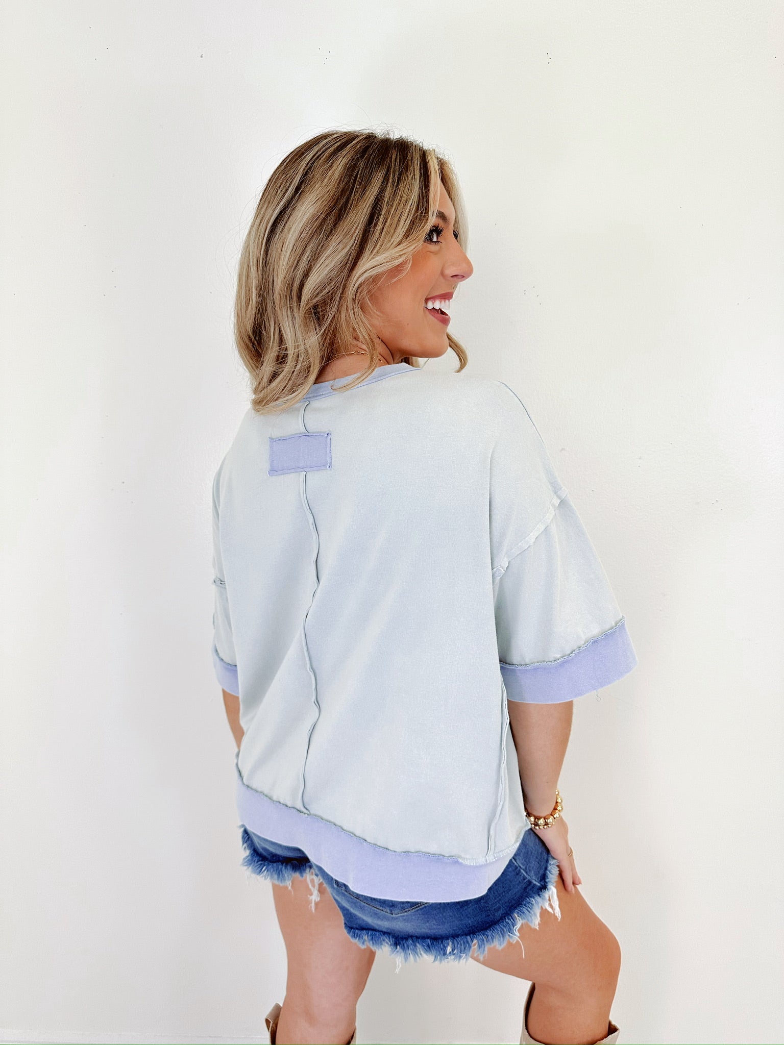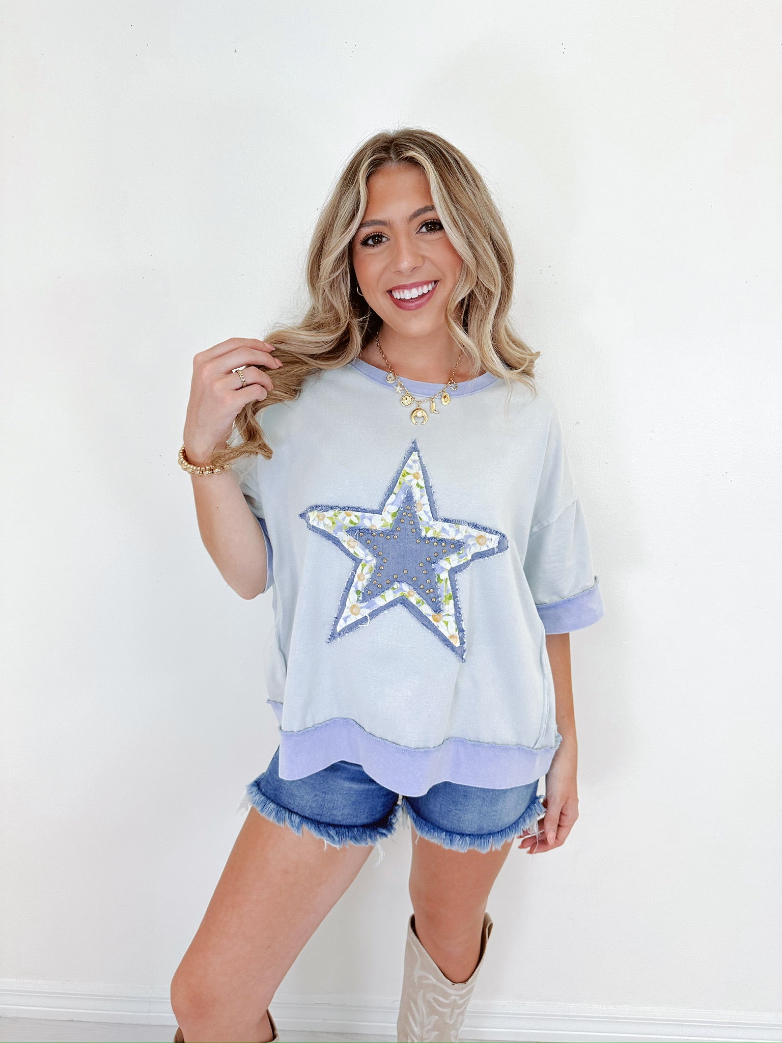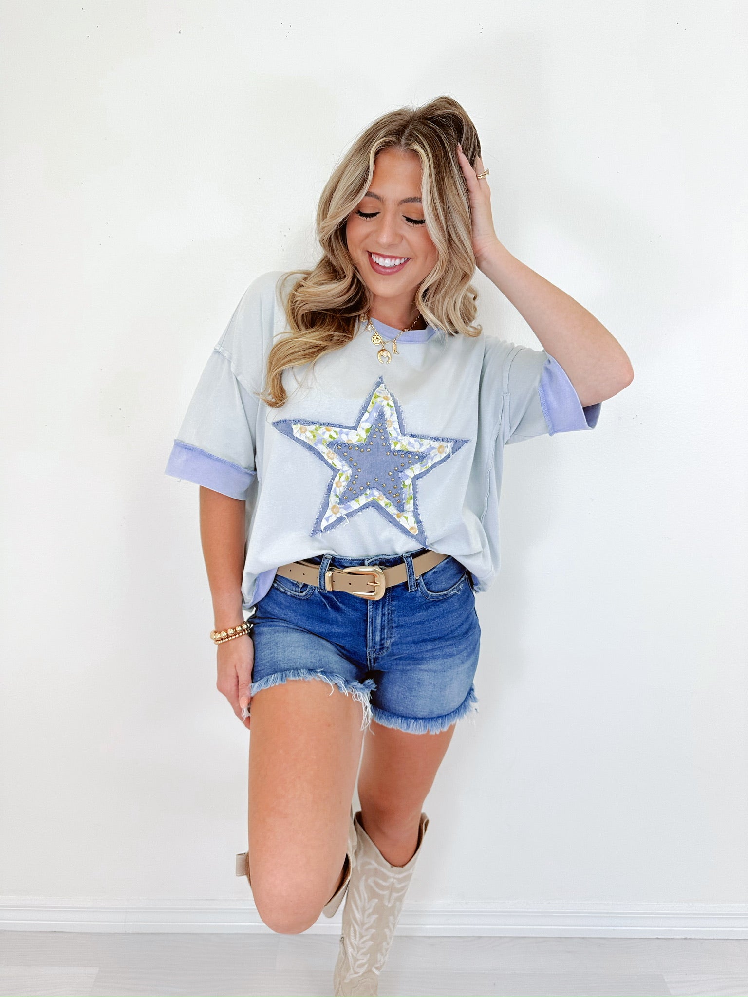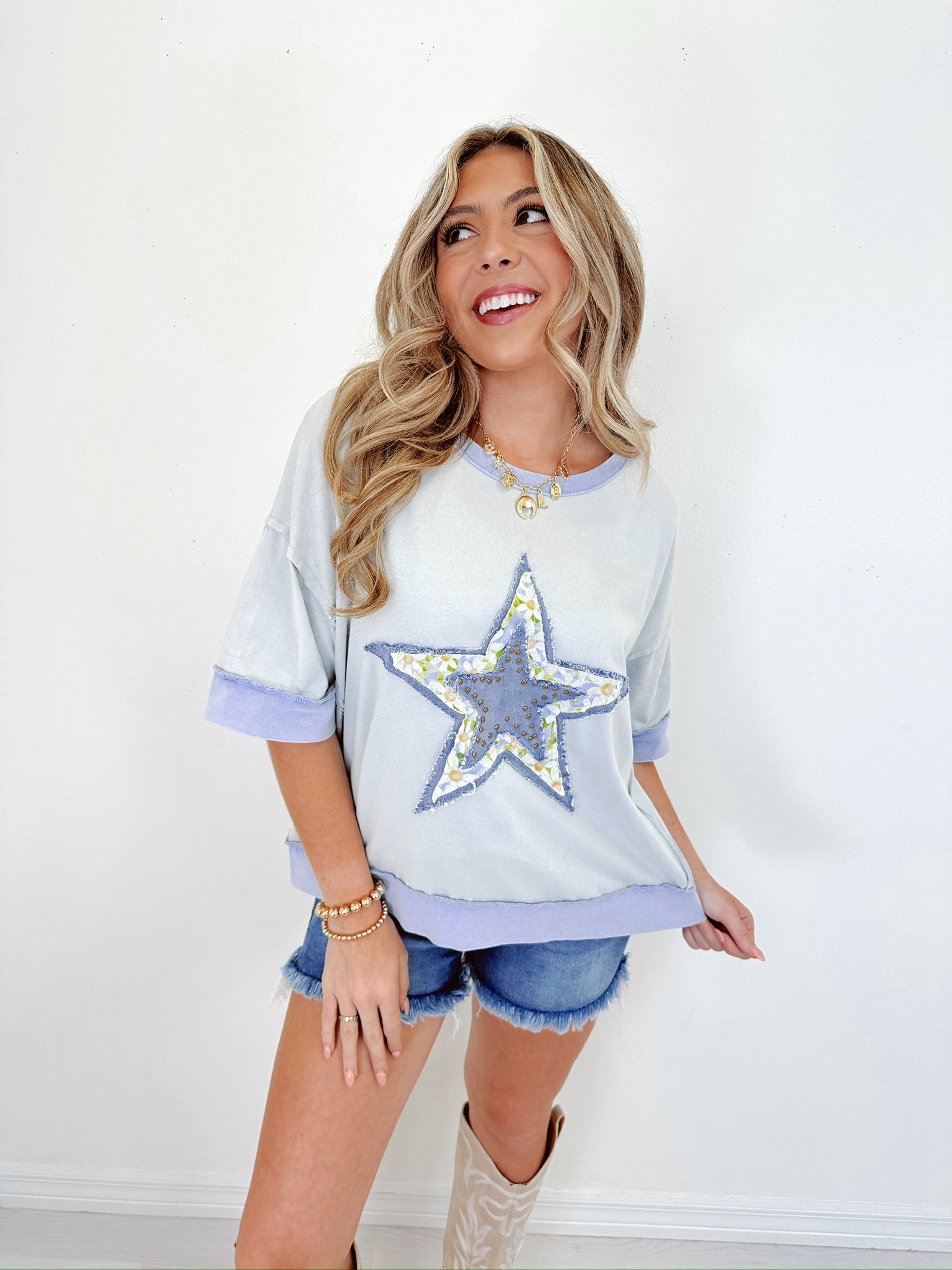 - This round neck top features a super soft mineral wash cotton fabric with a floral ditsy print raw edge star adorned with silver tone rivet studs is front and center, a drop shoulder sleeve with banded edge, a roomy body with a banded straight edge hem.