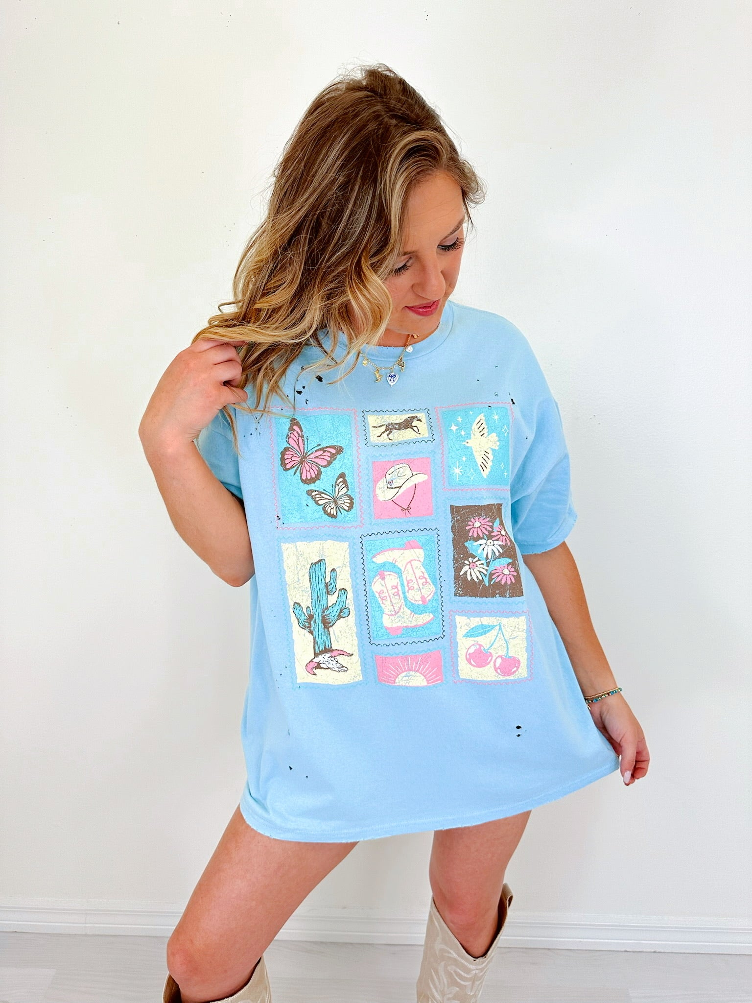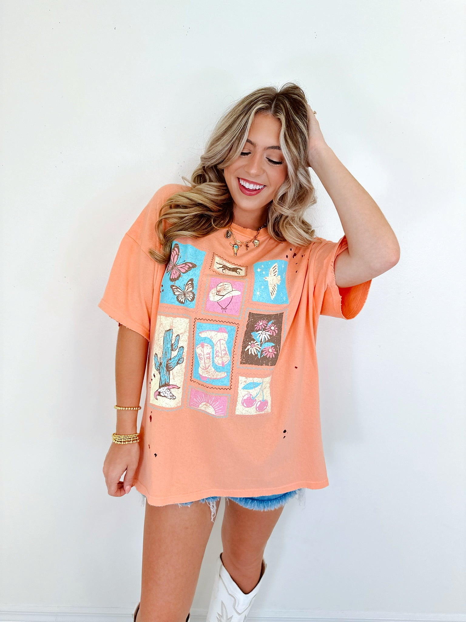 - Oversized comfy and super trendy, our Western Stamps Distressed Graphic Tee is your throw on and go summer must have! Pair this cutie with flare leggings for a casual everyday fir, or dress her up with a denim skirt, chain belt, and boots for a summer concert fit.