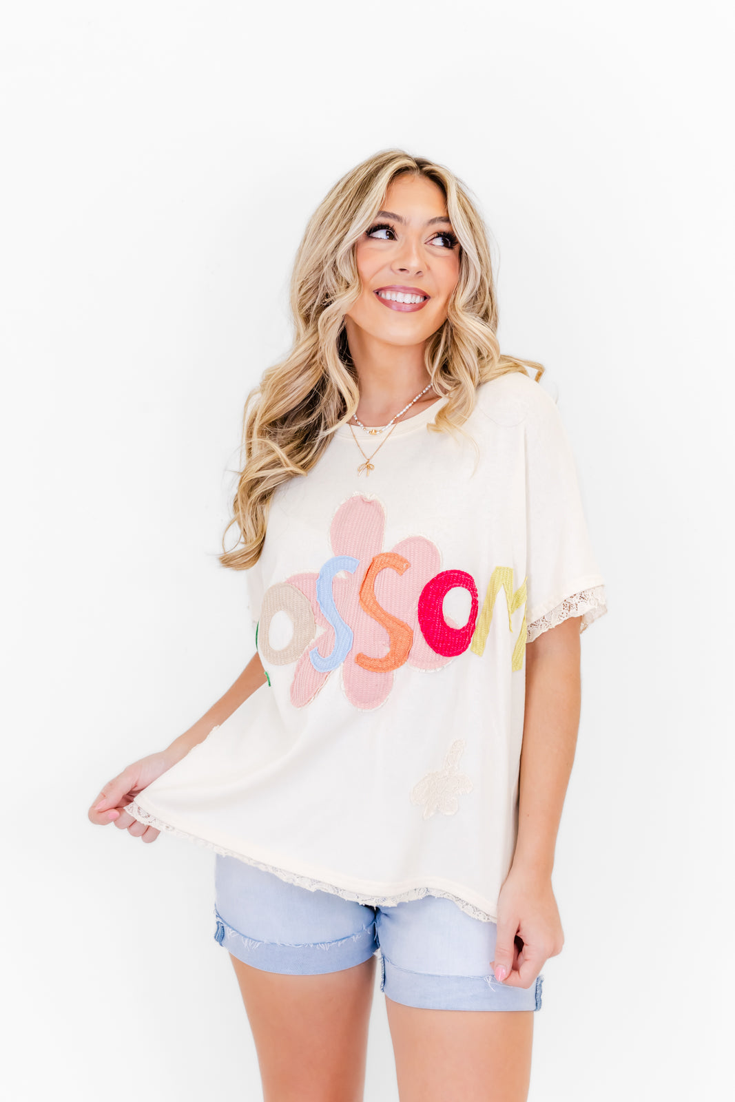 • This top features a soft cotton fabric with a round neck,  short dolman sleeves with lace trim, a roomy boxy silhouette with a mixed-fabric patch graphic that spells “Blossom” over a patchwork flower, with touches of floral and heart lace patches adorning the front and back, completed with a straight lace trim hem.