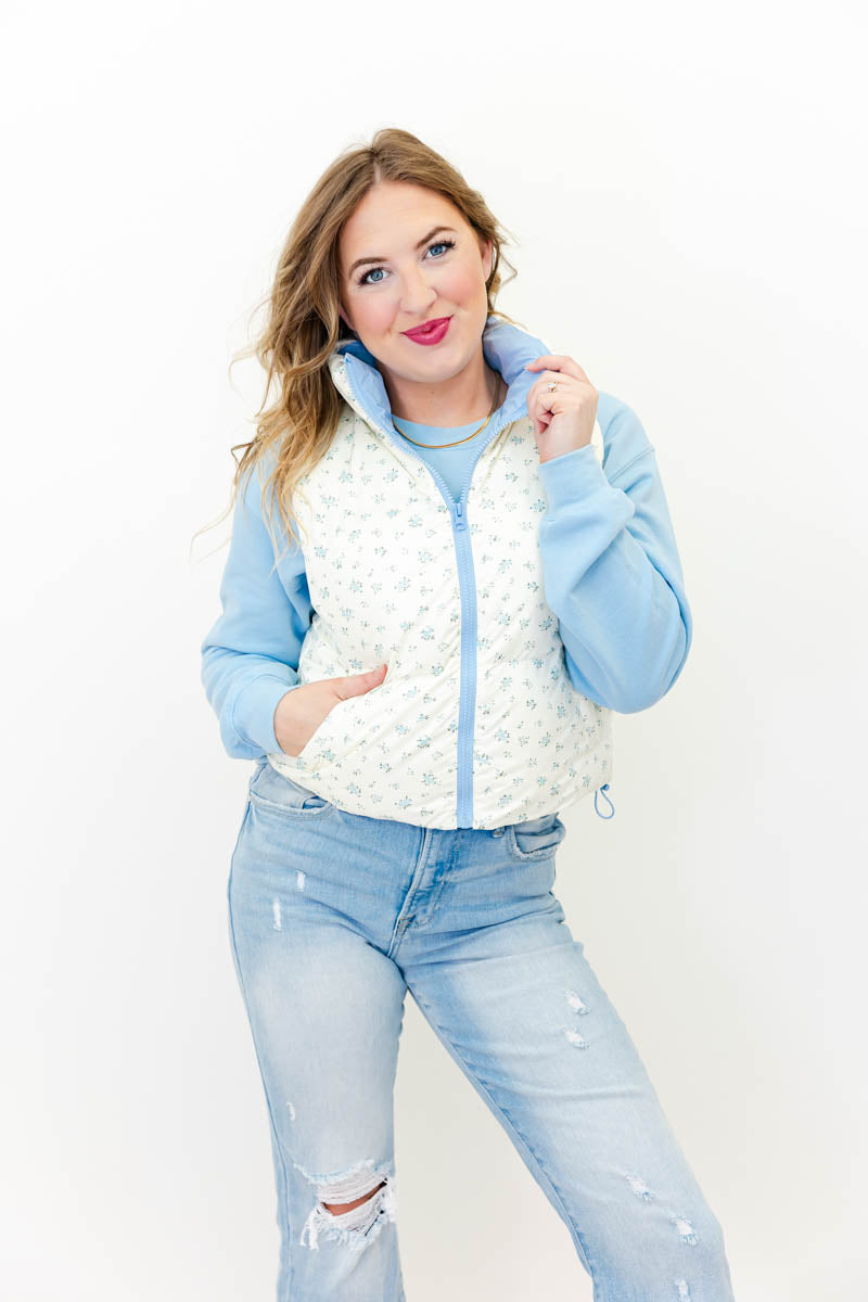 Wrap yourself in cozy charm with our Darling Bloom Vest — where function meets feminine flair. This quilted puffer-style vest features a dainty floral print on a soft ivory base, paired with a dreamy pastel lining that adds the sweetest pop of color. With front pockets, a zip-up front, and an adjustable drawstring hem, it’s both practical and effortlessly chic.