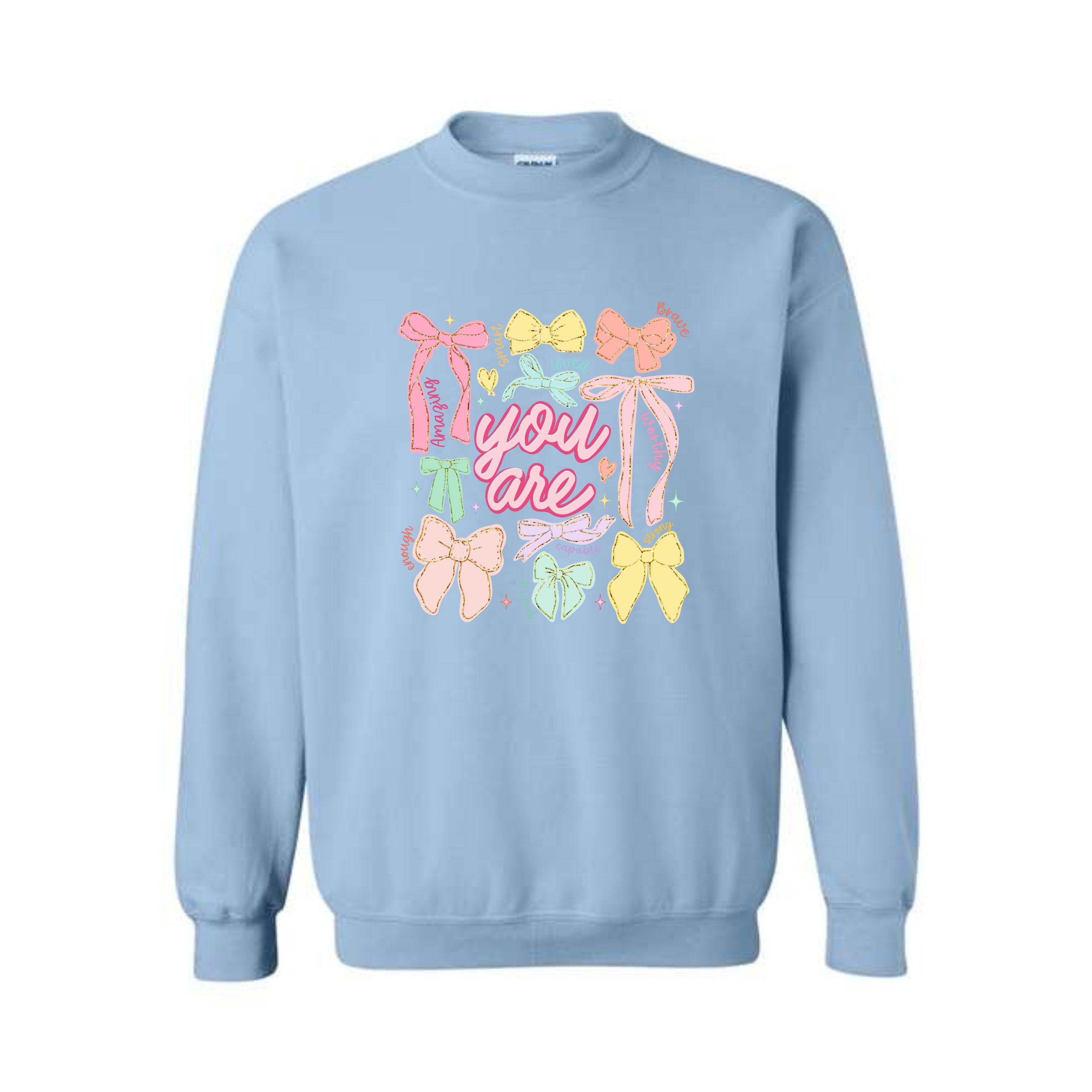 Features a Gildan poly-blend base, crew neck, long sleeves graphics include multi-color and styles of bows with words of affirmation written in between.