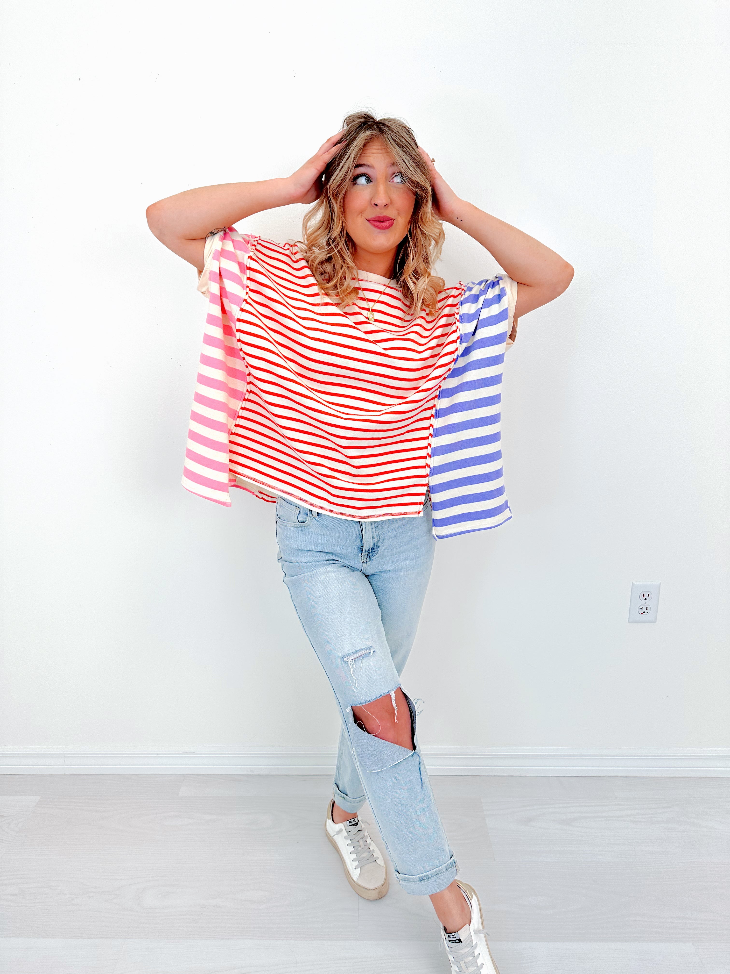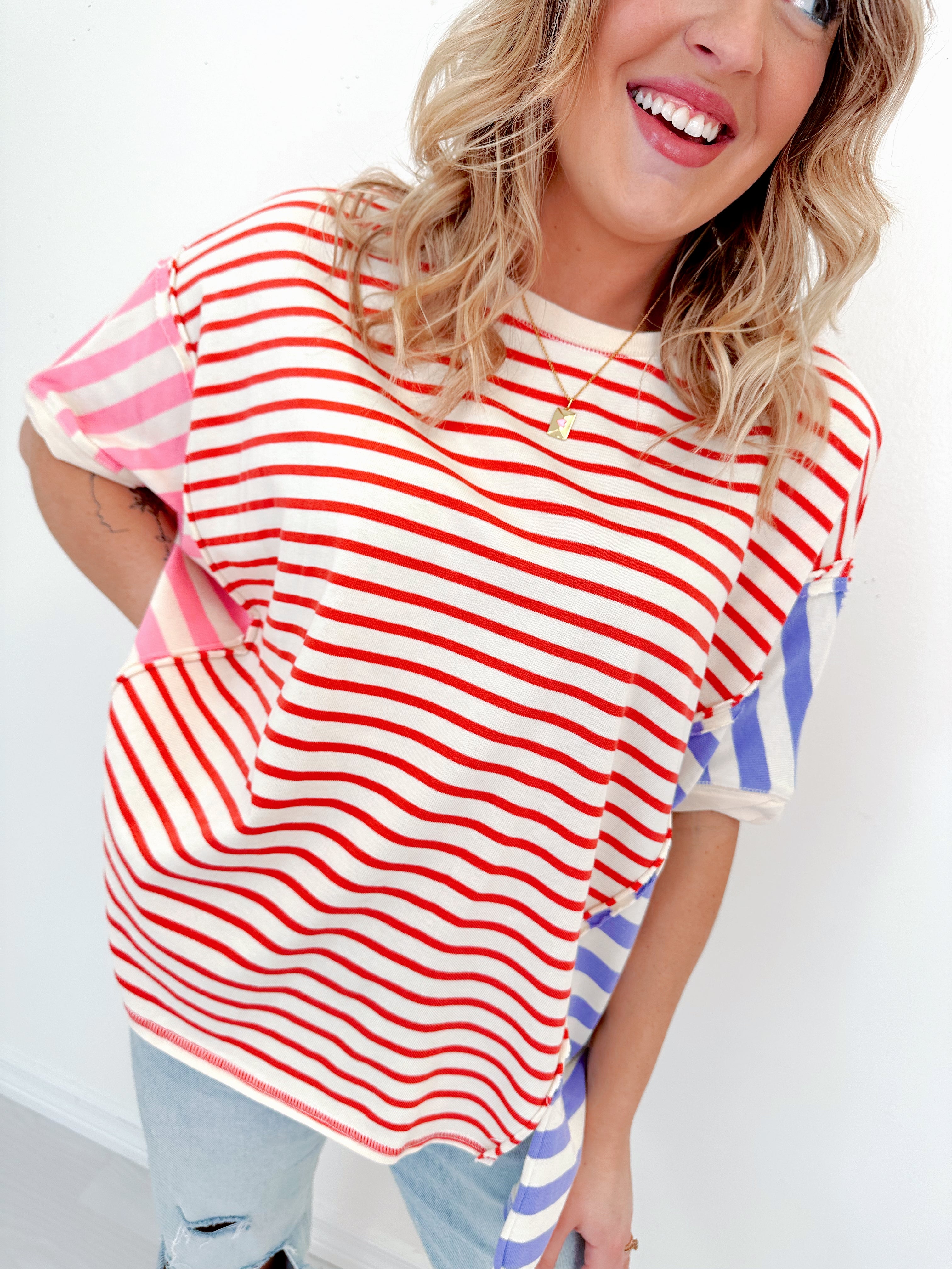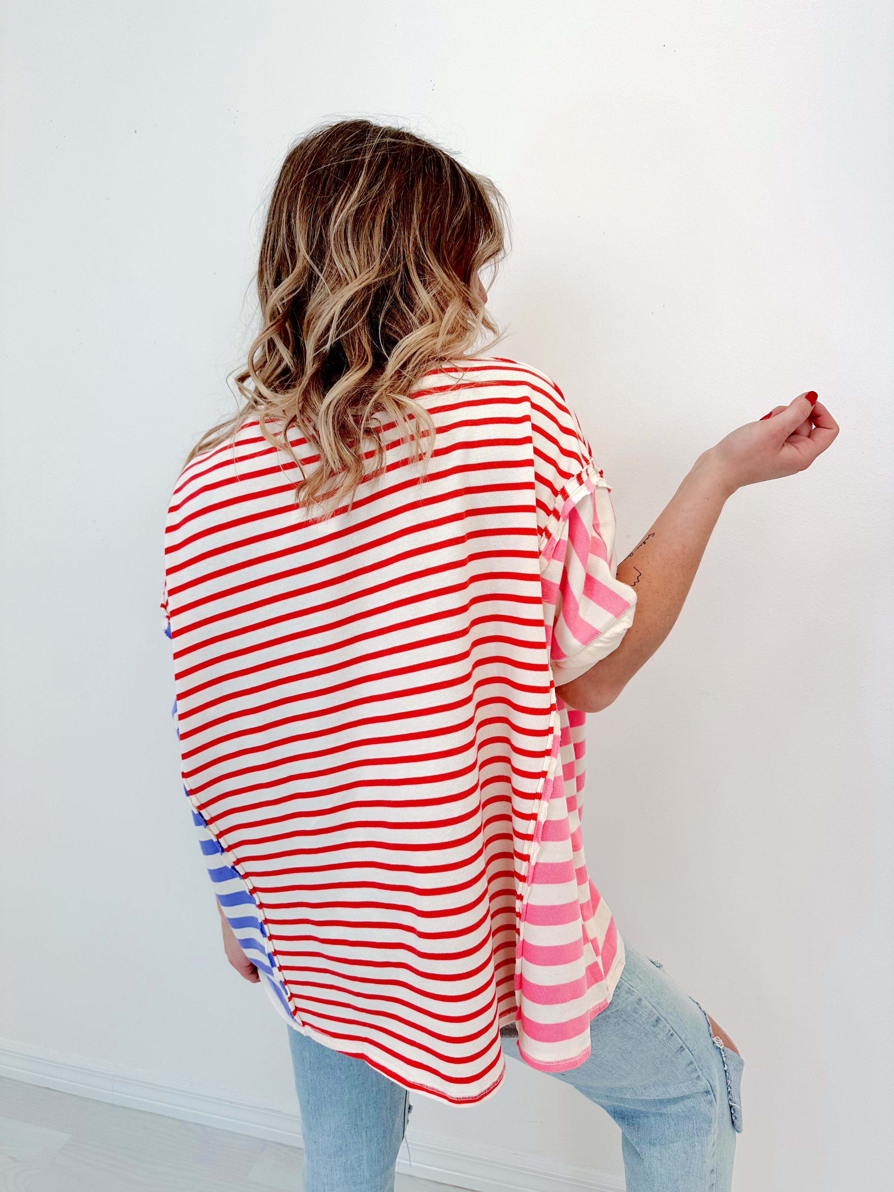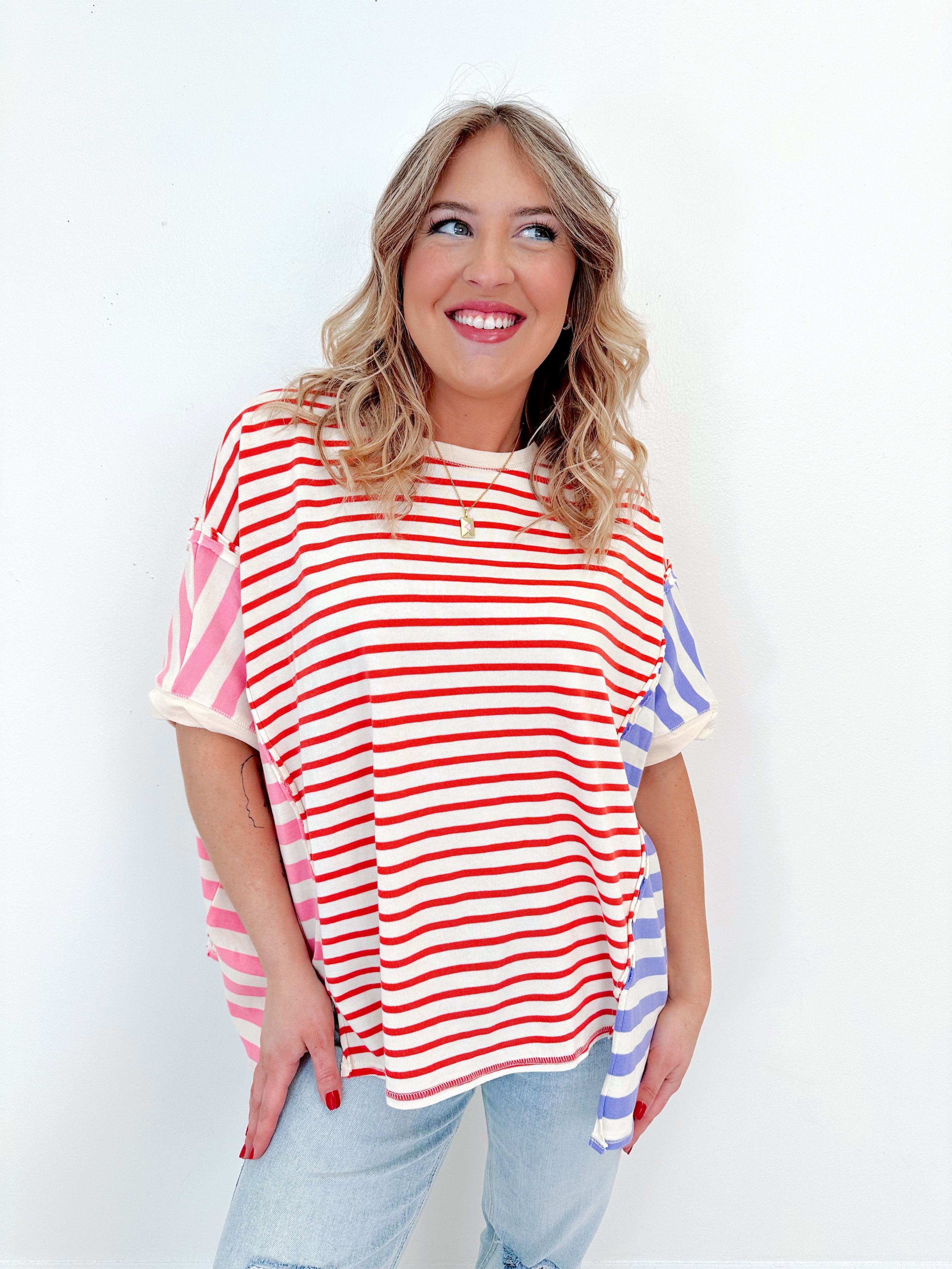 - Featuring a super soft striped fabric, a round neck, a drop shoulder short sleeve, a side slit contrasting hi-low hem, reverse seam detailing throughout, and is completed with a colorblock design of both a bold pink and purple horizontal striped pattern and a thinner red and white striped pattern.
