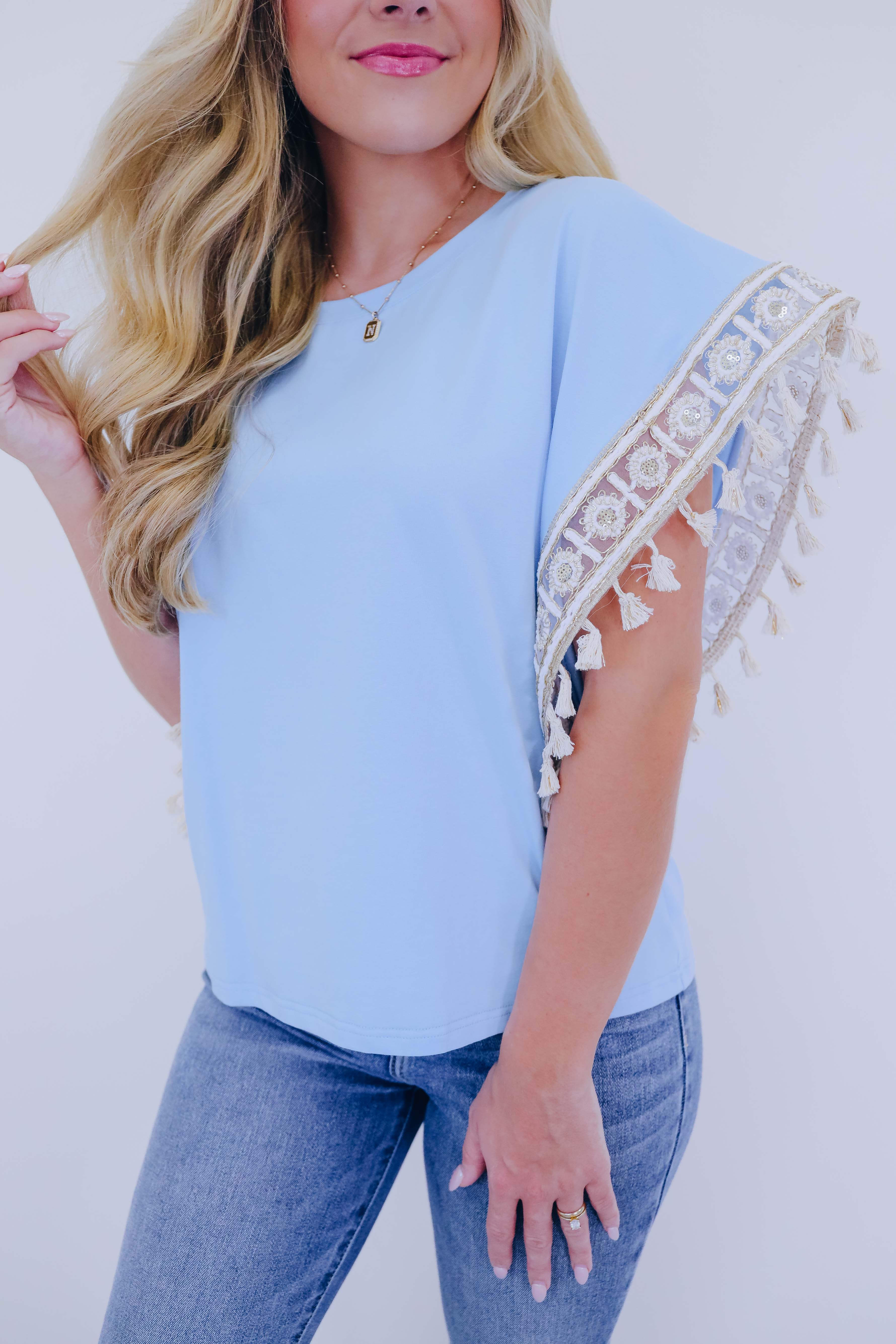 - Features a soft solid body fabric, a round neck, a short dolman sleeve with a mesh embroidered sequin tassel trim adorning the edge, and a straight hem.