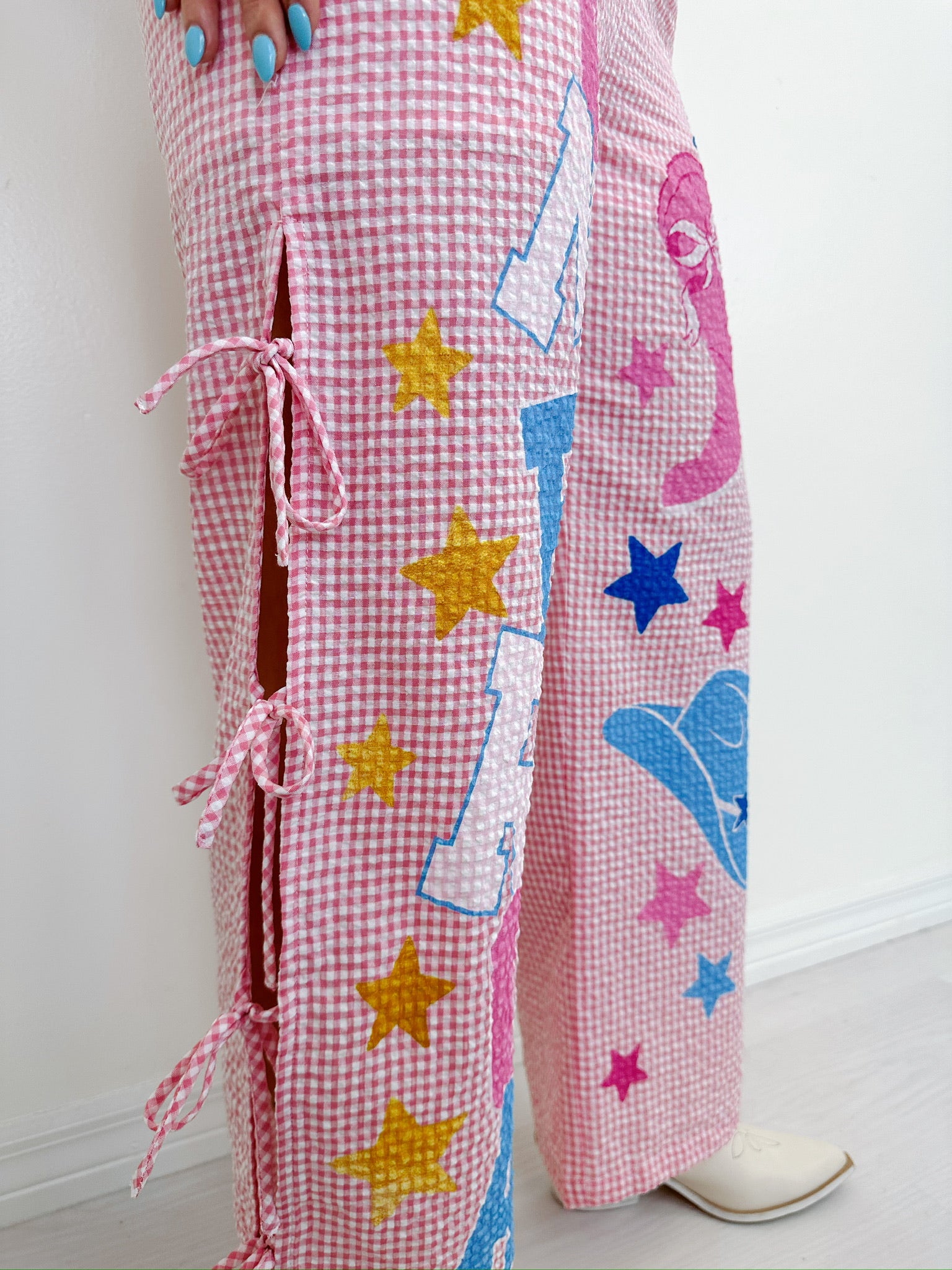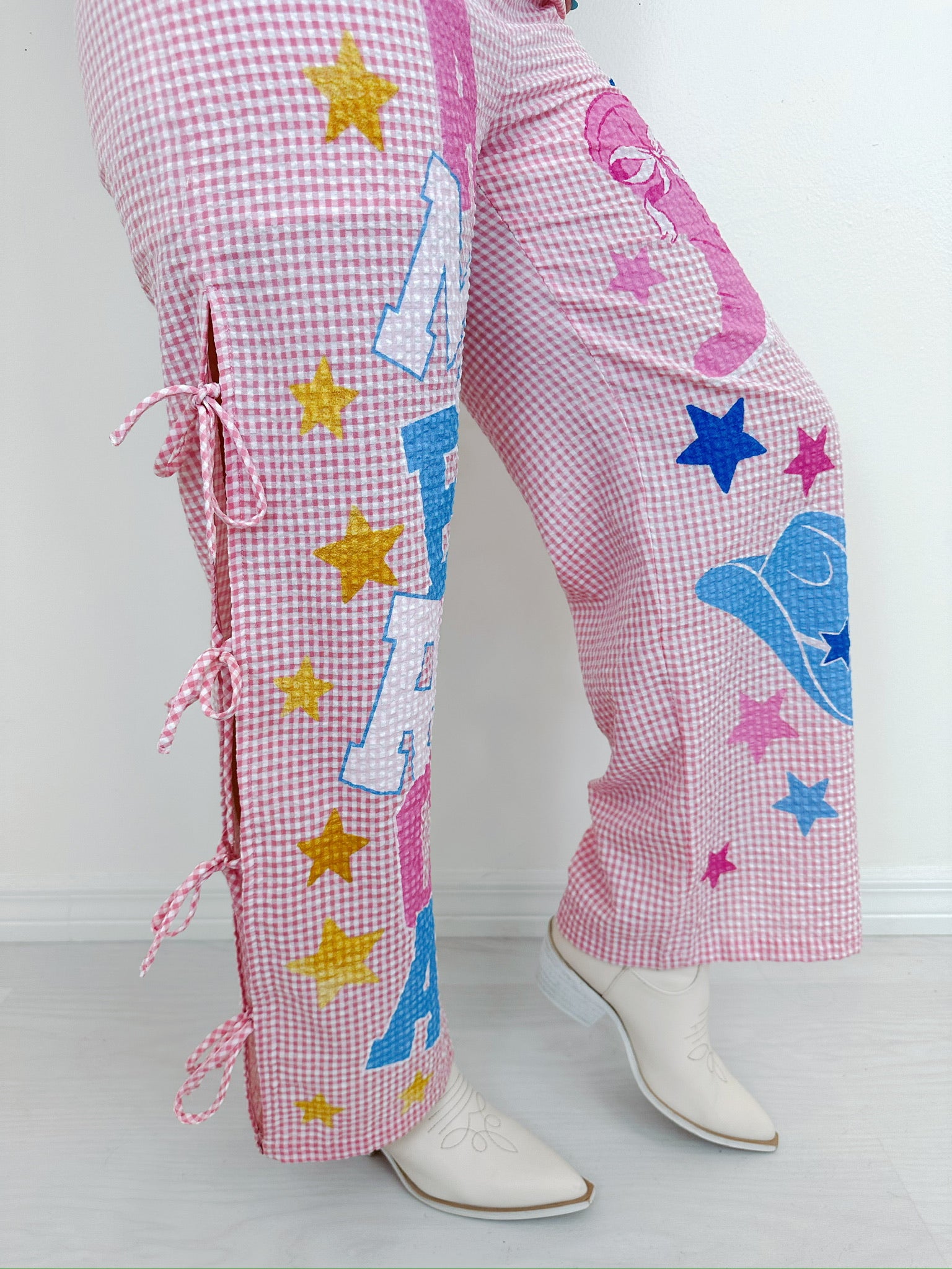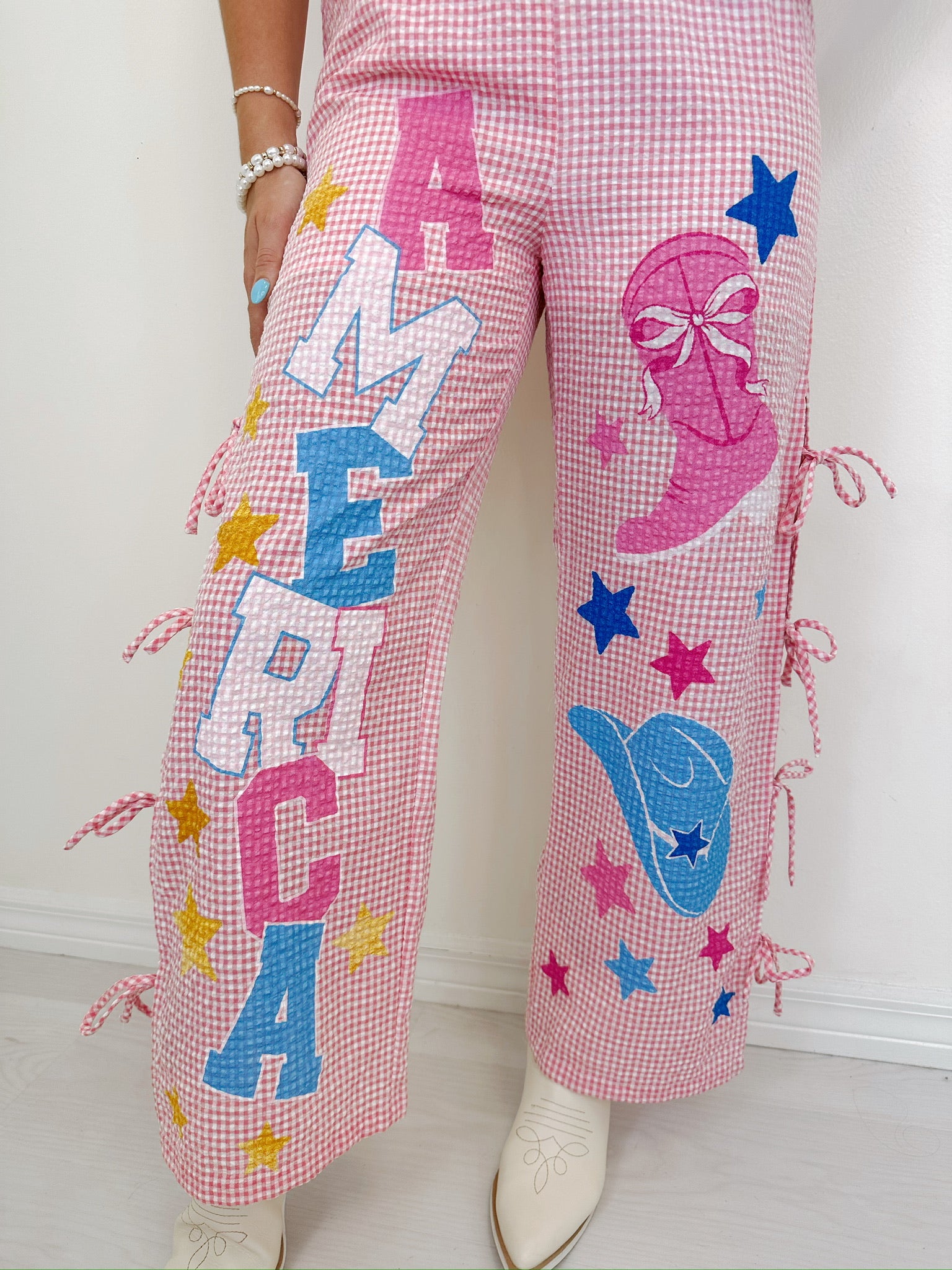 - Featuring a pink and white gingham fabric with "America" graphics, stars boots and hats, n pastel pinks and blues, an elastic waist, and a side cutout with self-tie bows running down the wide leg.