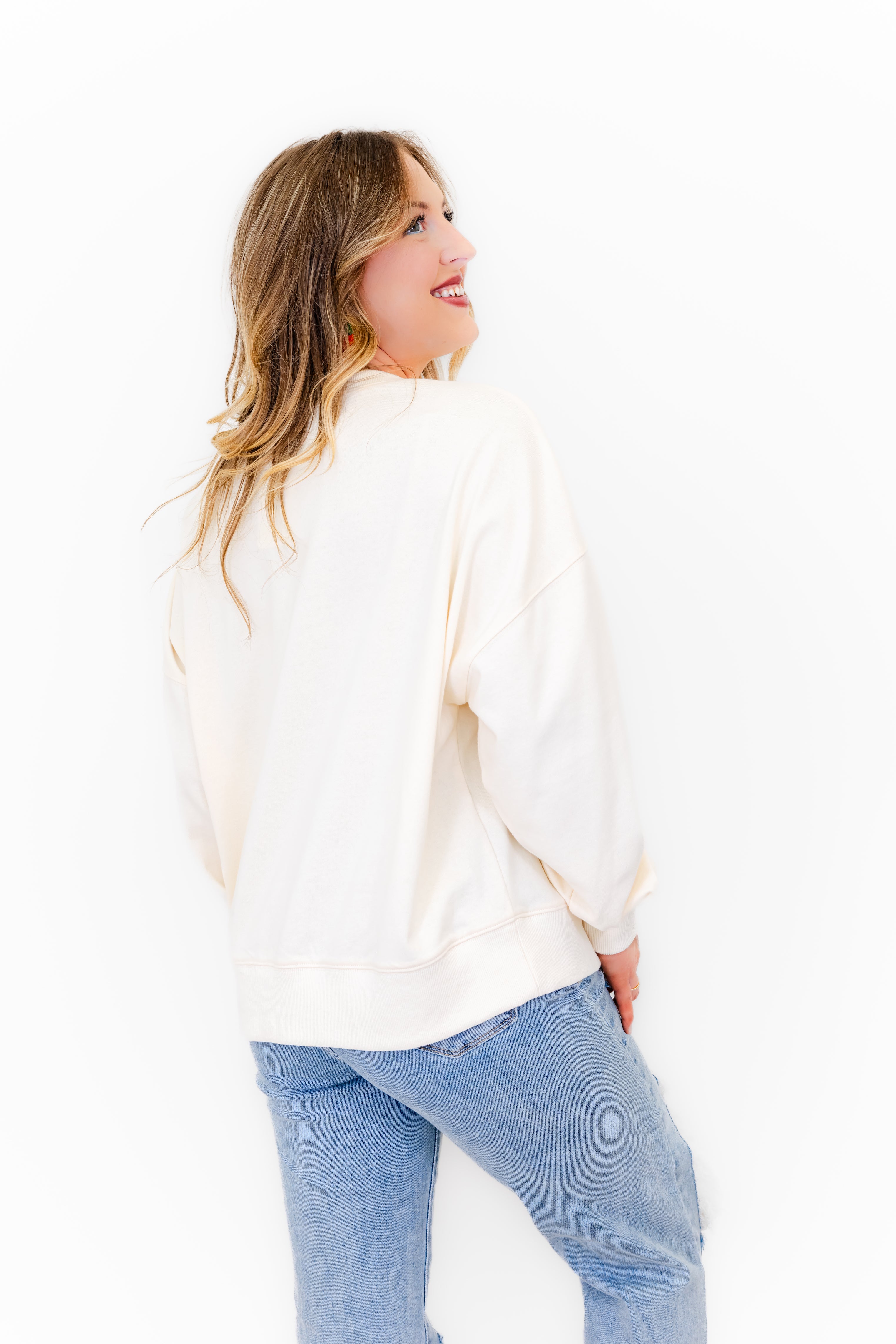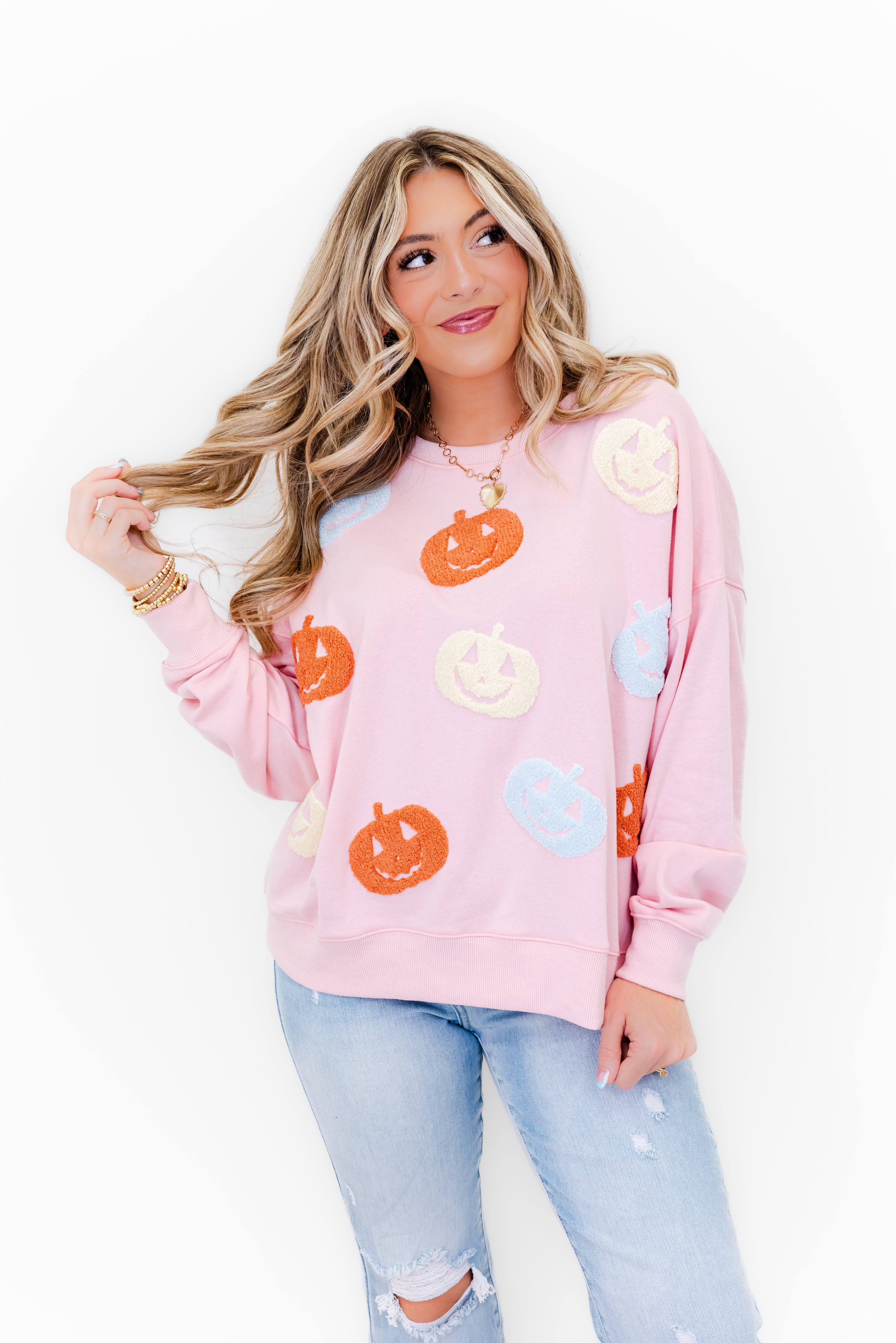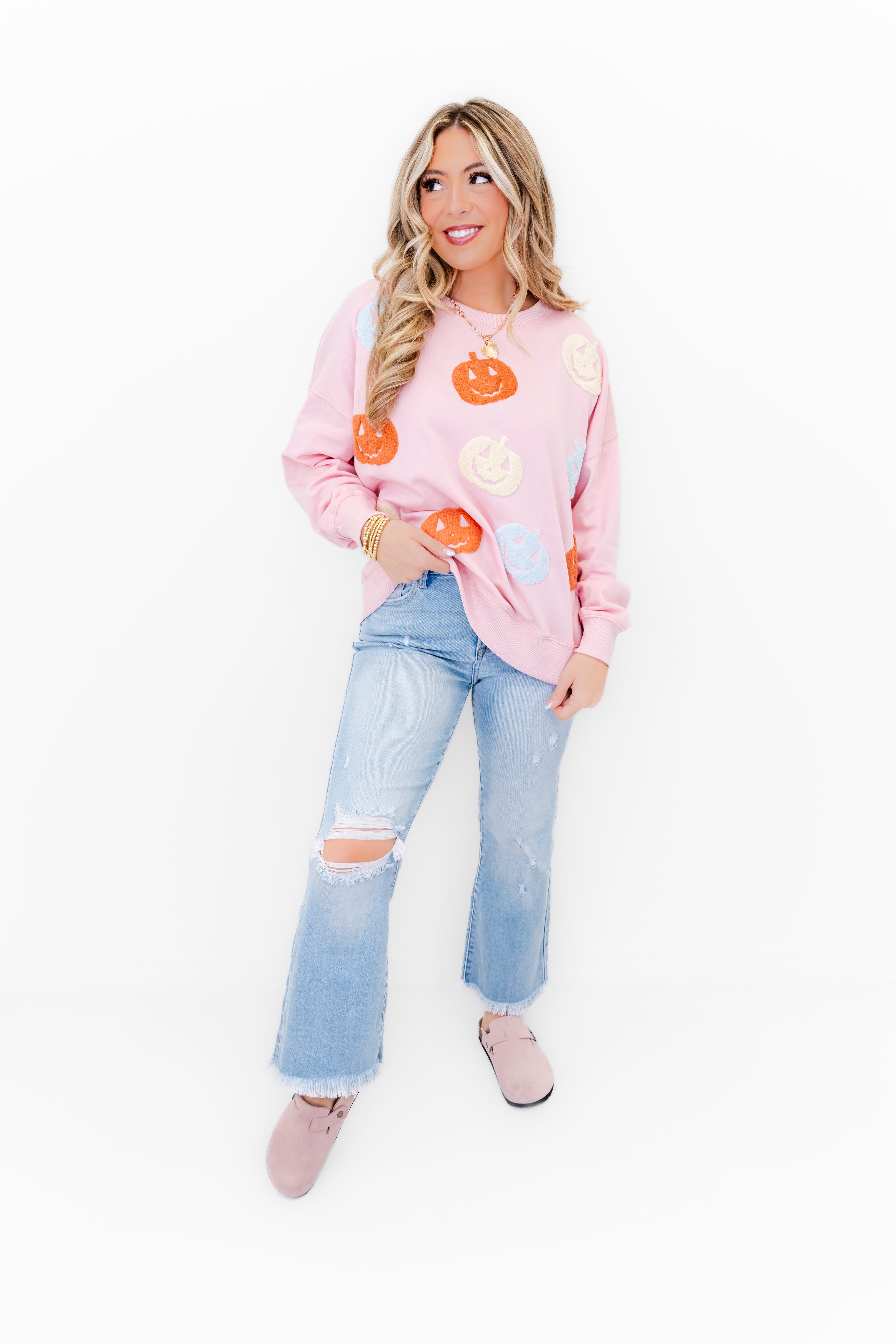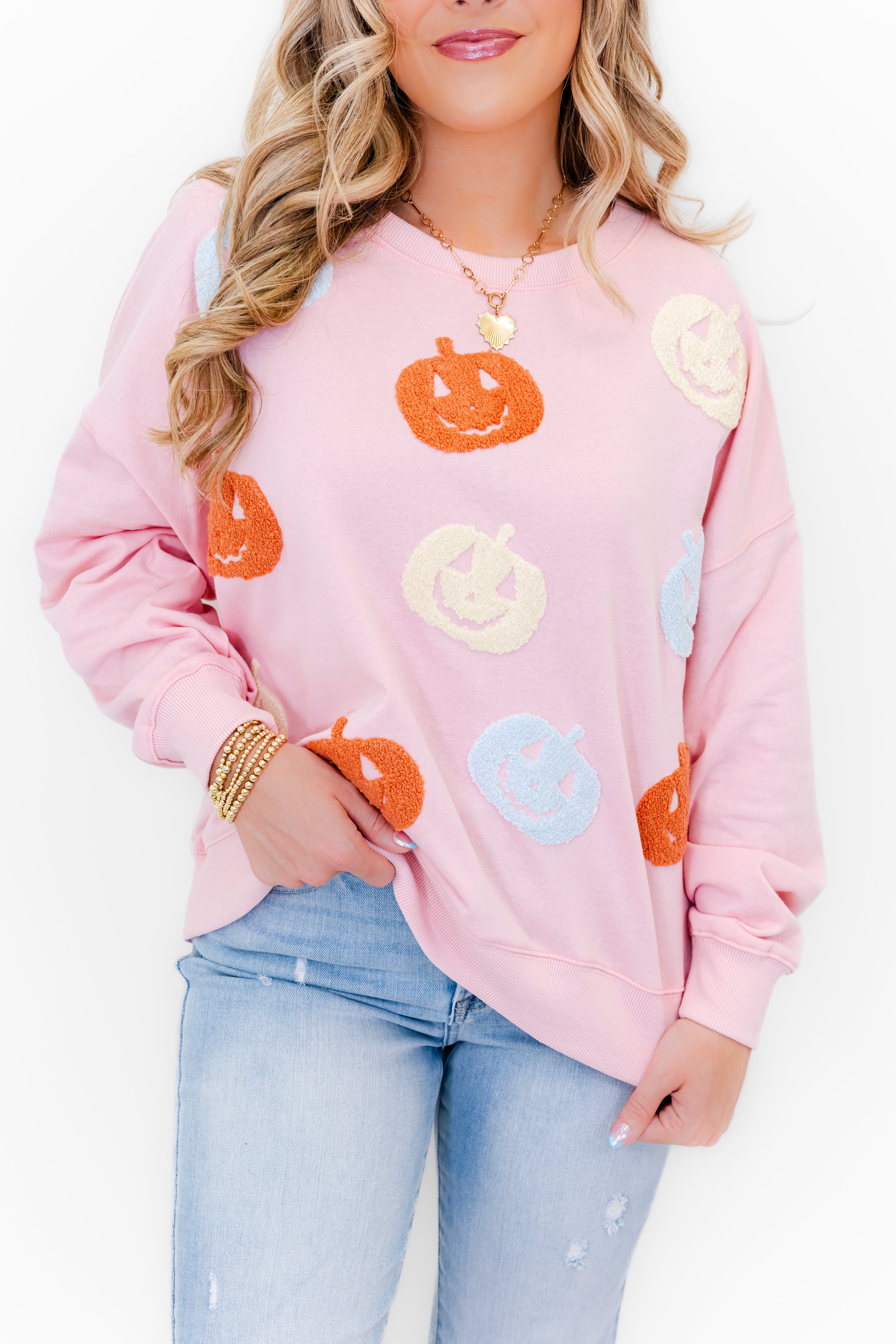 - Featuring a soft jersey knit fabric, a ribbed crew neck, drop shoulder long sleeves, a full length body, a straight banded hem, and is completed with pastel chenille pumpkins adorning the front of the shirt.