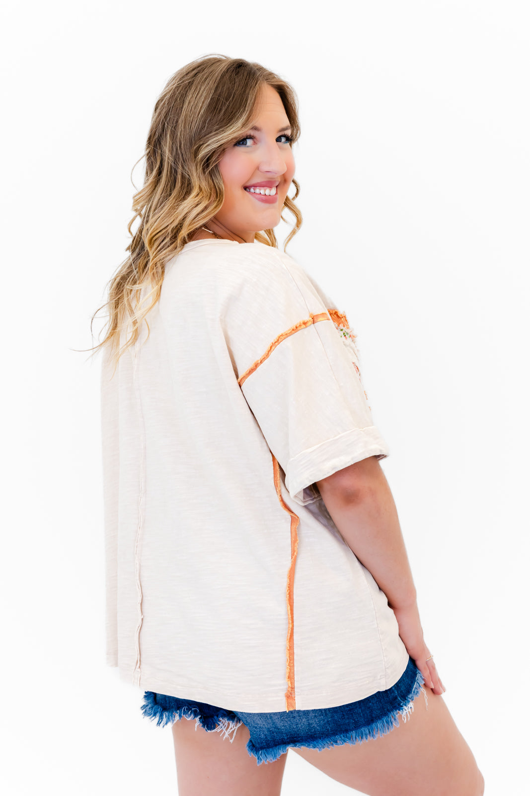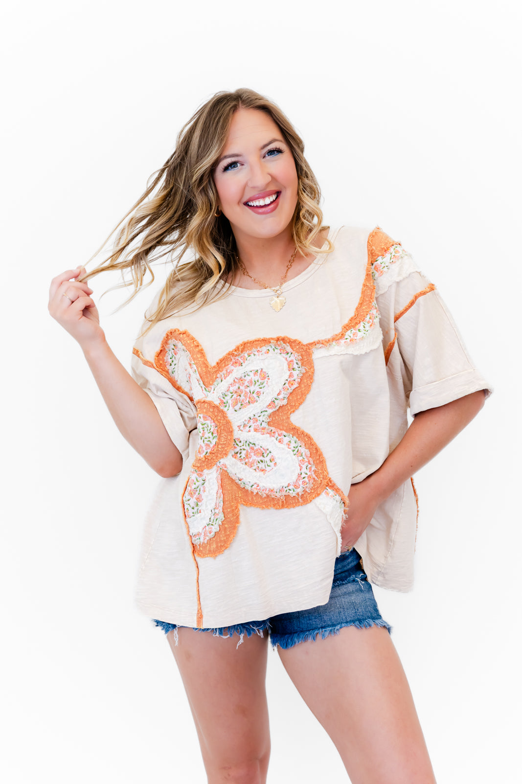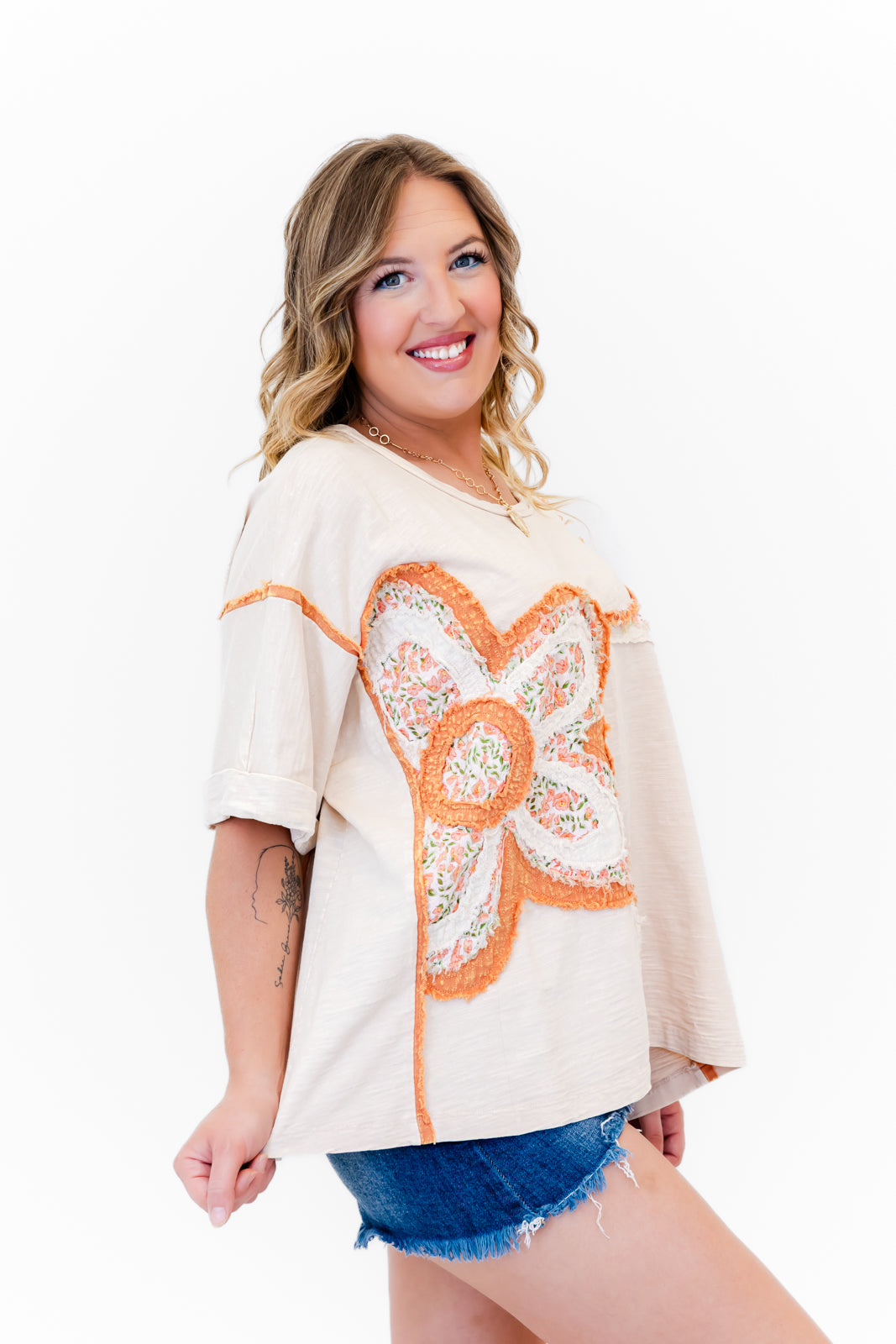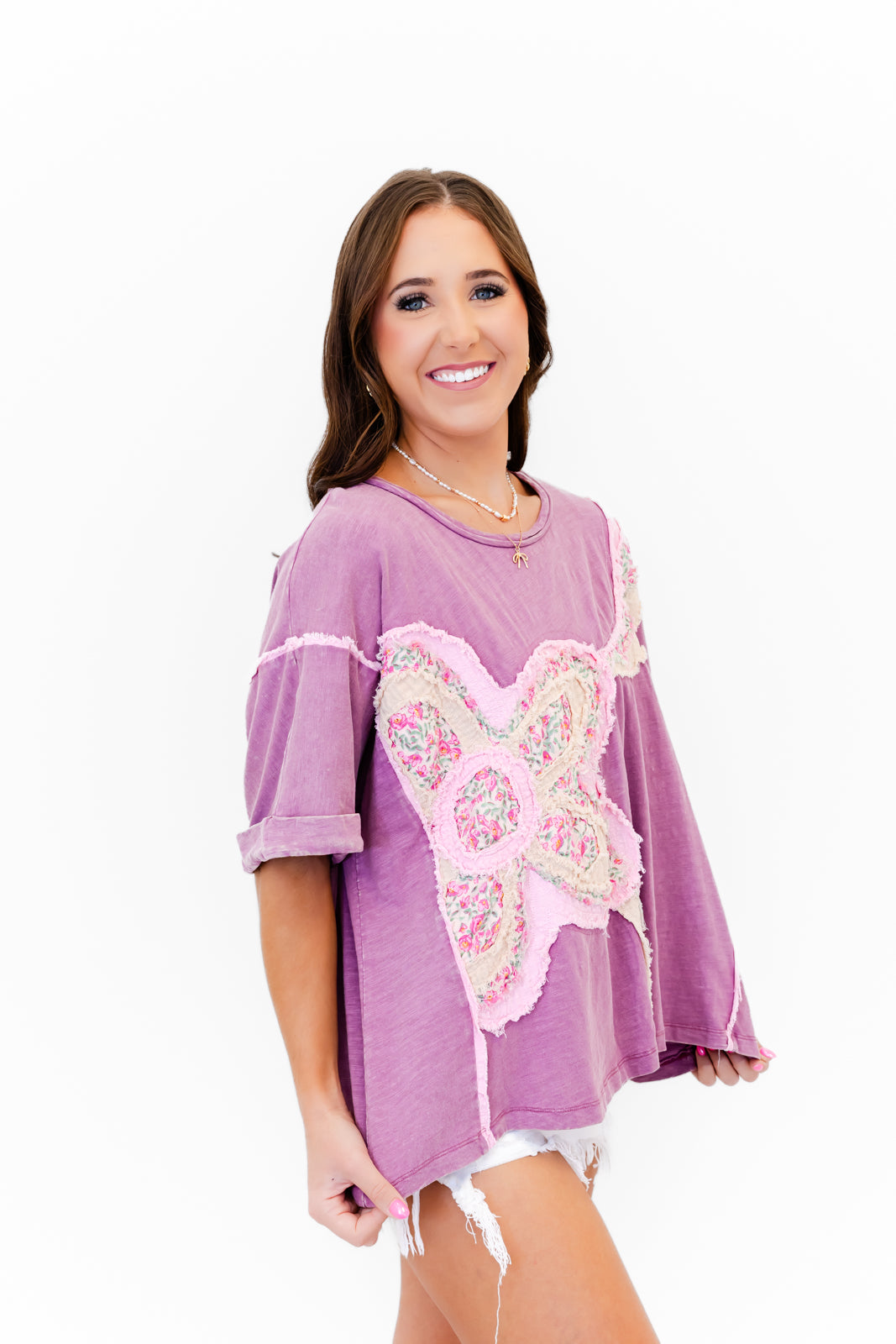 - This tee features a super soft cotton fabric with a round neck, flowy short drop shoulder sleeves, a roomy oversized silhouette, a floral quilted patch design with raw edge details around the shoulders and both sides of the shirt.