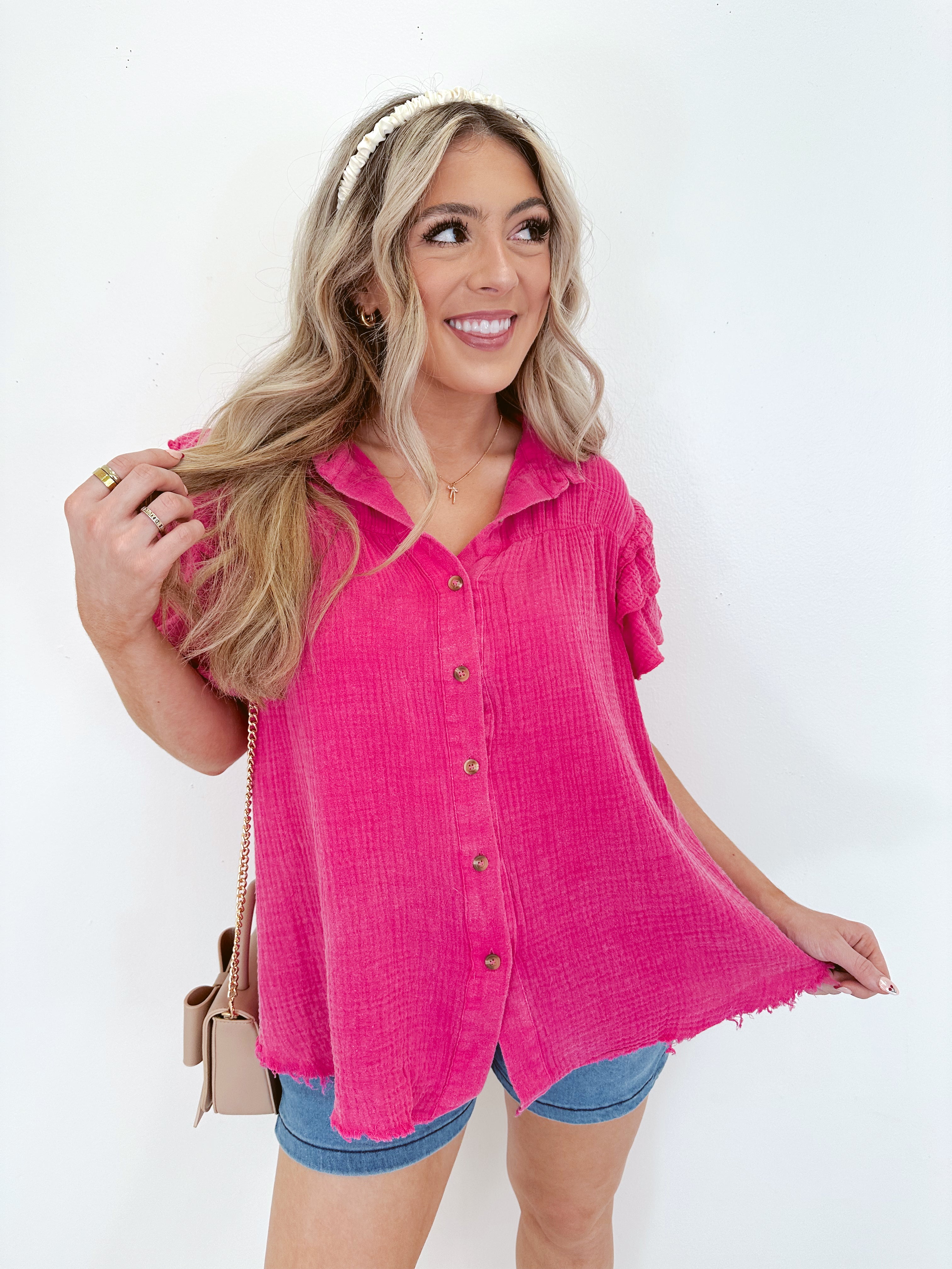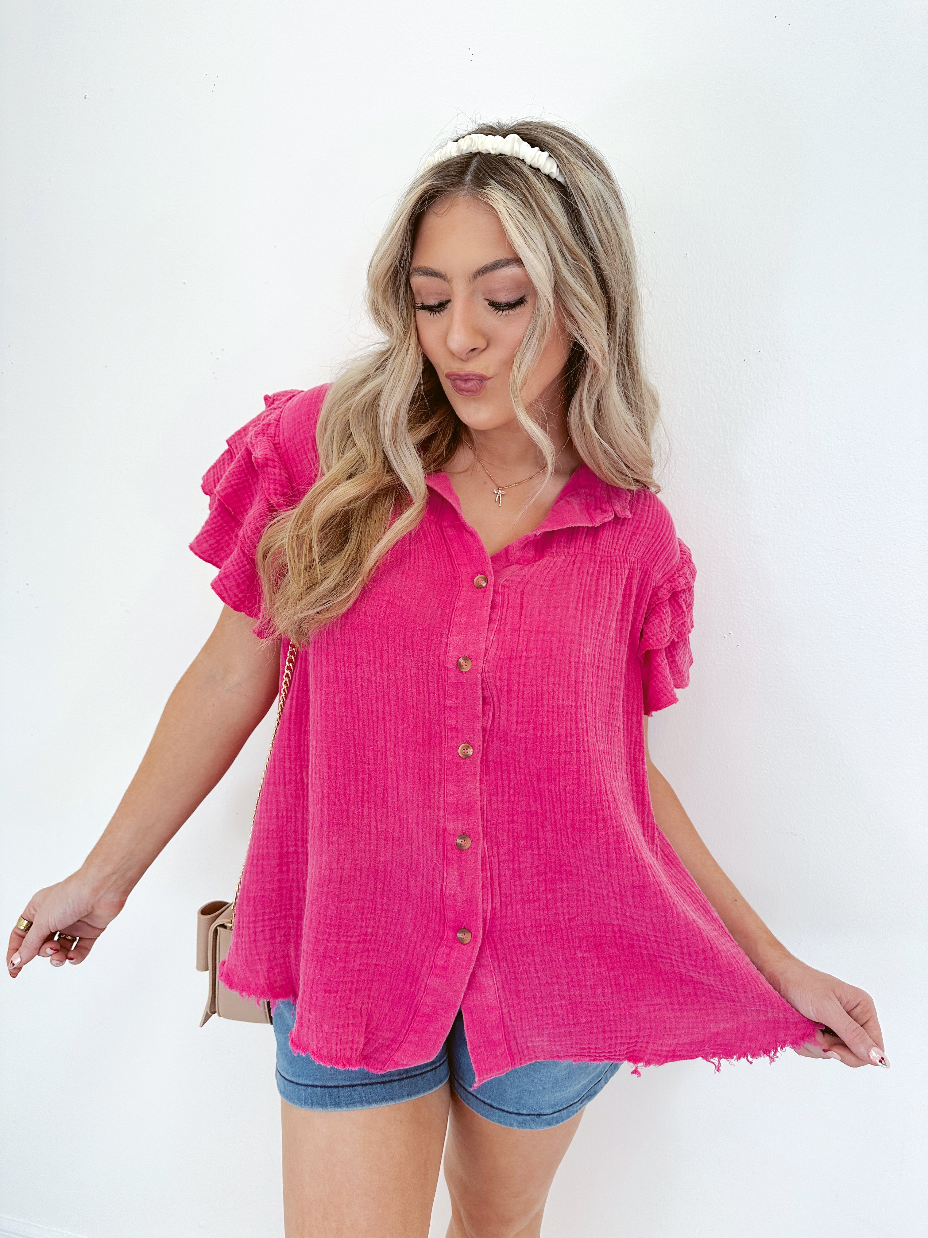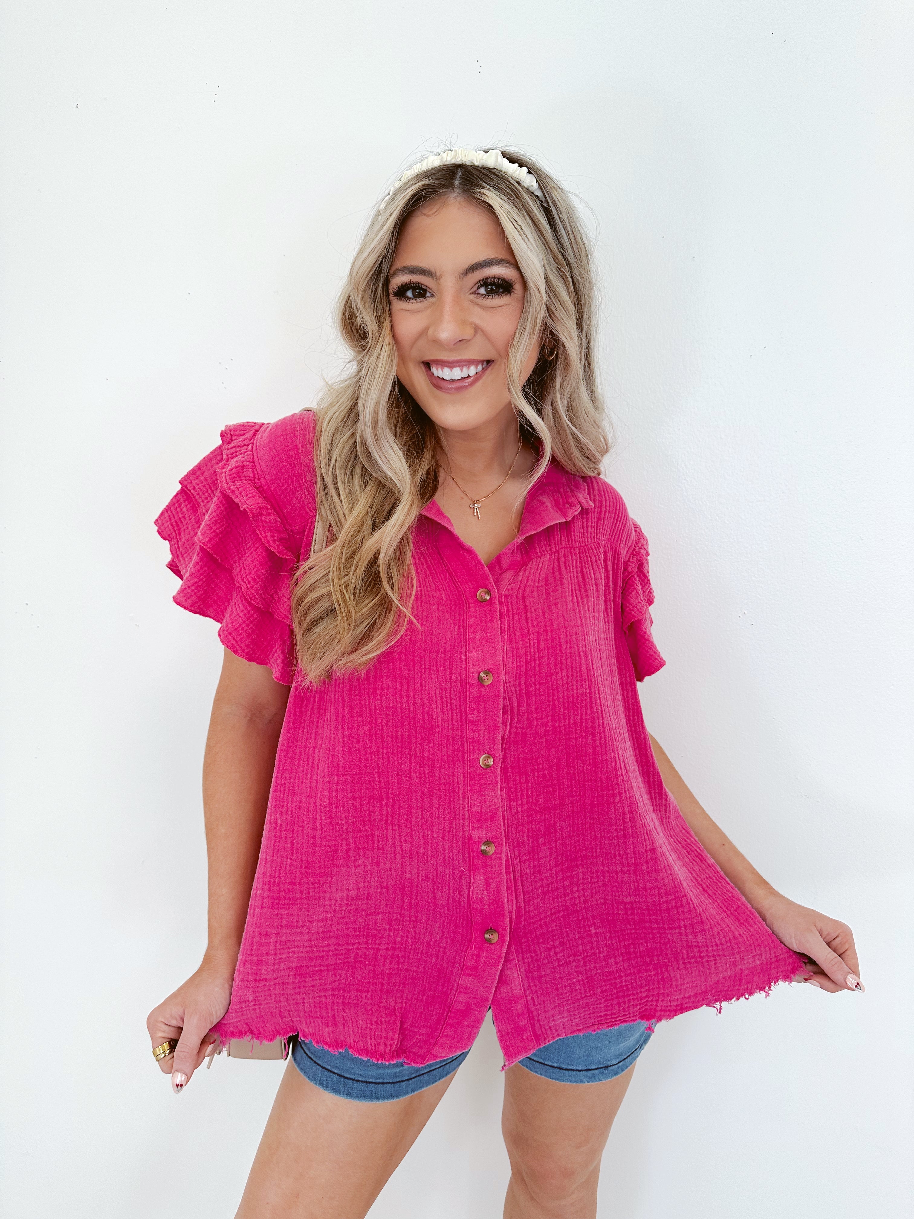- Featuring a solid color textured gauze fabric, a ruffled mock neck with button down front, short tiered ruffled sleeves, a seam detail yoke, raw edge details, and a raw edge rounded hem.