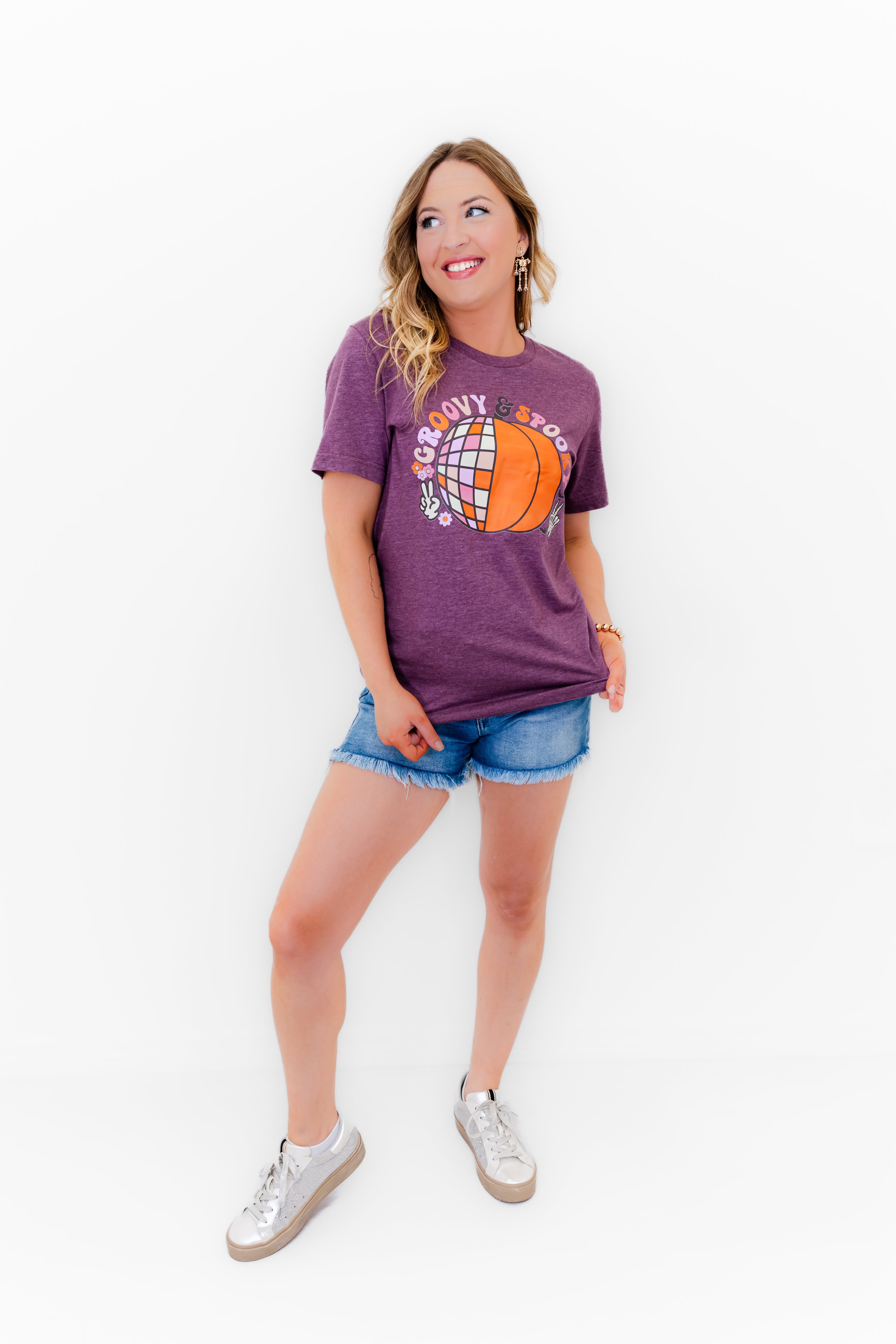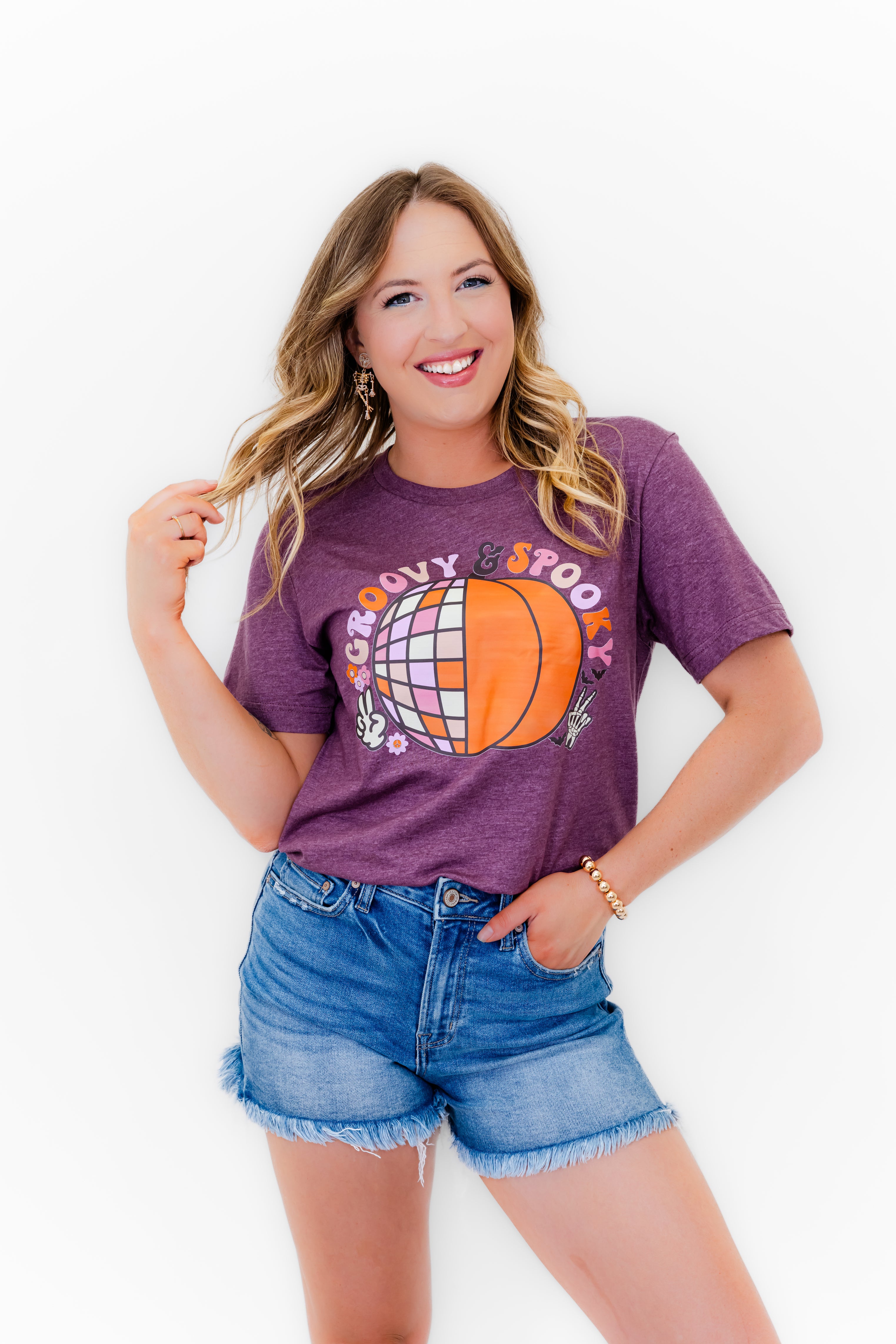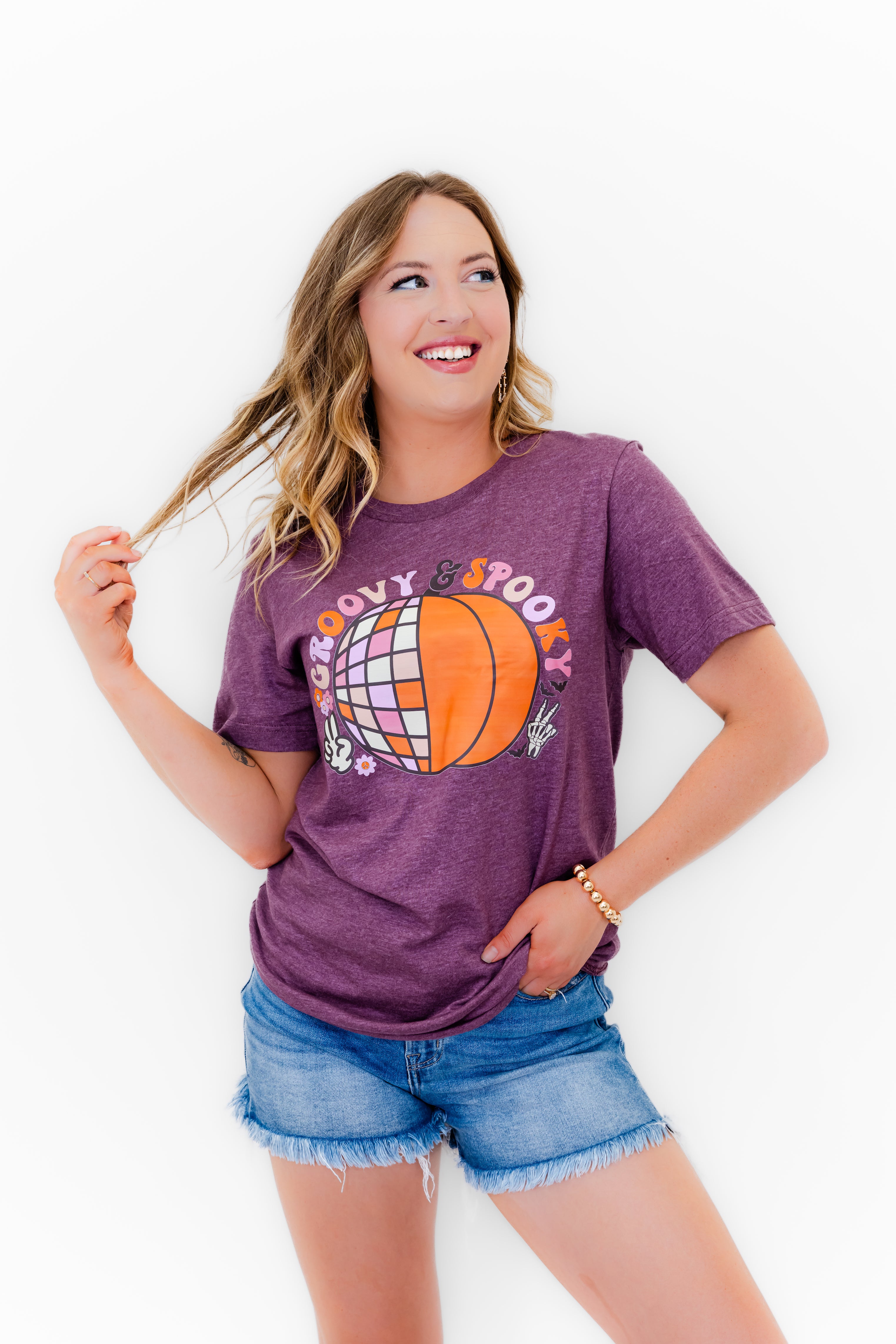 - Our new "Groovy & Spooky" Graphic Tee is super trendy and will be perfect for adding a unique pop of color to your Fall wardrobe. Style over a plaid shacket for an evening bon-fire with friends.