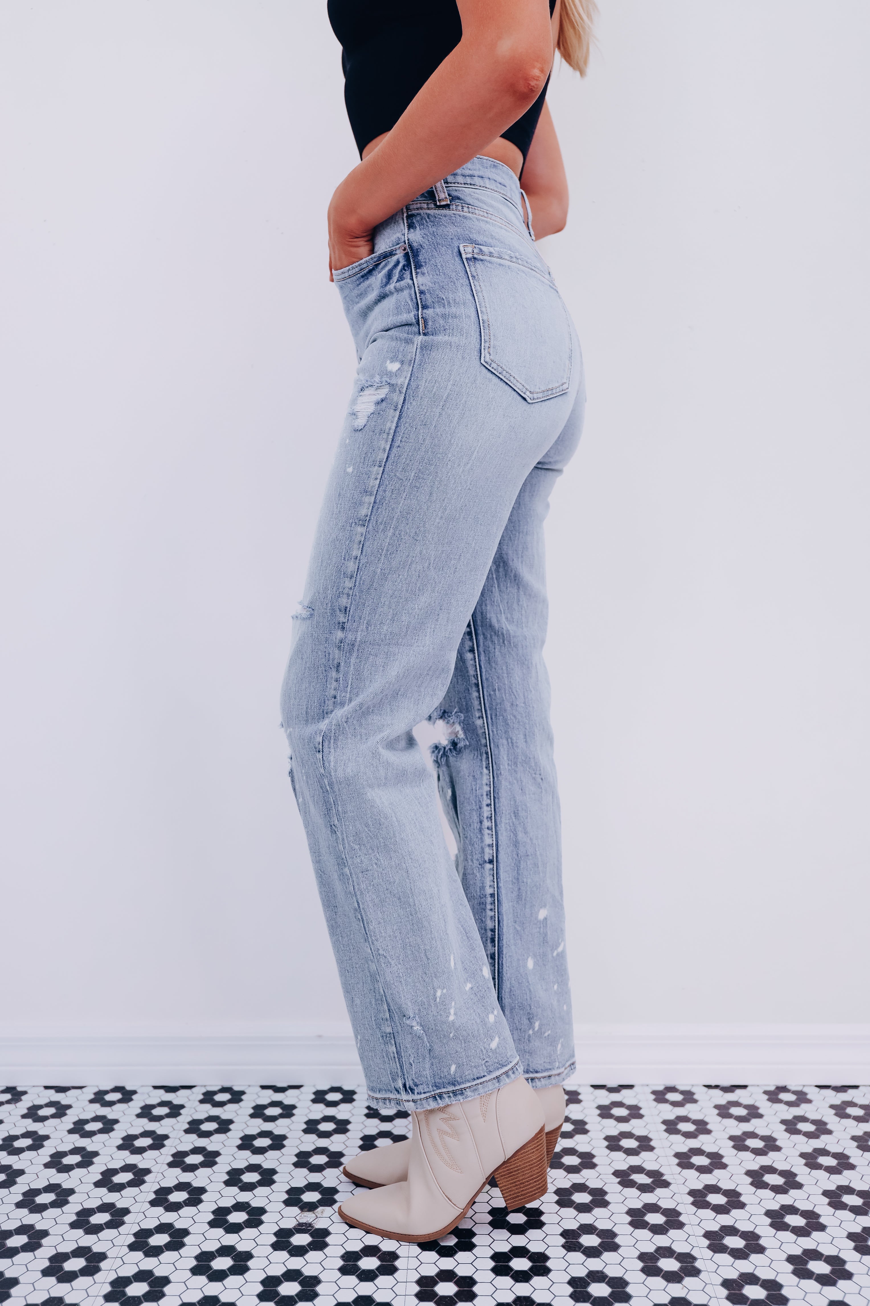 - Features a classic five pocket design, super high-rise waist, light wash with bleach splatters and a distressed detail, button and zip closure, and a straight leg silhouette.